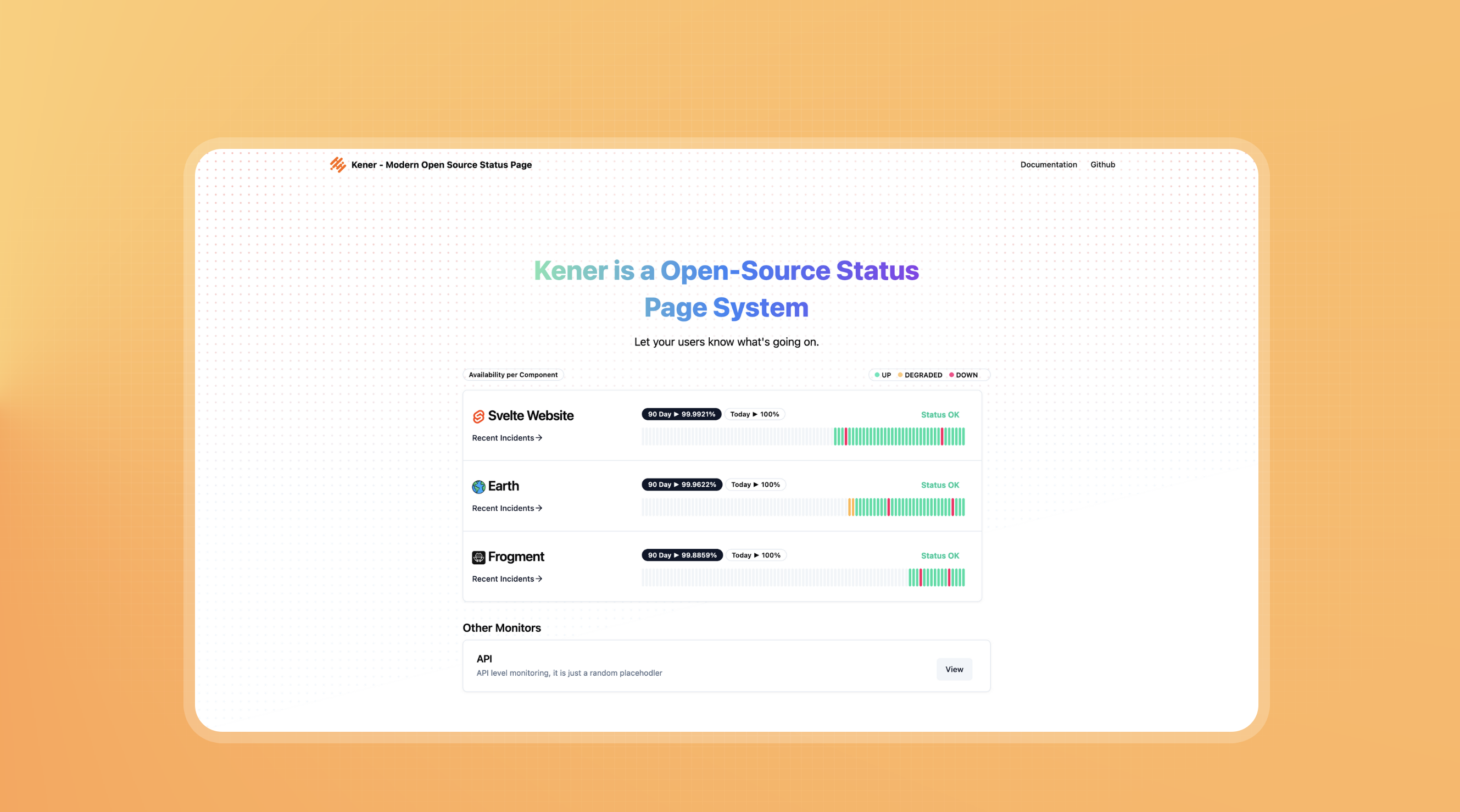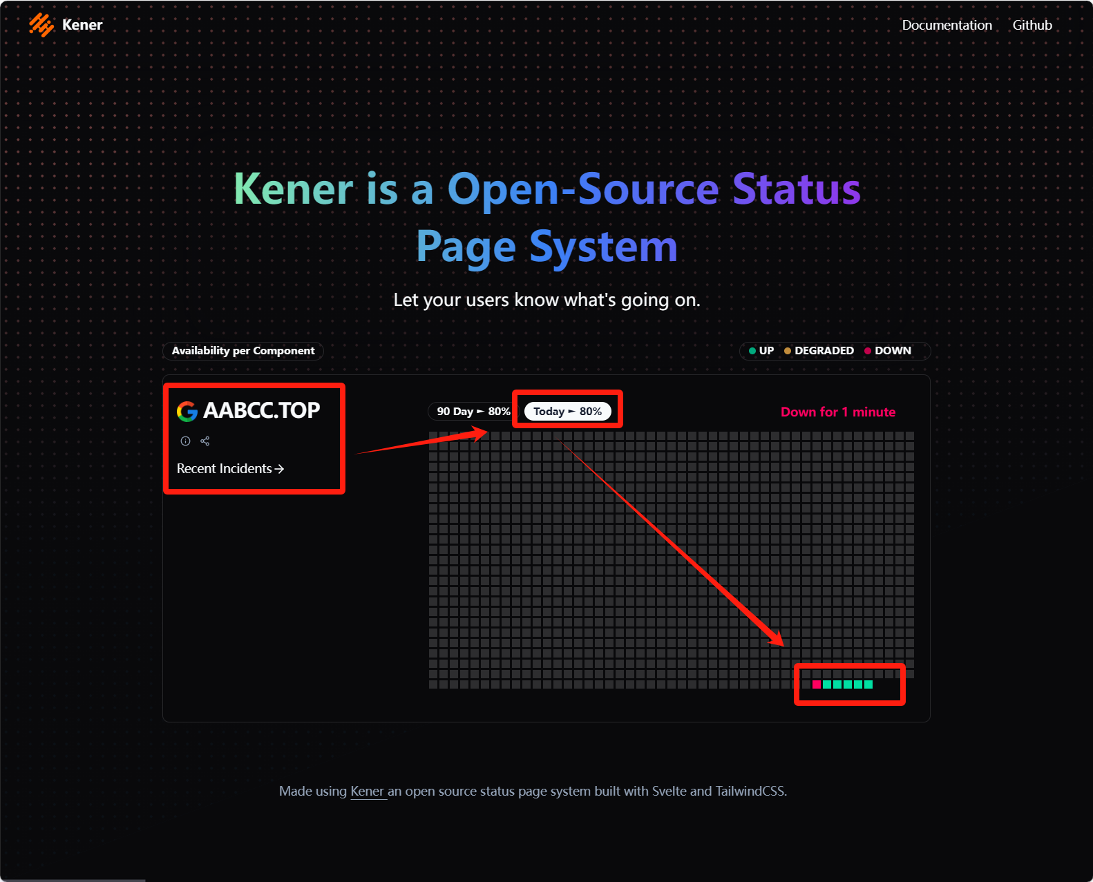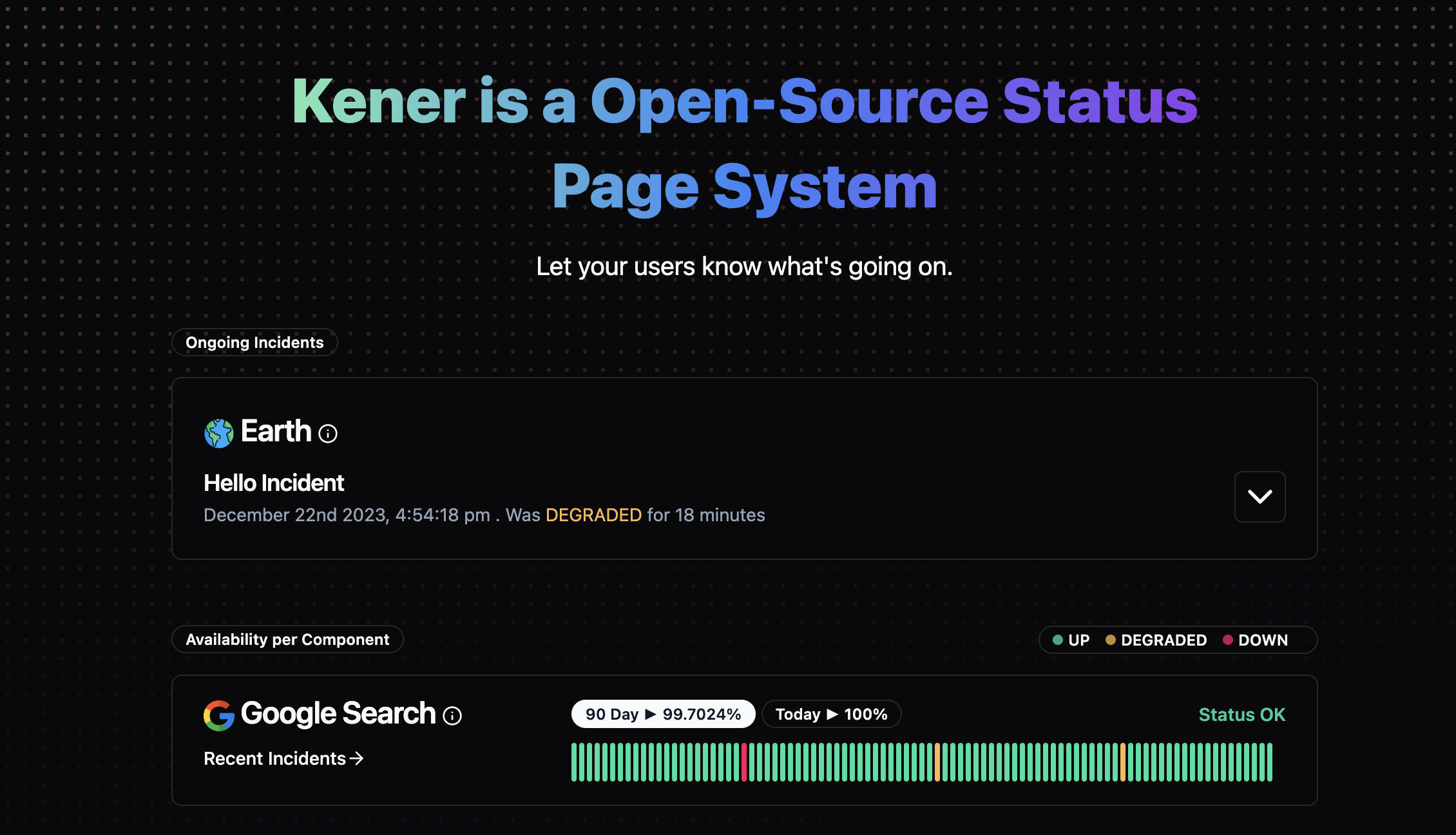 Kener:开源Node.js状态页面工具,旨在使服务监控和事件处理变得轻而易举。它提供了一个时尚且用户友好的界面,可简化跟踪服务中断并改善我们在事件期间的通信方式。最好的部分是什么?Kener 与 GitHub 无缝集成,使事件管理成为团队的工作,使我们能够更轻松地在协作和友好的环境中一起跟踪和解决问题。