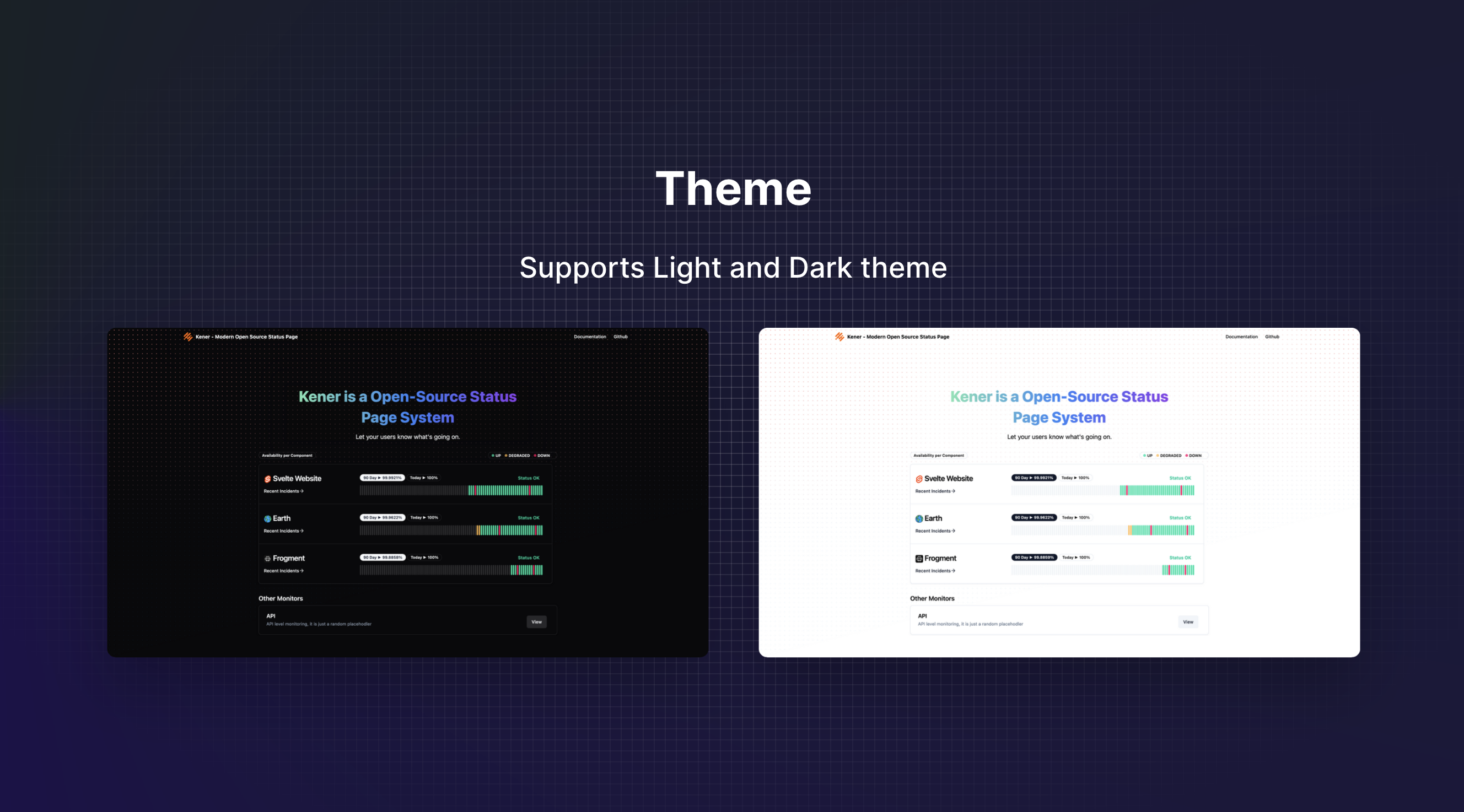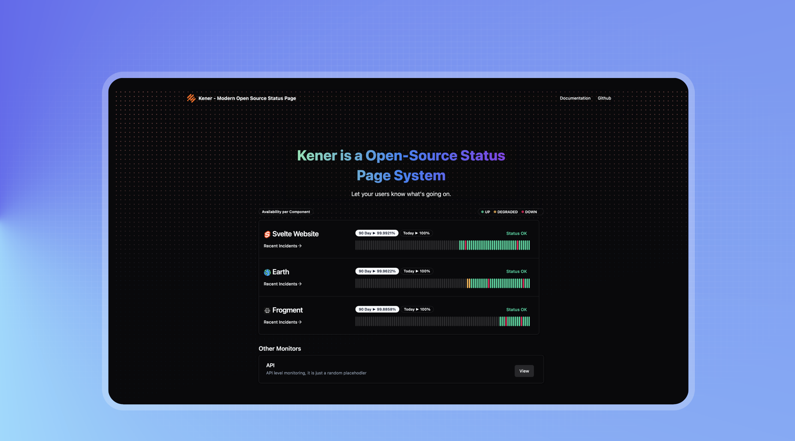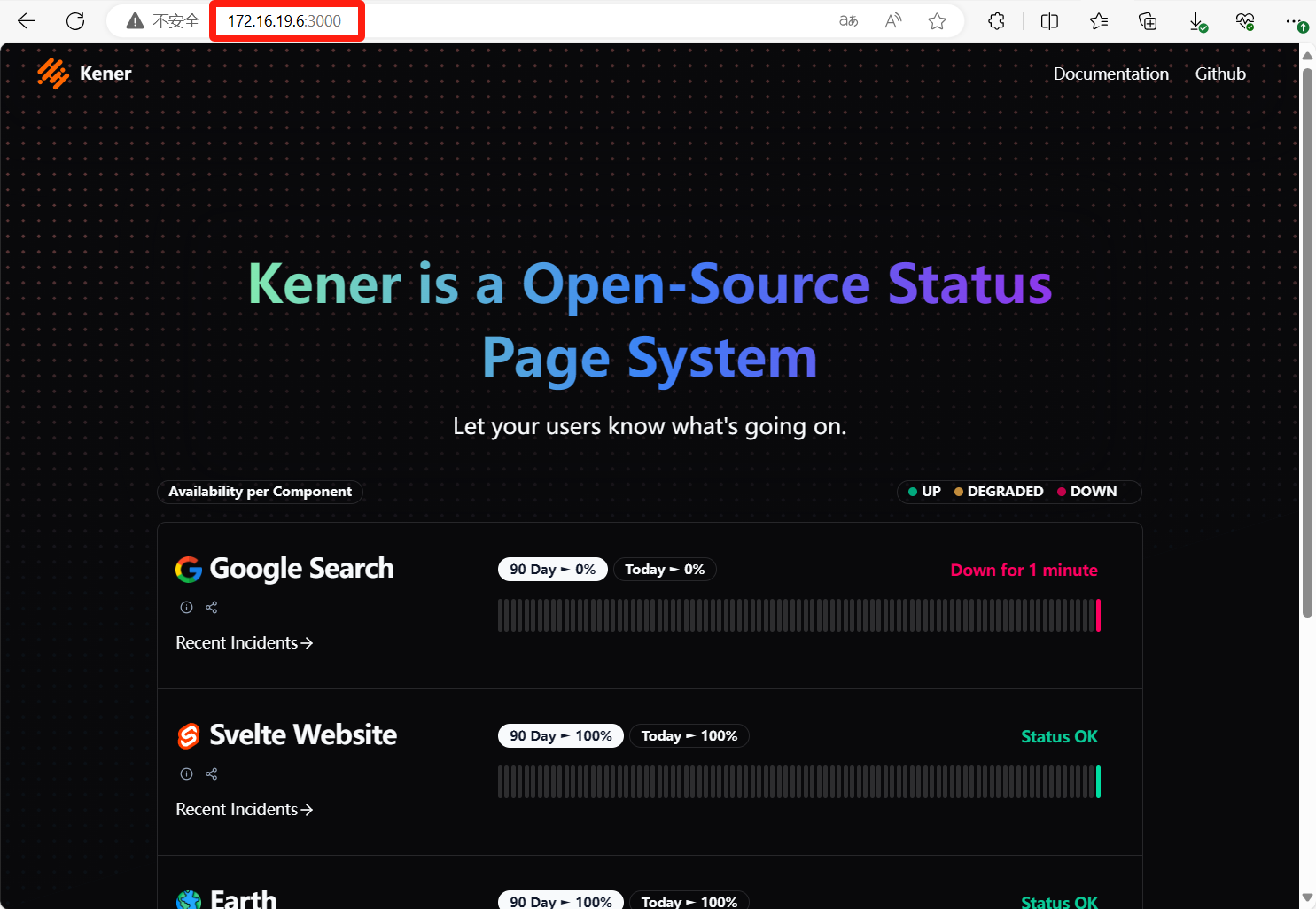 Kener:开源Node.js状态页面工具,旨在使服务监控和事件处理变得轻而易举。它提供了一个时尚且用户友好的界面,可简化跟踪服务中断并改善我们在事件期间的通信方式。最好的部分是什么?Kener 与 GitHub 无缝集成,使事件管理成为团队的工作,使我们能够更轻松地在协作和友好的环境中一起跟踪和解决问题。