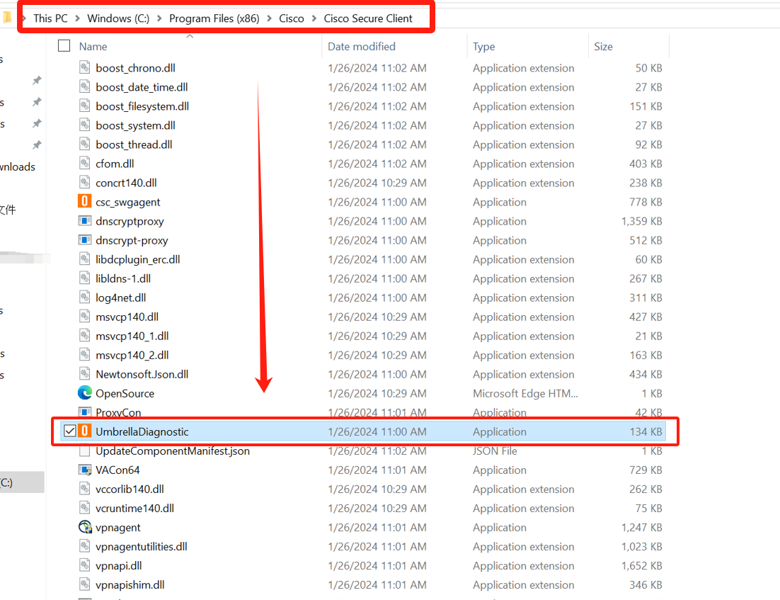 下面为完整操作步骤记录Microsoft Windows [Version 10.0.19044.4170] (c) Microsoft Corporation. All rights reserved. C:\Users\Support>cd C:\Program Files (x86)\Cisco\Cisco Secure Client C:\Program Files (x86)\Cisco\Cisco Secure Client>UmbrellaDiagnostic.exe --domain=www.baidu.com --silent C:\Program Files (x86)\Cisco\Cisco Secure Client>Running all tests... please wait... outputFile=C:\Users\Support\AppData\Local\Temp\tmp8EDB.tmp url=Diagnostic ID 1780199 Tests complete!诊断文件将自动保存到C:\Users\Support\AppData\Local\Temp\目录内(具体路径上面会显示,自己复制粘贴到文件资源管理器中访问即可。)