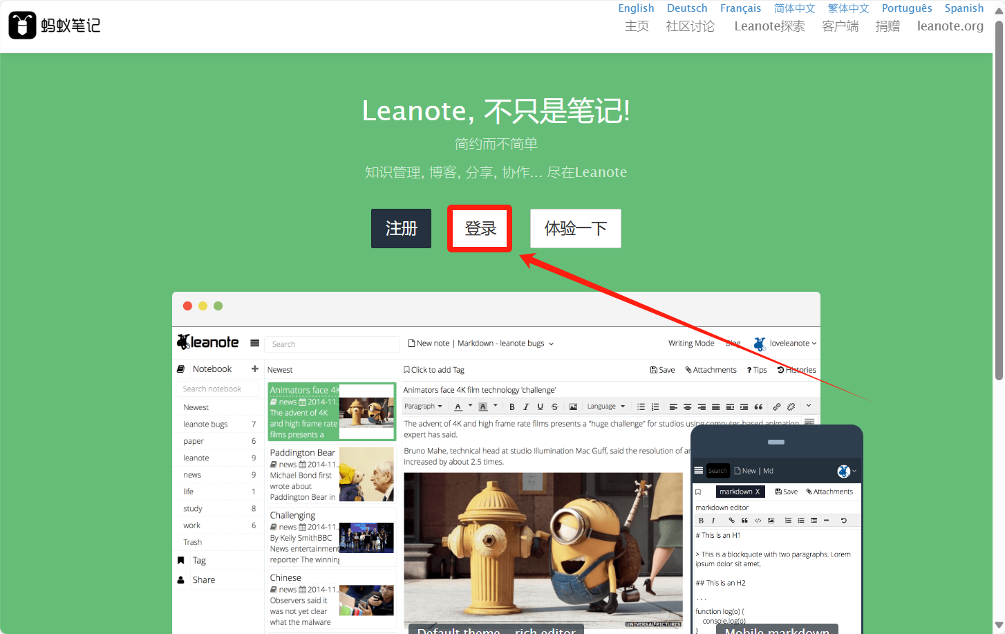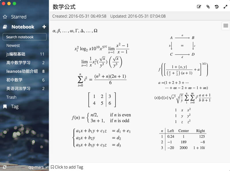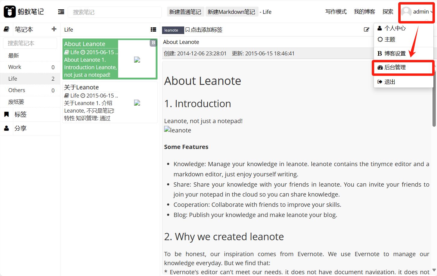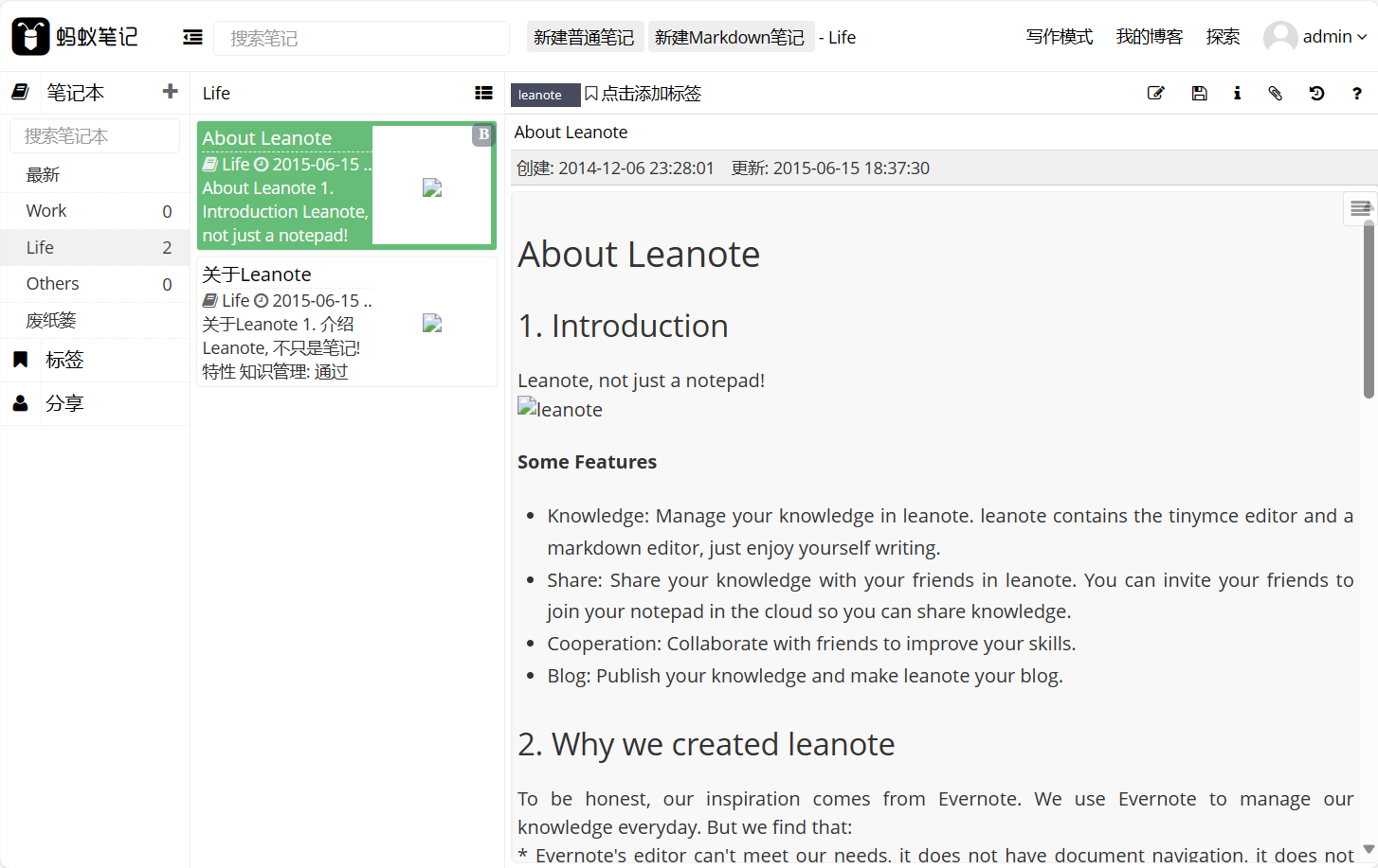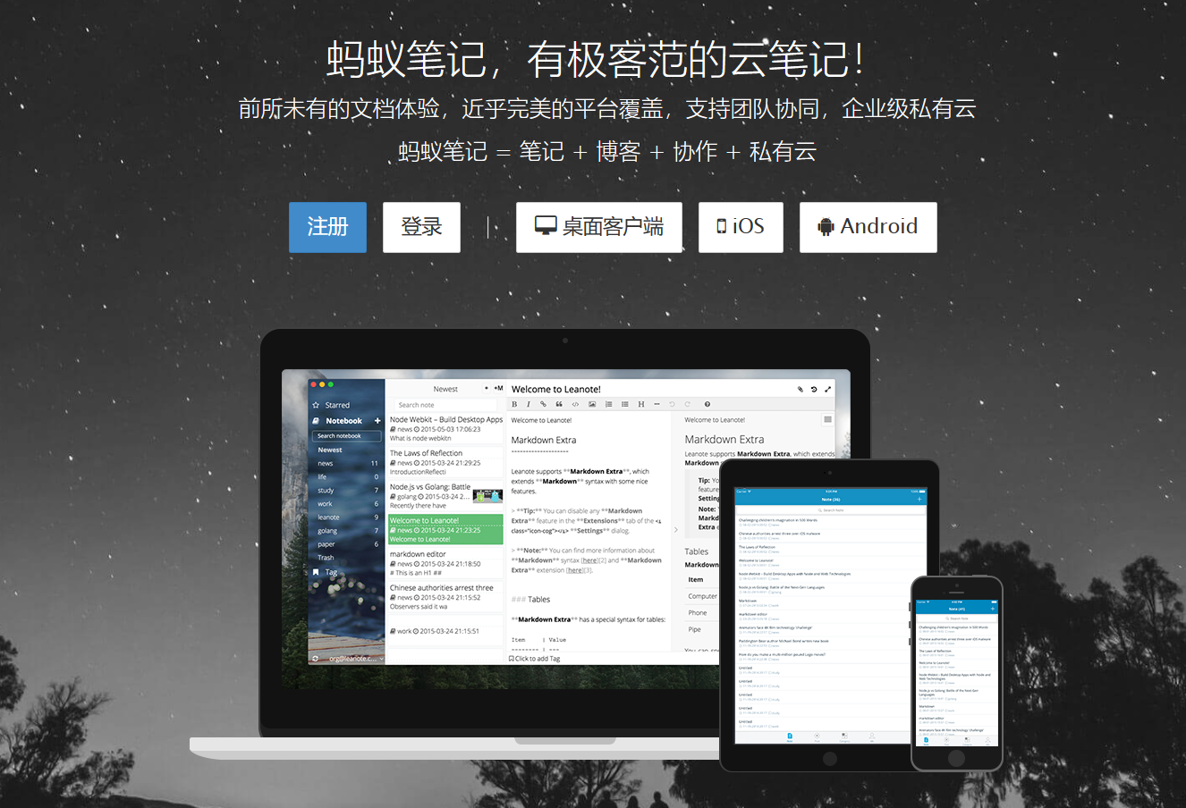 Leanote 蚂蚁笔记是一款国产开源的私有云笔记工具。它支持普通格式笔记、Markdown语法、专业数学公式编辑、和思维导图,并且支持vim&emacs等编辑模式。