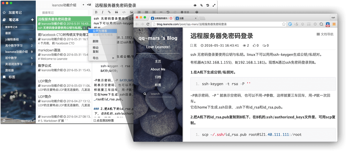 分享:通过 Leanote 与朋友分享您的知识、想法和经验。邀请您的朋友加入您在云中的记事本。