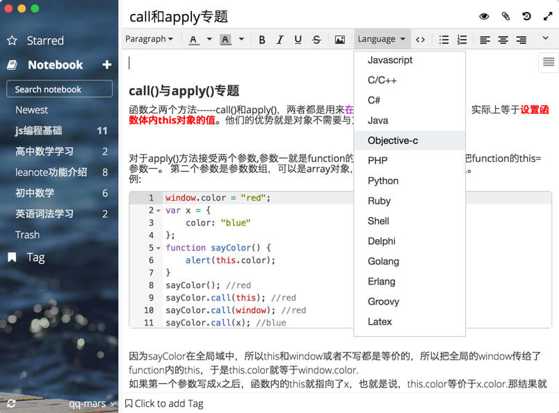 涵盖所有主流语言的代码高亮,随心所欲在Leanote里写代码,记知识。