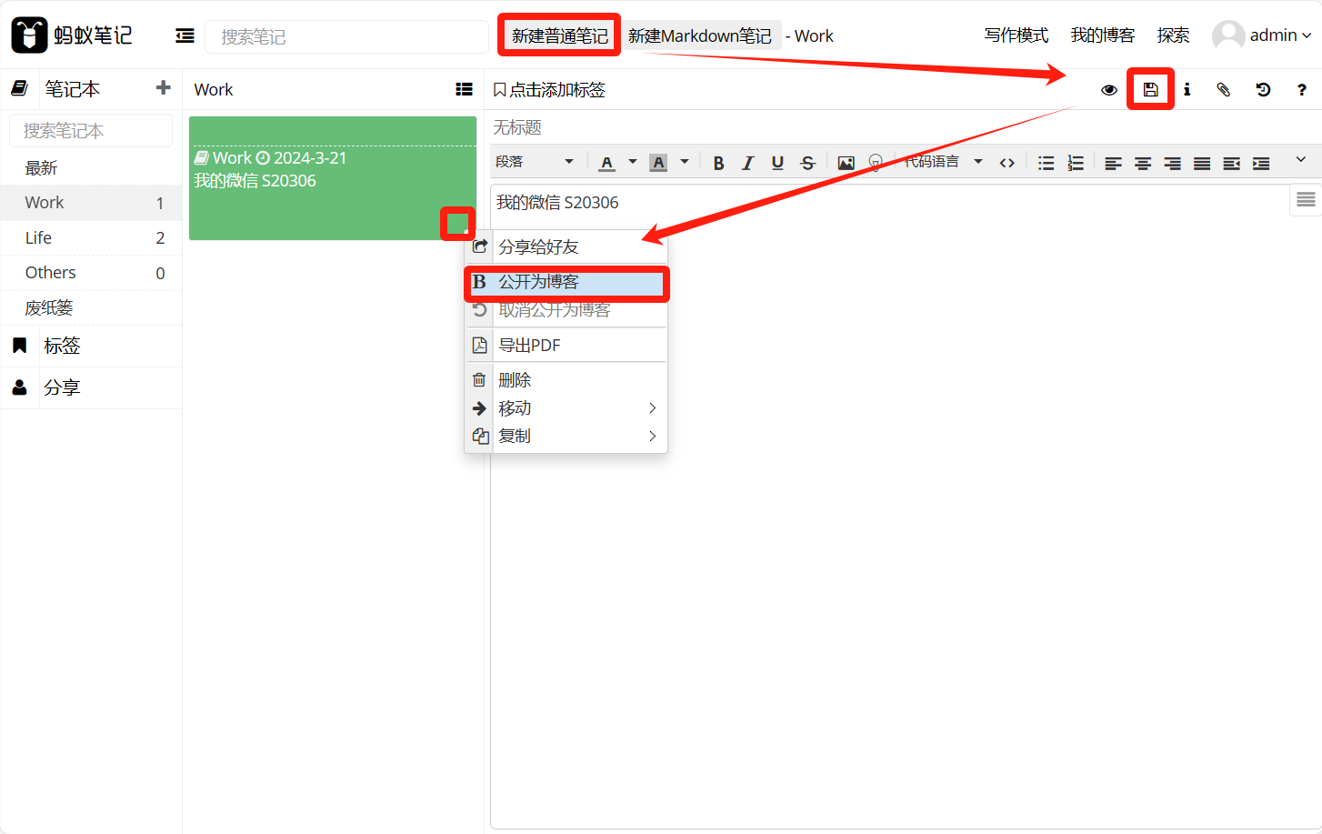 新建一个笔记,保存后在笔记右下角设置图标上可以设置为公开为博客。