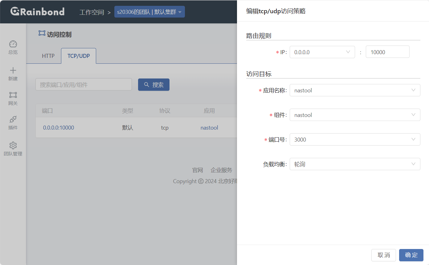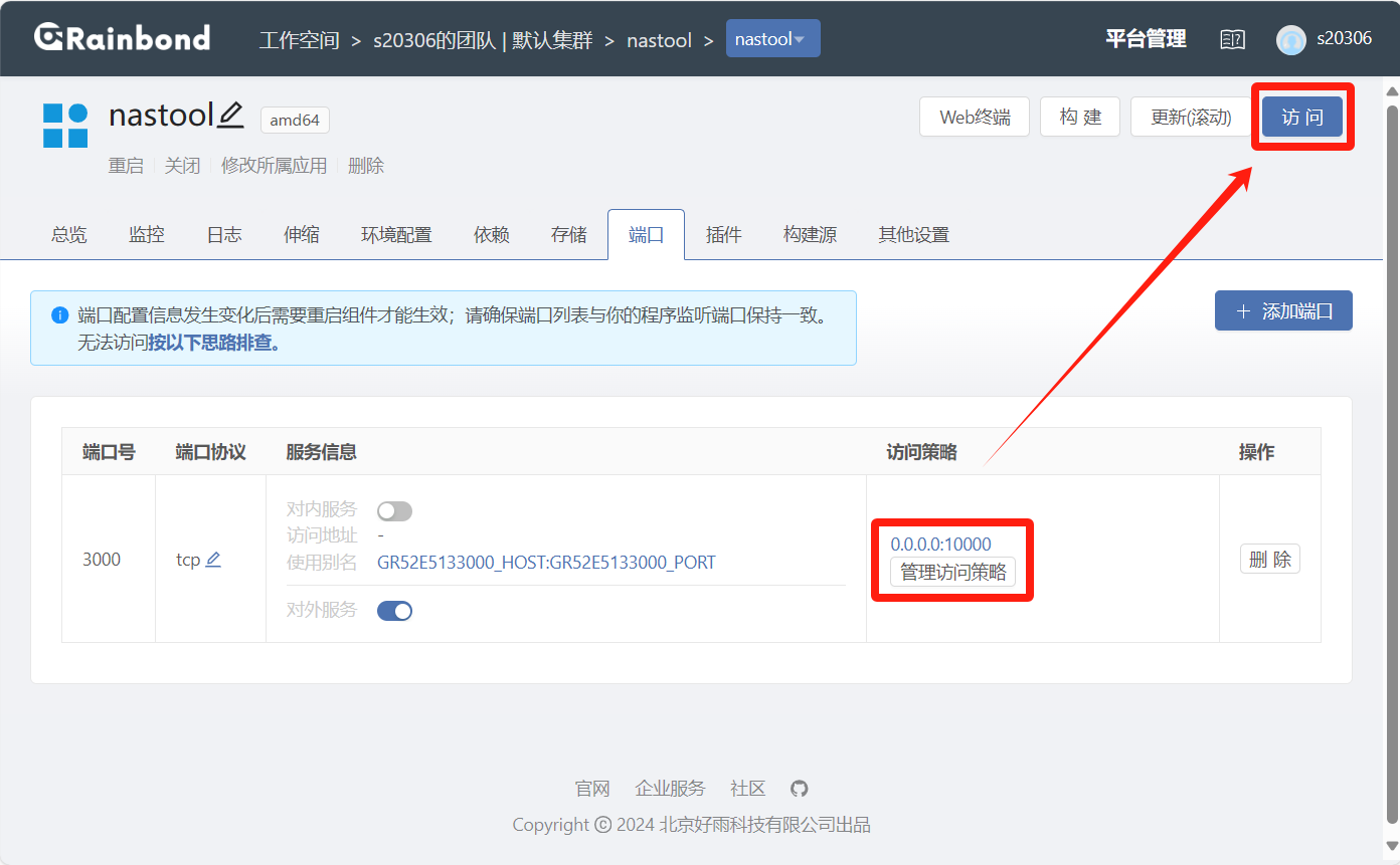 默认是会生成一个随机端口替代你设置的容器端口,你可以点击管理访问策略进行手动更改。