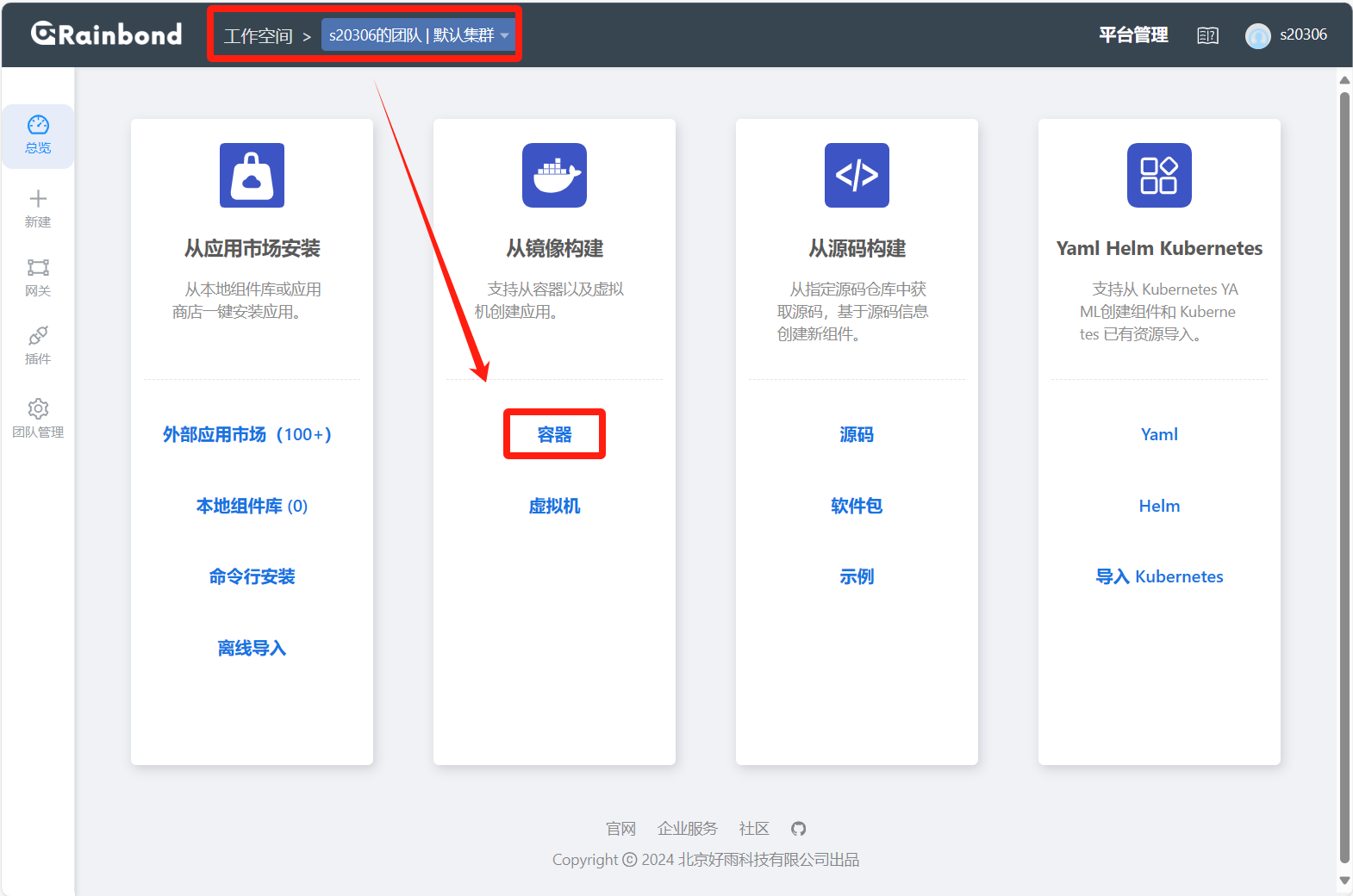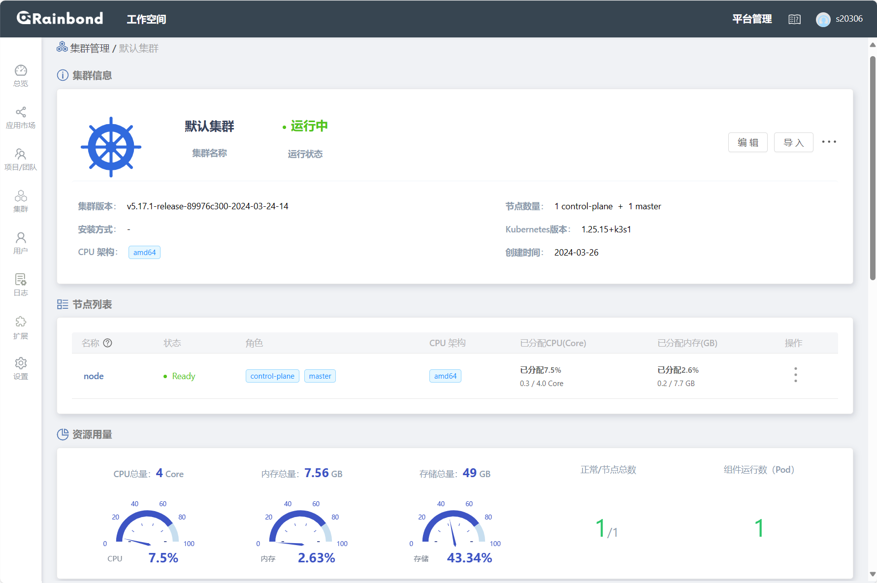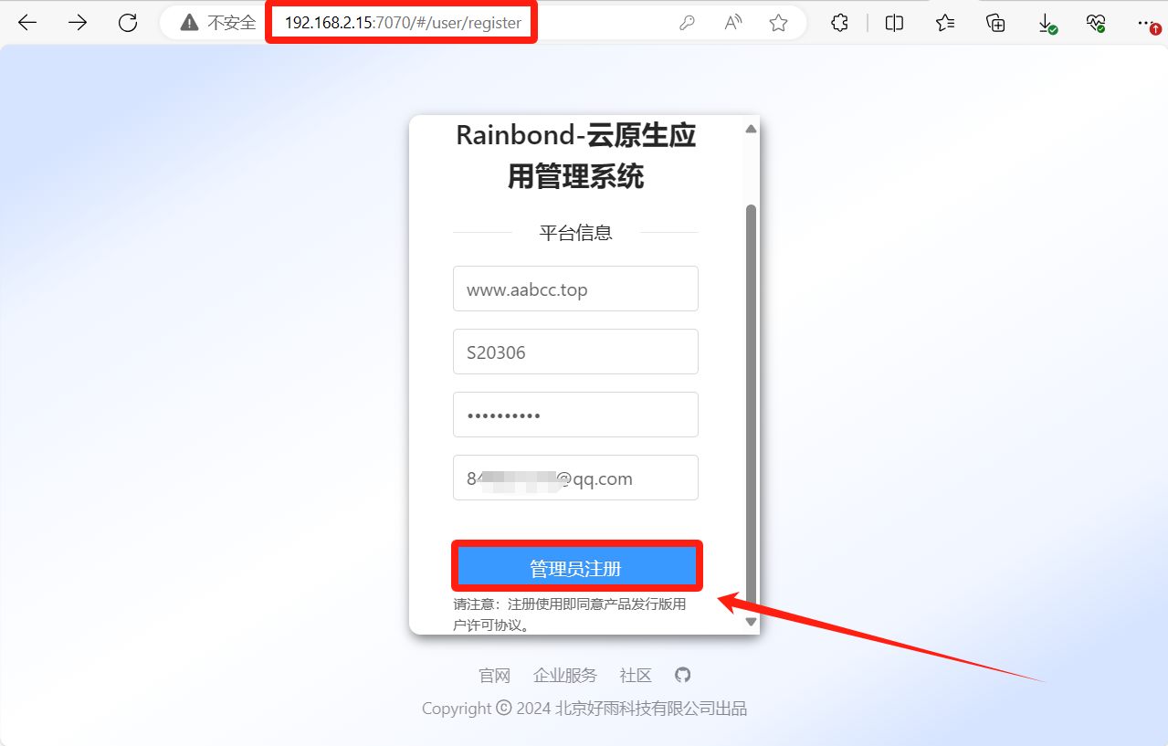 [root@localhost ~]# curl -o install.sh https://get.rainbond.com && bash ./install.sh #执行自动安装脚本 % Total % Received % Xferd Average Speed Time Time Time Current Dload Upload Total Spent Left Speed 100 16523 100 16523 0 0 17386 0 --:--:-- --:--:-- --:--:-- 17374 /lib/modules/3.10.0-1160.108.1.el7.x86_64/kernel/net/ipv4/netfilter/iptable_raw.ko.xz iptable_raw 12678 1 ip_tables 27126 5 iptable_security,iptable_filter,iptable_mangle,iptable_nat,iptable_raw 2024-03-26 16:15:38 INFO: 欢迎您安装 Rainbond, 如果您安装遇到问题, 请反馈到 https://www.rainbond.com/community/support ############################################### # 脚本将自动检测到系统中存在的 IP 地址 # 您可以通过输入序号来选择一个 IP 地址 # 如果您有公网 IP 地址, 直接输入即可 ############################################### 检测到以下IP: 1 : 127.0.0.1 2 : 192.168.2.15 3 : 172.20.0.1 4 : 172.18.0.1 5 : 172.19.0.1 6 : 172.21.0.1 例如: 输入 '1 or 2' 选择 IP, 或指定IP '11.22.33.44'(IPv4 address), 直接回车则使用默认 IP 地址 输入您的选择或指定 IP 地址(默认IP是: 192.168.2.15):2 #选择你需要使用的IP地址,输入对应的数字即可。 ############################################### # Rainbond 版本: v5.17.1 # 架构: amd64 # 操作系统: Linux # Web 控制台访问地址: http://192.168.2.15:7070 # Rainbond 文档: https://www.rainbond.com/docs # 如过您安装遇到问题,请反馈至: # https://www.rainbond.com/community/support ############################################### 生成安装命令: 2024-03-26 16:15:58 INFO: docker run --privileged -d -p 7070:7070 -p 80:80 -p 443:443 -p 6060:6060 -p 10000-10010:10000-10010 --name=rainbond-allinone --restart=on-failure -v ~/.ssh:/root/.ssh -v ~/rainbonddata:/app/data -v /opt/rainbond:/opt/rainbond -e EIP=192.168.2.15 -e UUID=20f6c6048925e645caa8e73bd91d71f3 registry.cn-hangzhou.aliyuncs.com/goodrain/rainbond:v5.17.1-dind-allinone 2024-03-26 16:15:58 INFO: 获取镜像中 registry.cn-hangzhou.aliyuncs.com/goodrain/rainbond:v5.17.1-dind-allinone... v5.17.1-dind-allinone: Pulling from goodrain/rainbond 778066204fb7: Pull complete 0036158cfada: Pull complete 0e3a508508d3: Pull complete 5c9866230de7: Pull complete 4d2393ffbbeb: Pull complete 88a56ba4c9b5: Pull complete 4595de3a7f8e: Pull complete 352cacbcf5f2: Pull complete a94dbc274f69: Pull complete 4f4fb700ef54: Pull complete caf8f3988c5f: Pull complete Digest: sha256:b7bb82090e75db8d8d456bc2e5d92ad45d796d2d648e7f7123659a4ca9f75ee8 Status: Downloaded newer image for registry.cn-hangzhou.aliyuncs.com/goodrain/rainbond:v5.17.1-dind-allinone registry.cn-hangzhou.aliyuncs.com/goodrain/rainbond:v5.17.1-dind-allinone 2024-03-26 16:16:50 INFO: Rainbond 容器 ID 为: 3841df976b03 2024-03-26 16:16:53 INFO: Rainbond dind allinone 正在安装中... 2024-03-26 16:16:55 INFO: 6544a157bb672e29faffc1f3dd9dda1860b627650757a8cf89738e32f699d3bf 2024-03-26 16:16:58 INFO: Rainbond dind allinone 启动成功,容器 ID 为: 6544a157bb67. 请观察 rainbond-allinone 容器启动日志. 2024-03-26 16:16:55,386 CRIT Set uid to user 0 2024-03-26 16:16:55,393 CRIT Server 'unix_http_server' running without any HTTP authentication checking 2024-03-26 16:16:56 WARN: Too little free disk space, recommended disk space greater than 50G 2024-03-26 16:16:56 INFO: Memory: 7745 MB, CPUs: 4, Disk: 34530 MB 2024-03-26 16:16:57 INFO: K3s is starting, please wait ············································ time="2024-03-26T16:17:17+08:00" level=info msg="Acquiring lock file /var/lib/rancher/k3s/data/.lock" time="2024-03-26T16:17:17+08:00" level=info msg="Preparing data dir /var/lib/rancher/k3s/data/7ff50ebf74d50b414302210e5a743eaff8d2152622cb4eef2609887b724ca9f7" 2024-03-26 16:17:20 INFO: K3s Started successfully 2024-03-26 16:17:20 INFO: Rainbond Region is starting, please wait ············································ 2024-03-26 16:17:21 INFO: Rainbond console is starting, please wait ············································ 2024-03-26 16:18:11 INFO: Rainbond Region started successfully 2024-03-26 16:18:12 INFO: Rainbond started successfully, Please pass http://192.168.2.15:7070 Access Rainbond ^C[root@localhost ~]docker ps #查看运行的docker容器 CONTAINER ID IMAGE COMMAND CREATED STATUS PORTS NAMES 6544a157bb67 registry.cn-hangzhou.aliyuncs.com/goodrain/rainbond:v5.17.1-dind-allinone "/usr/bin/supervisor…" 2 minutes ago Up 2 minutes 0.0.0.0:80->80/tcp, :::80->80/tcp, 0.0.0.0:443->443/tcp, :::443->443/tcp, 0.0.0.0:6060->6060/tcp, :::6060->6060/tcp, 0.0.0.0:7070->7070/tcp, :::7070->7070/tcp, 0.0.0.0:10000-10010->10000-10010/tcp, :::10000-10010->10000-10010/tcp rainbond-allinone [root@localhost ~]#