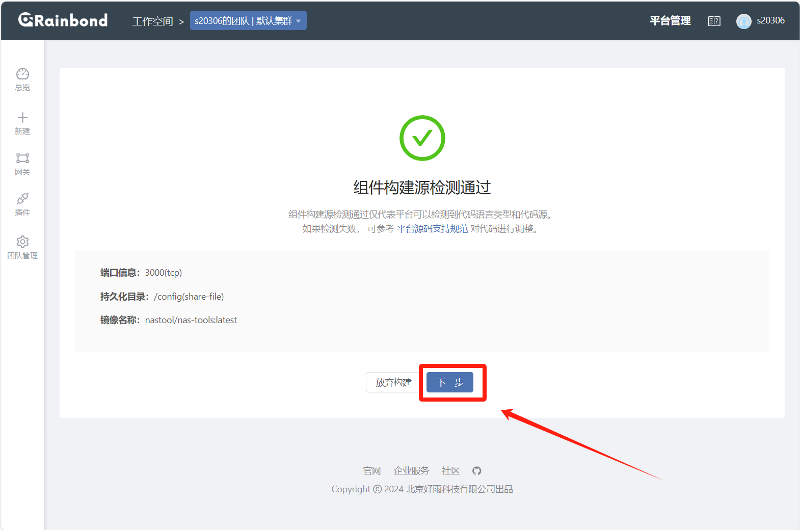 docker run -d -p 3000:3000 nastool/nas-tools稍微等待一下,等待创建完成,然后点击下一步。