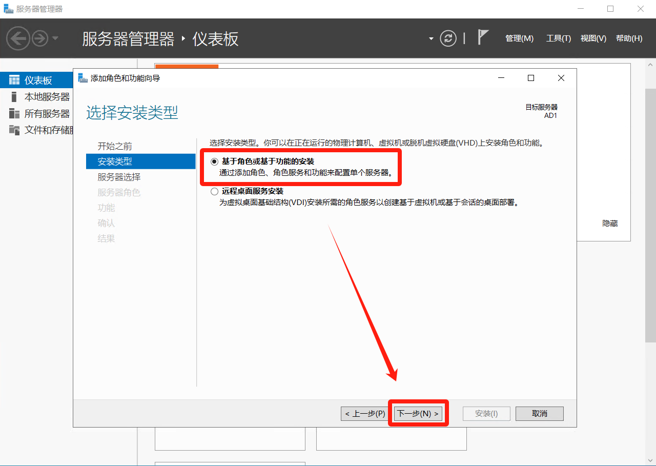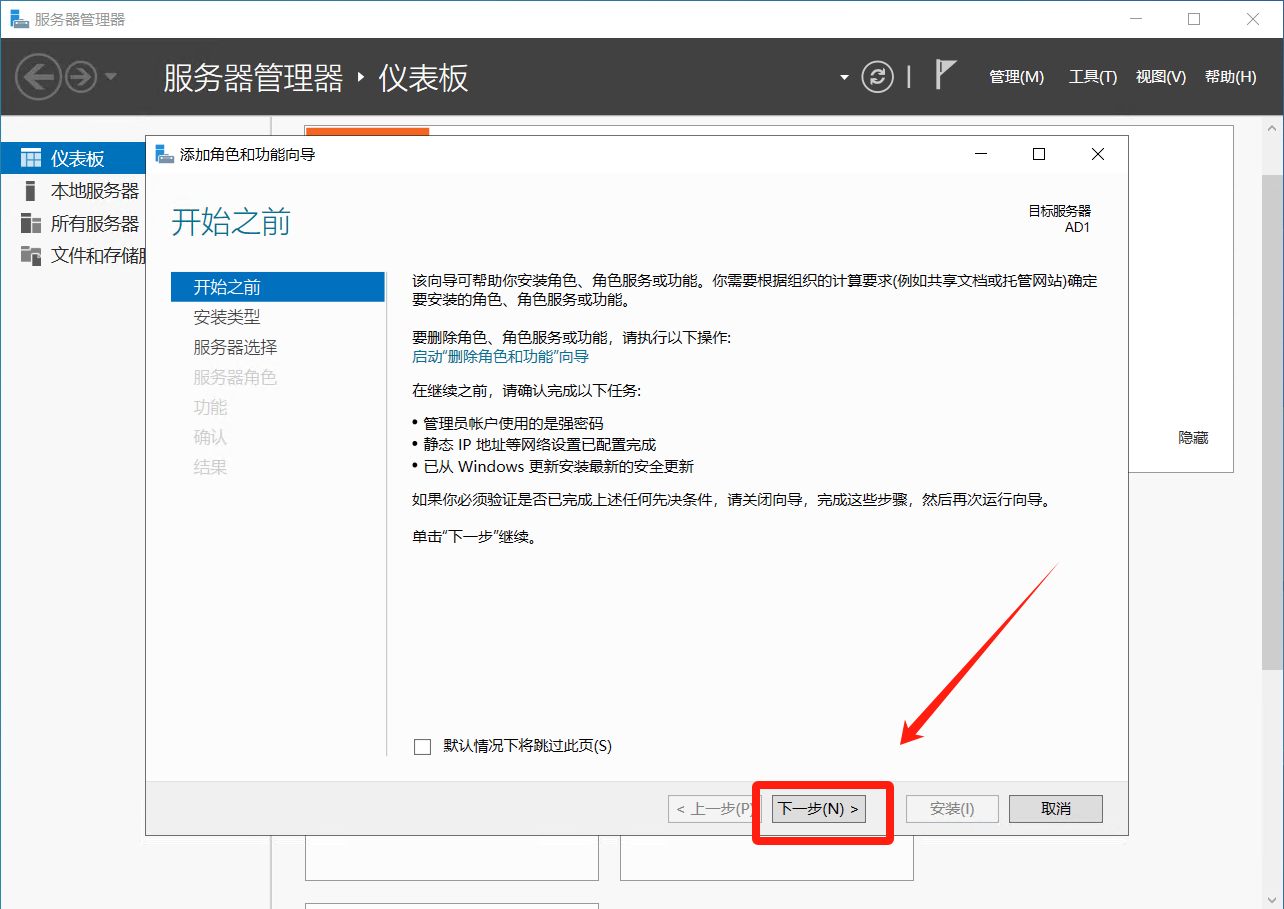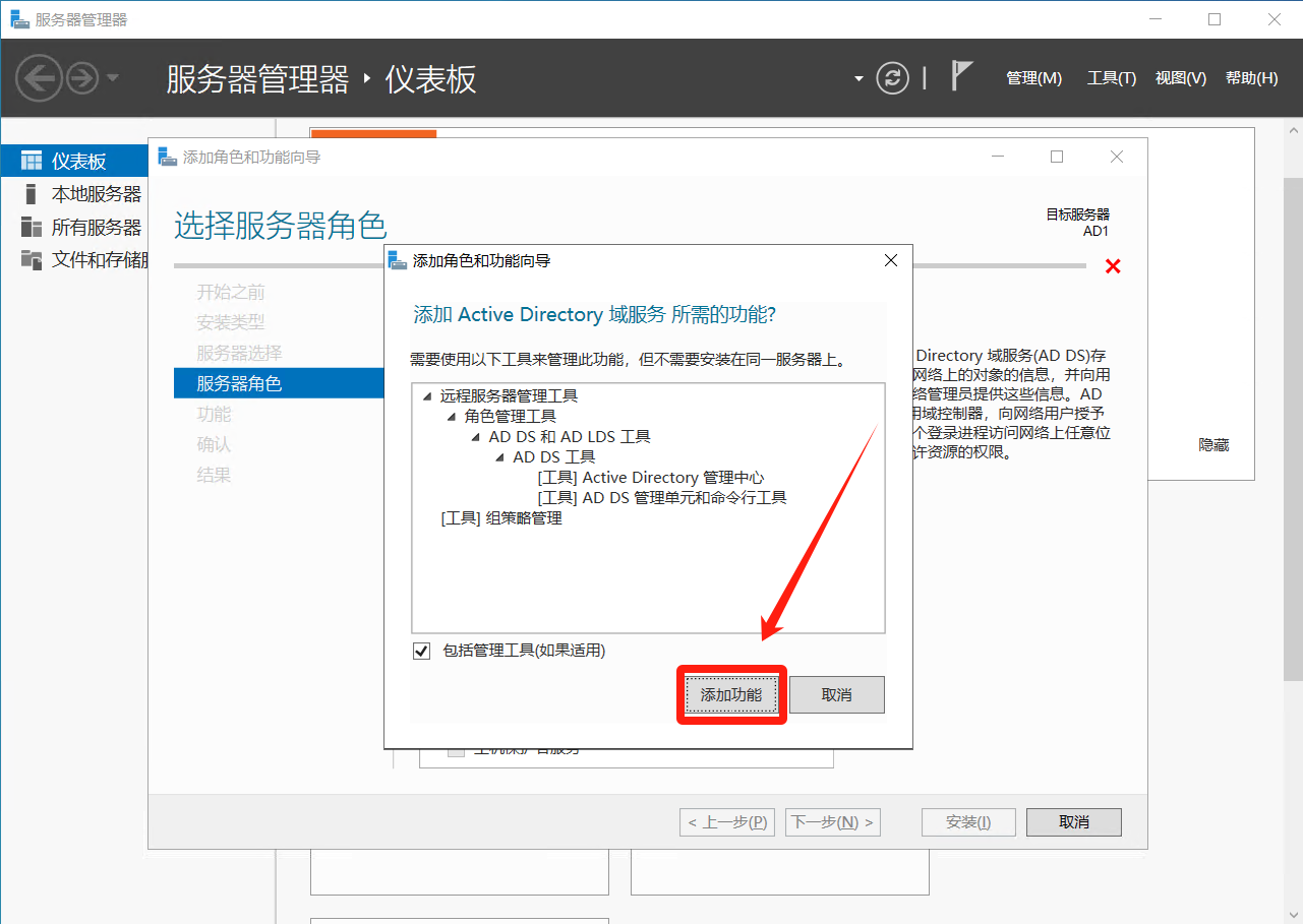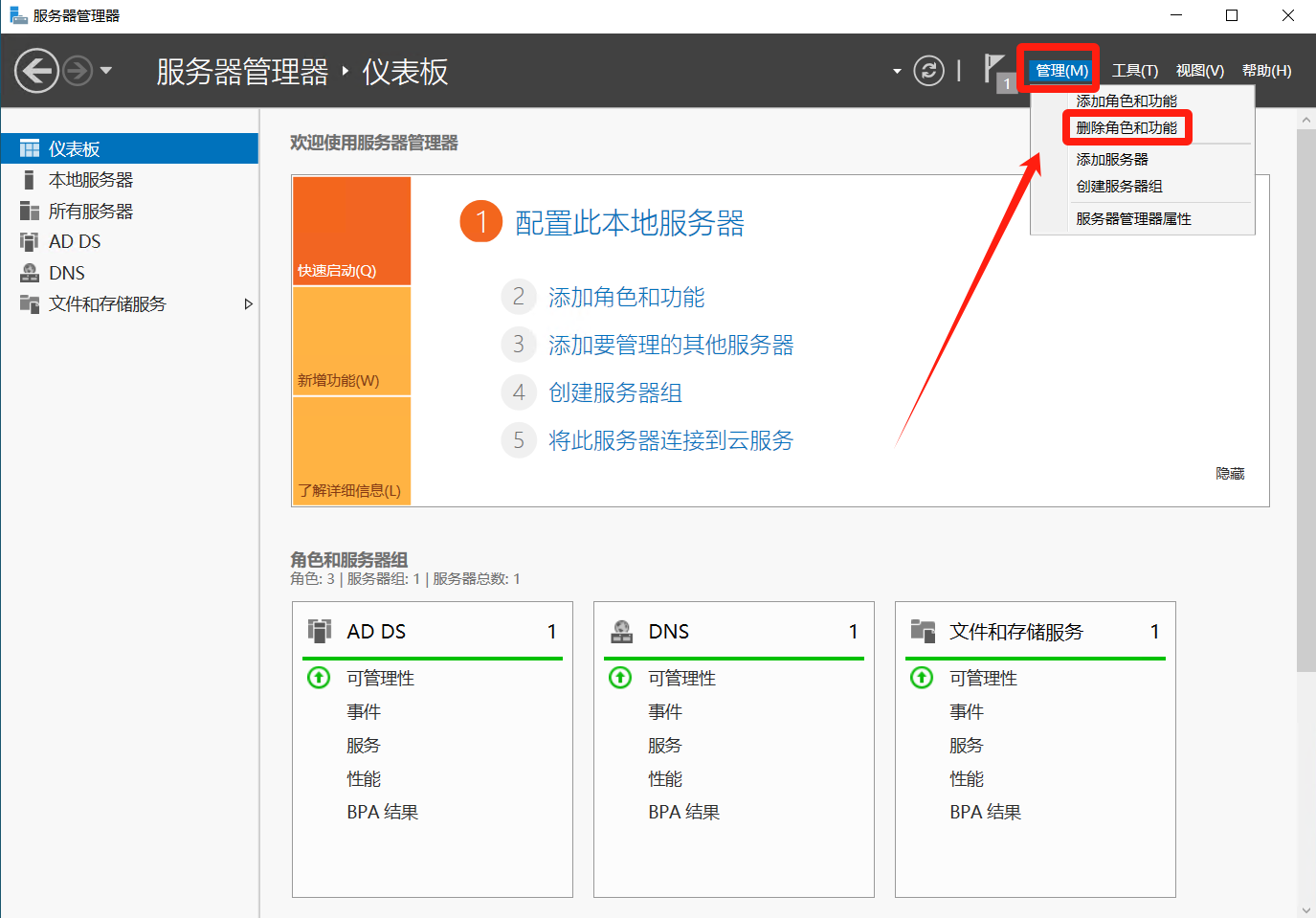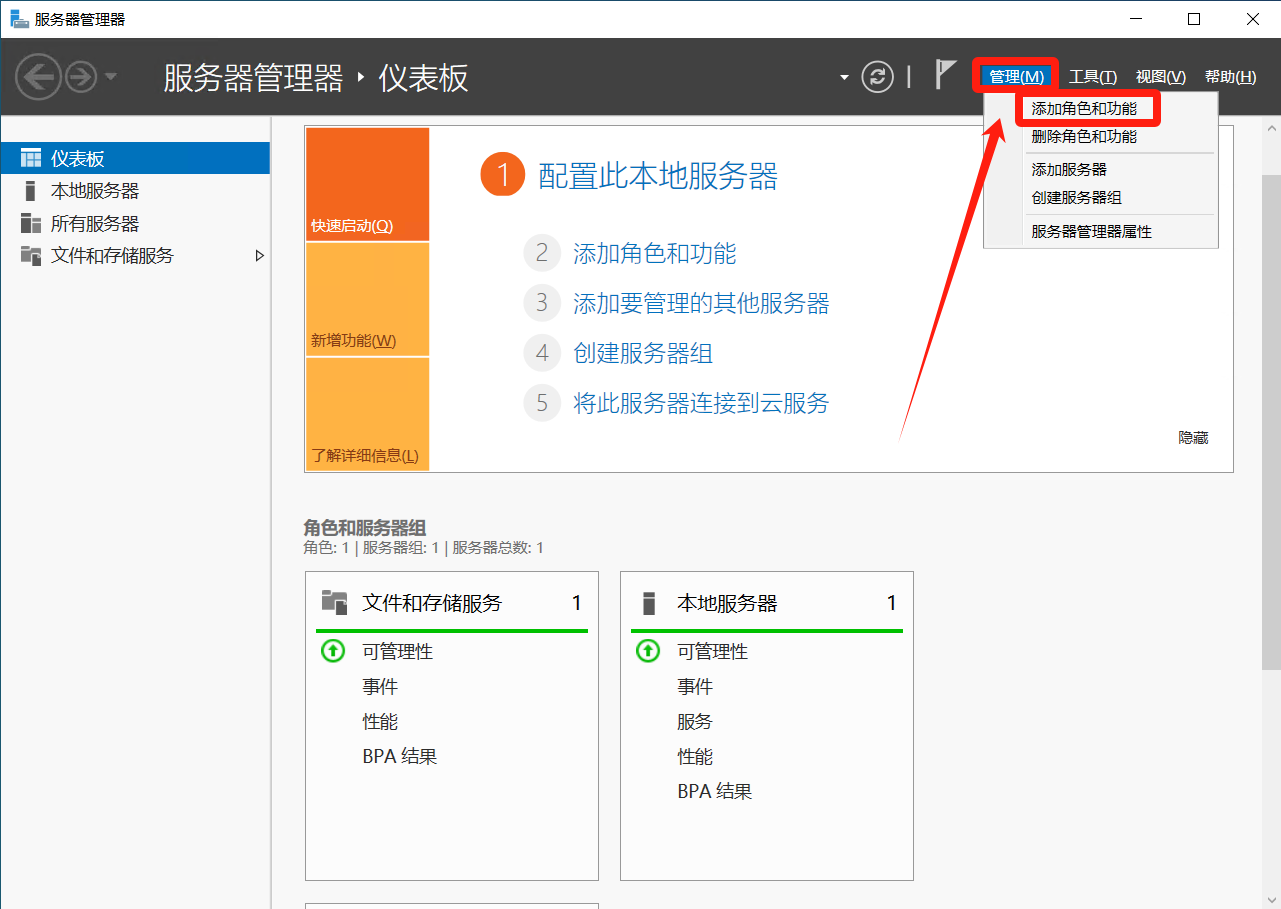 点击服务器管理器--仪表盘--管理--添加角色和功能