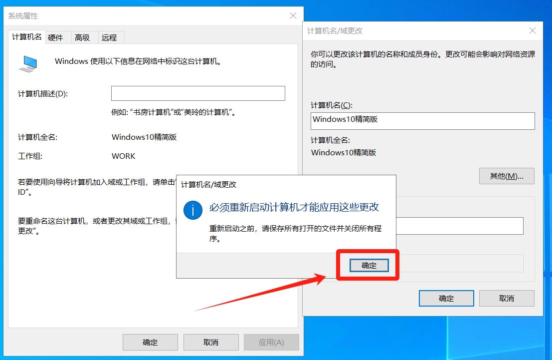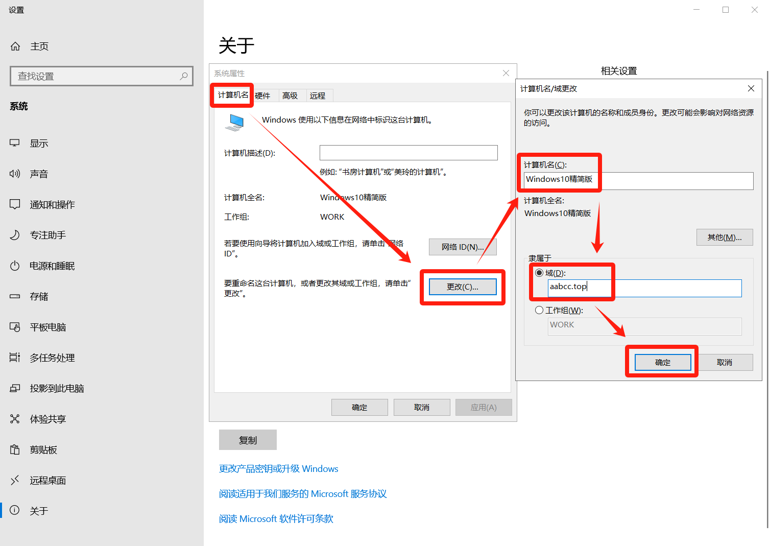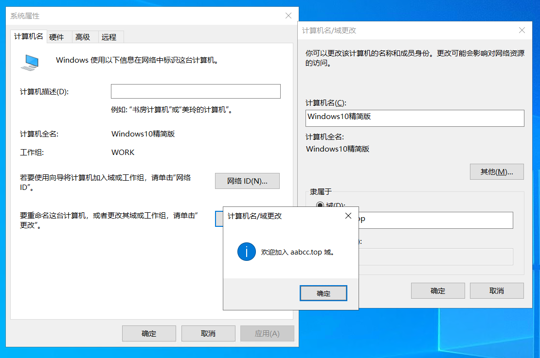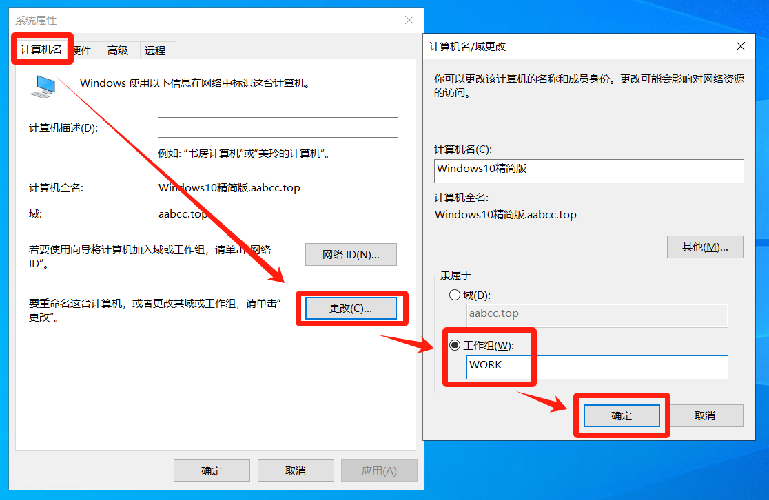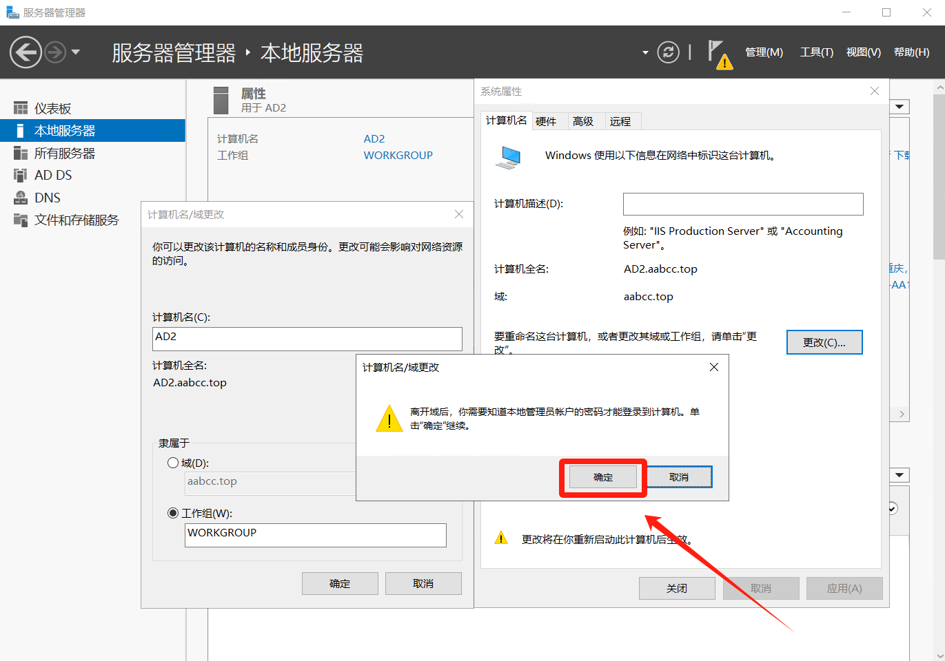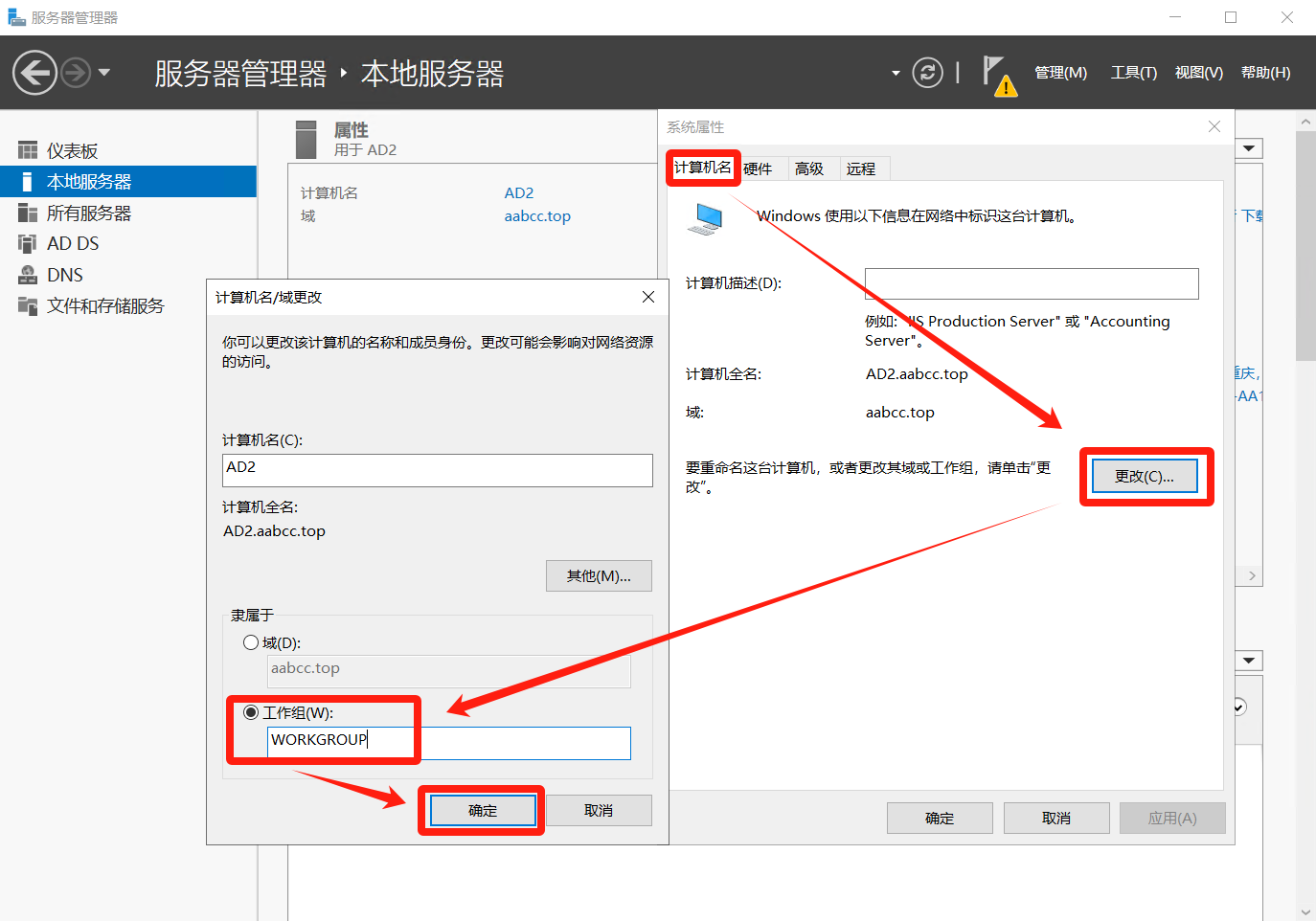 退域就是一样的操作,将隶属于从域切换到工作租(组名随便写),输入域管理员账户后重启电脑。