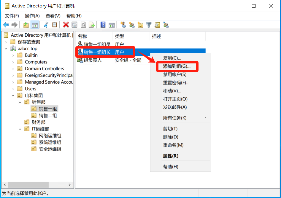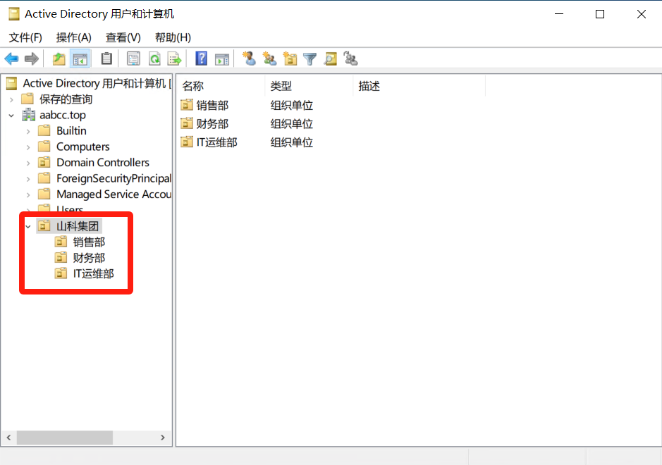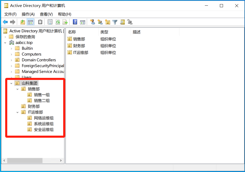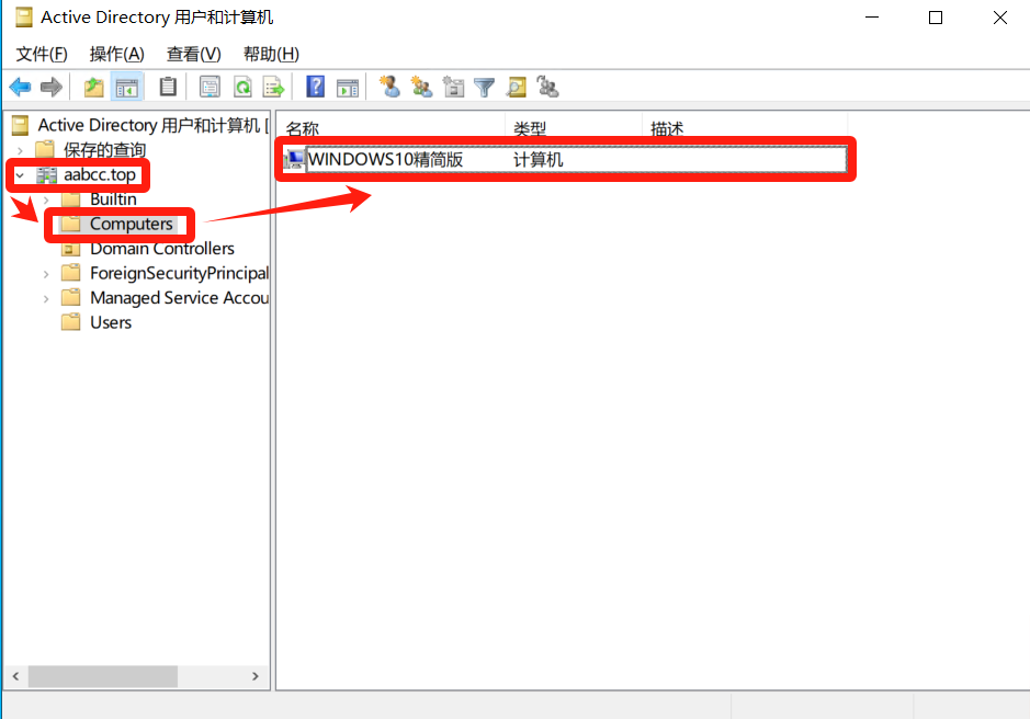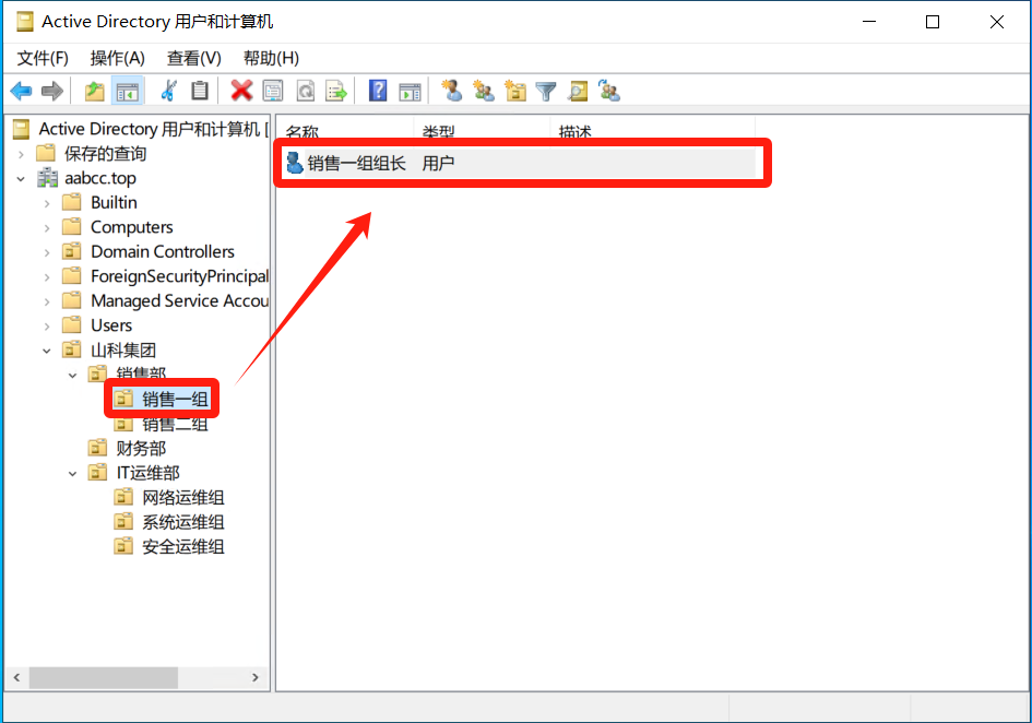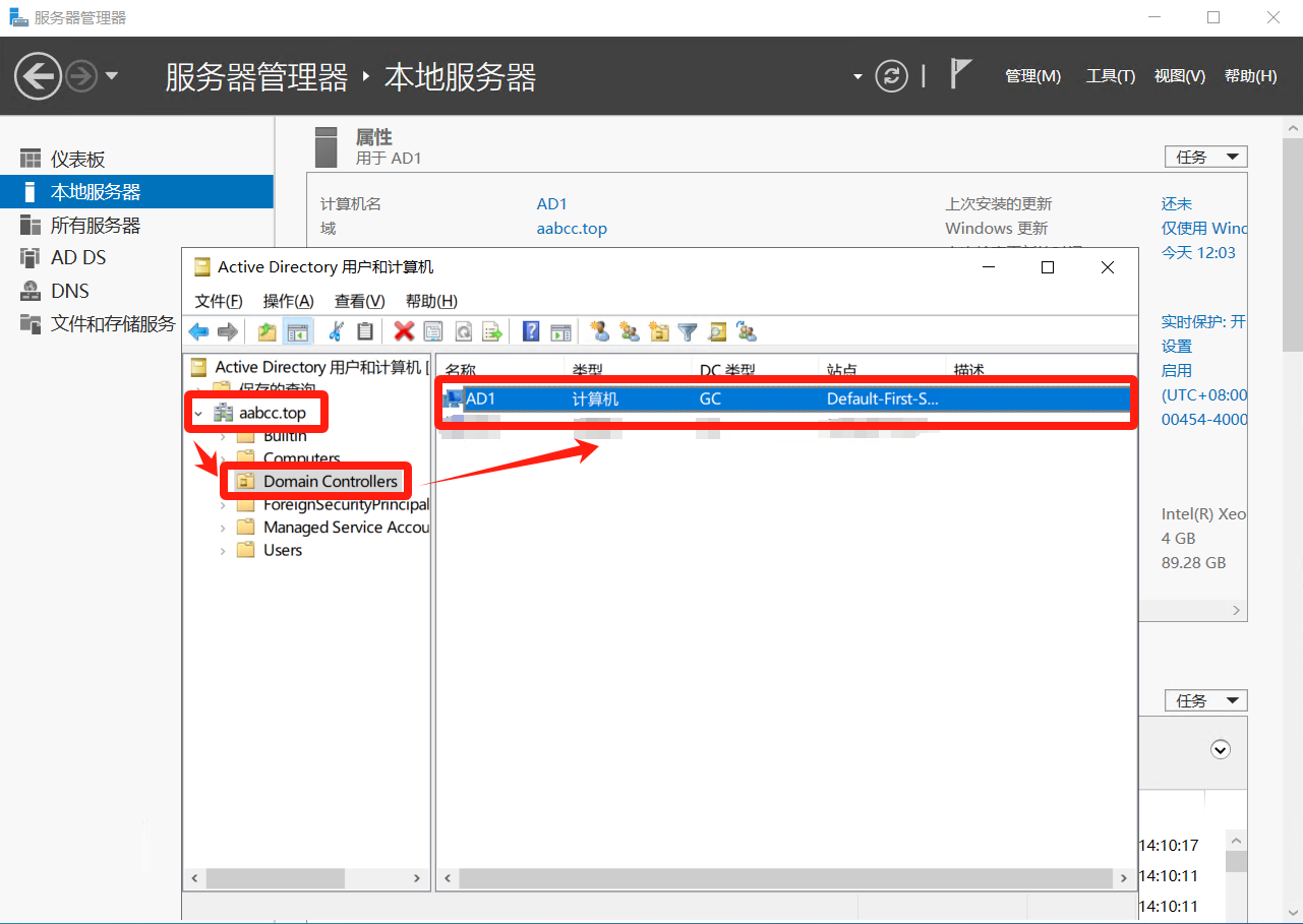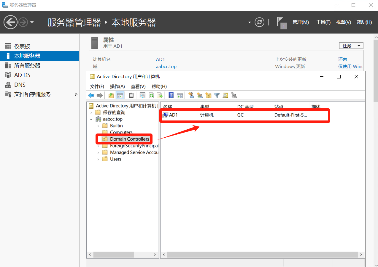 点击根域名--Domain Controllers,可以看到AD1服务器已经加入到域控制器内了。