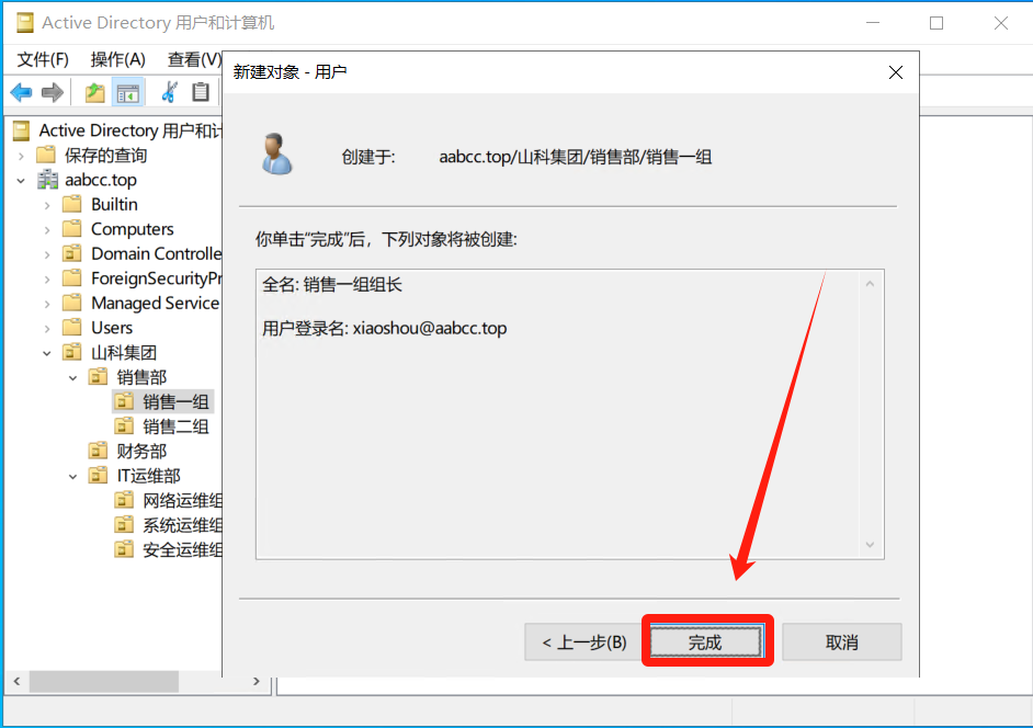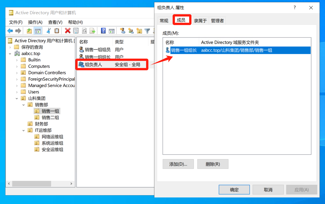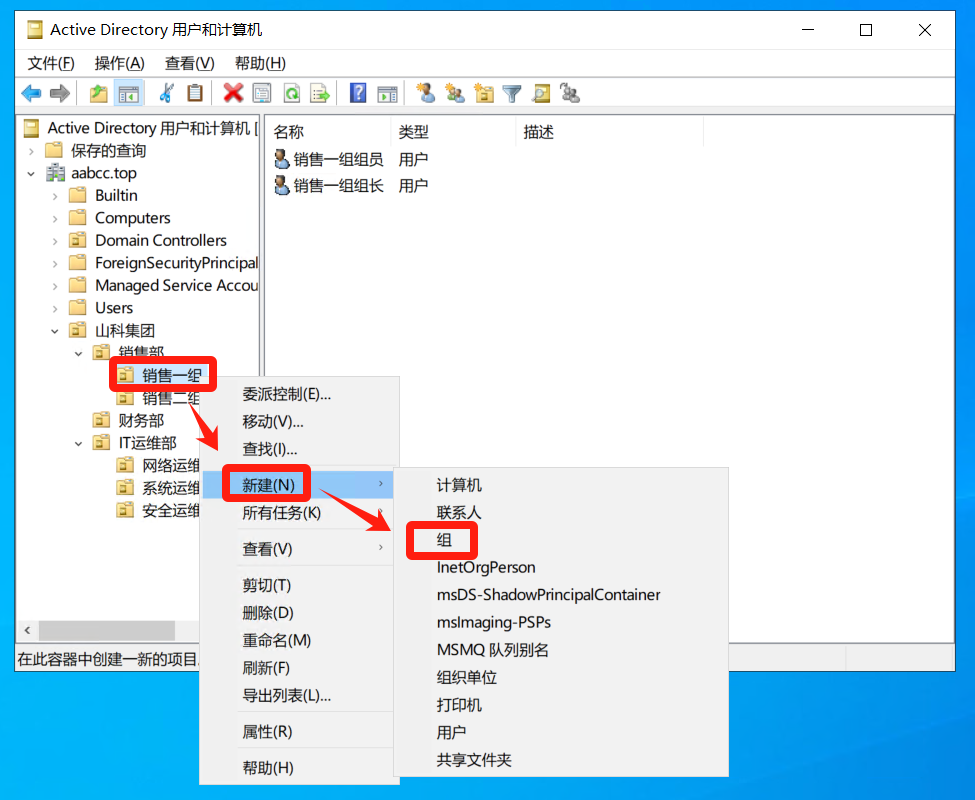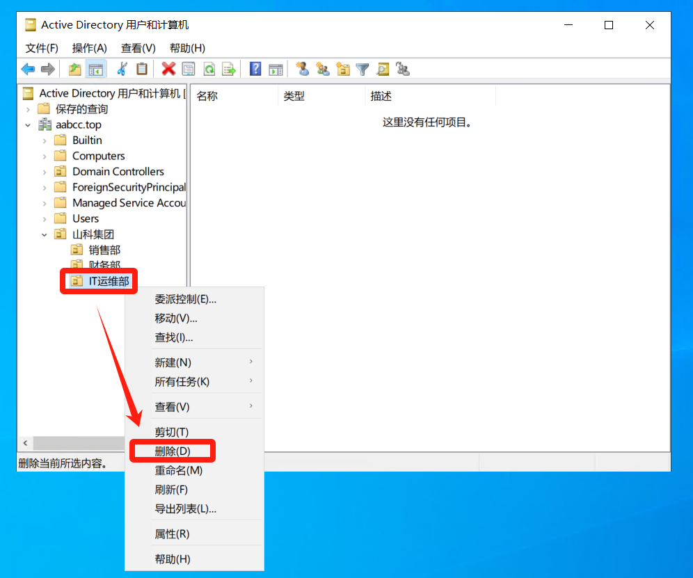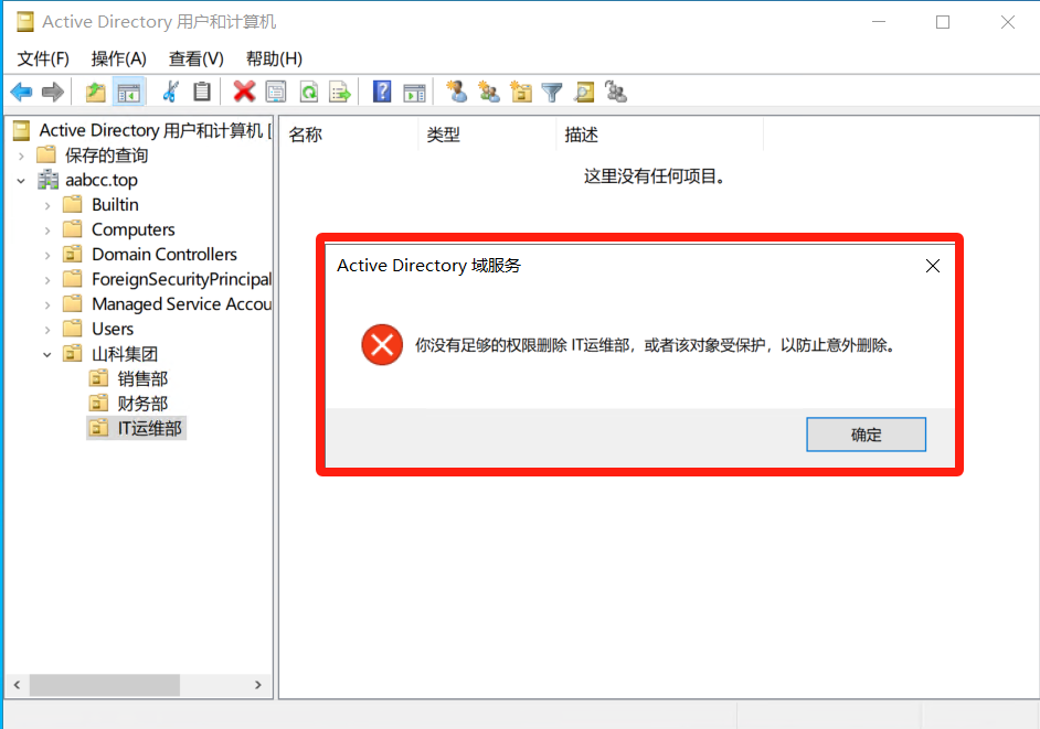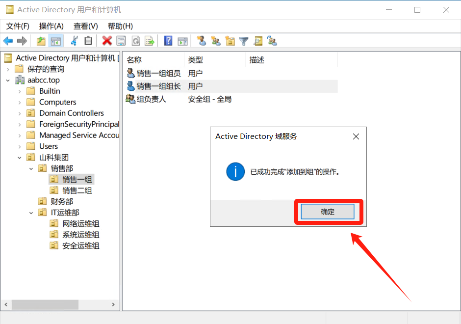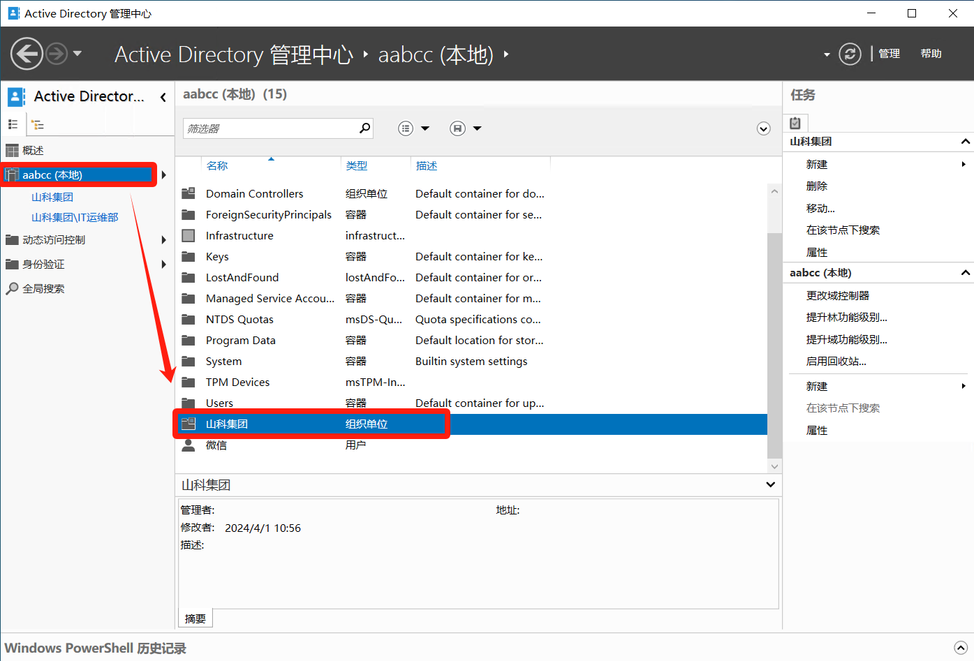 点击根域名--Domain Controllers,可以看到AD1服务器已经加入到域控制器内了。