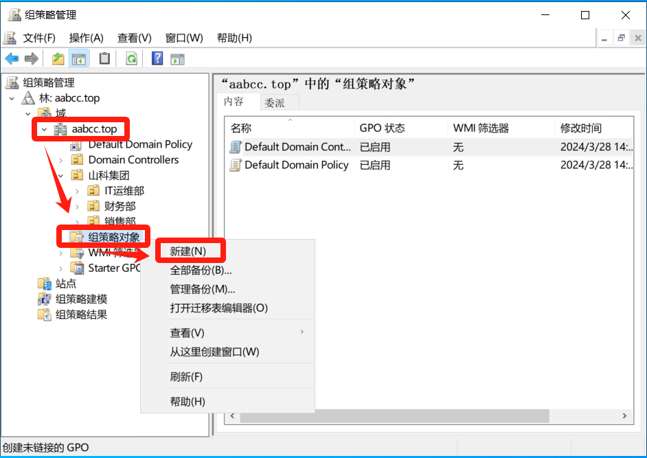 在组策略管理中选择域—组--组策略对象,右键选择新建。