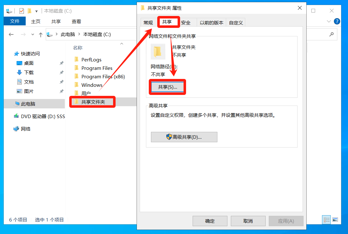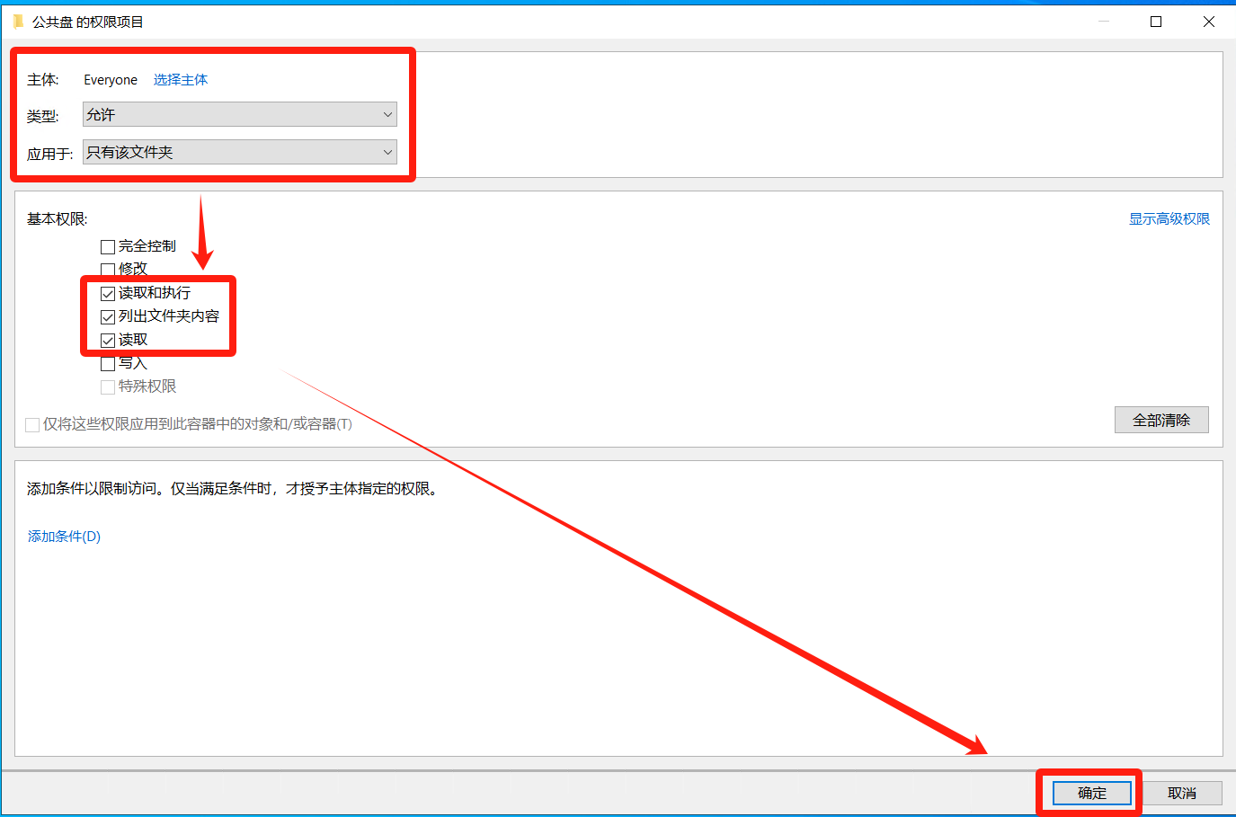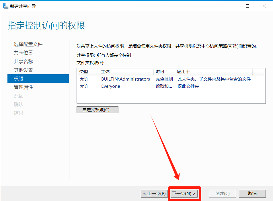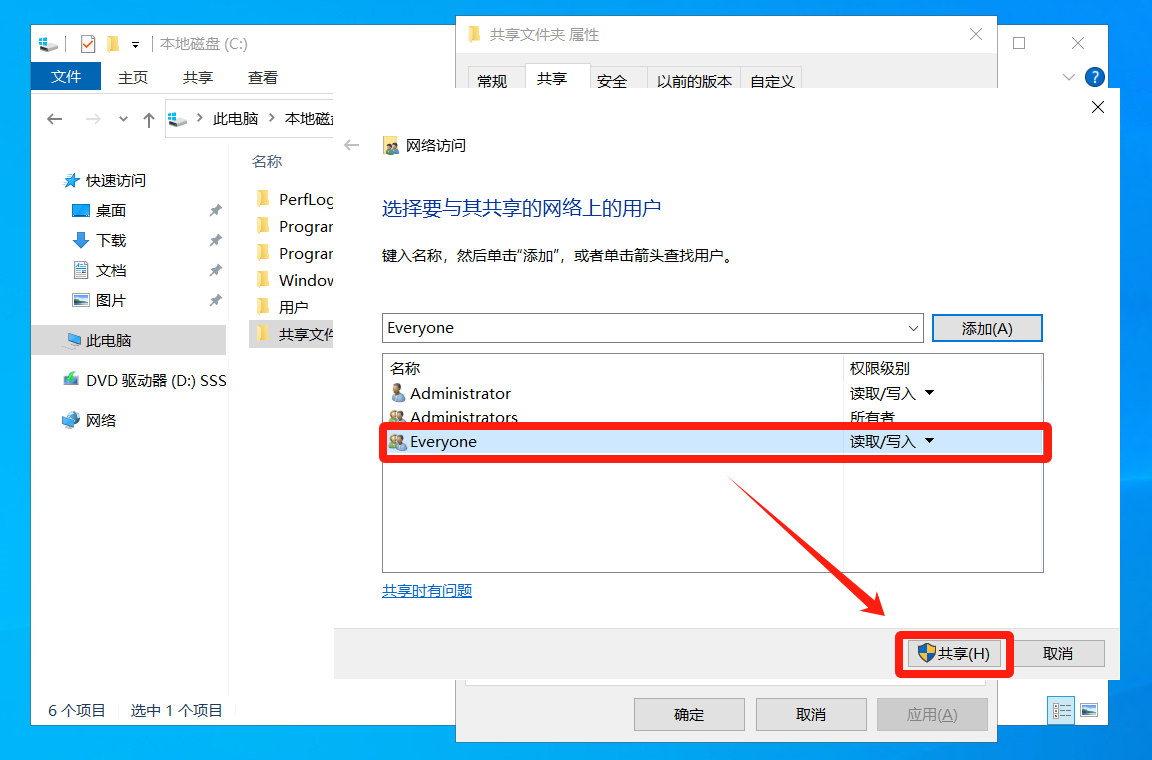 新增一个everyone用户,授予读写权限,然后点击共享。