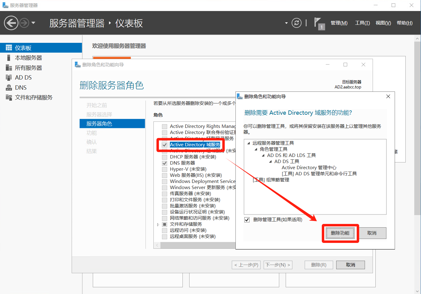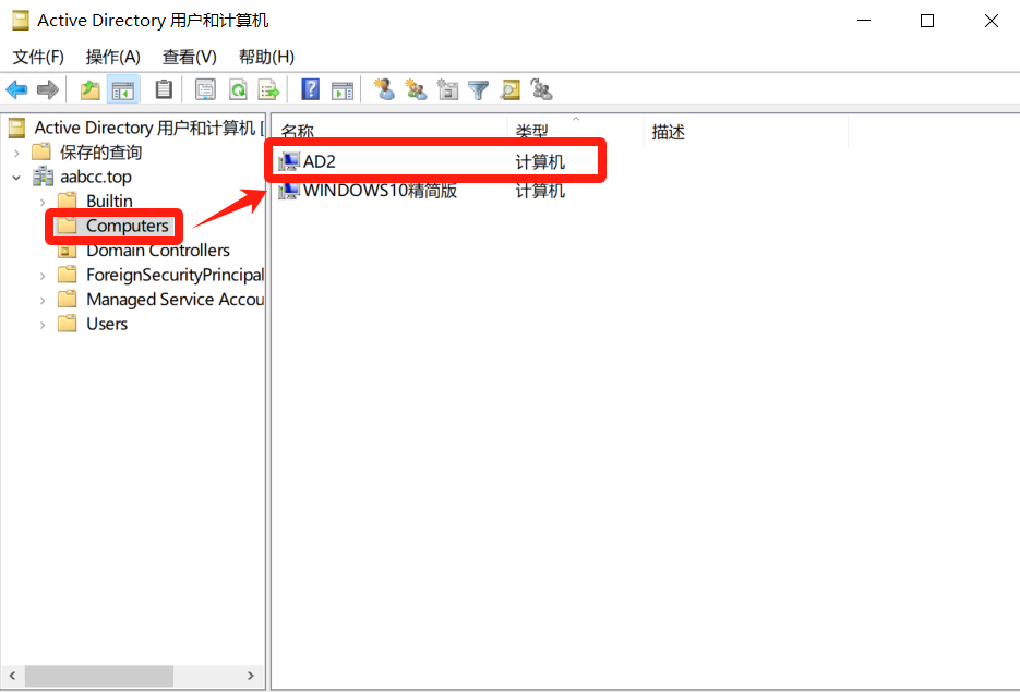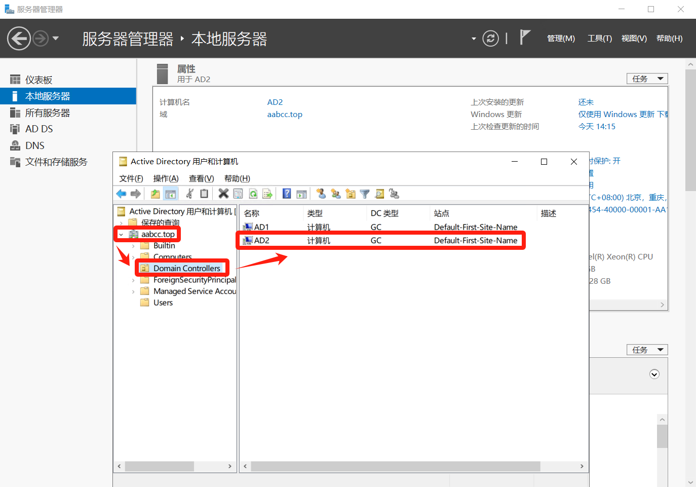 点击根域名--Domain Controllers,可以看到AD2服务器已经加入到域控制器内了。