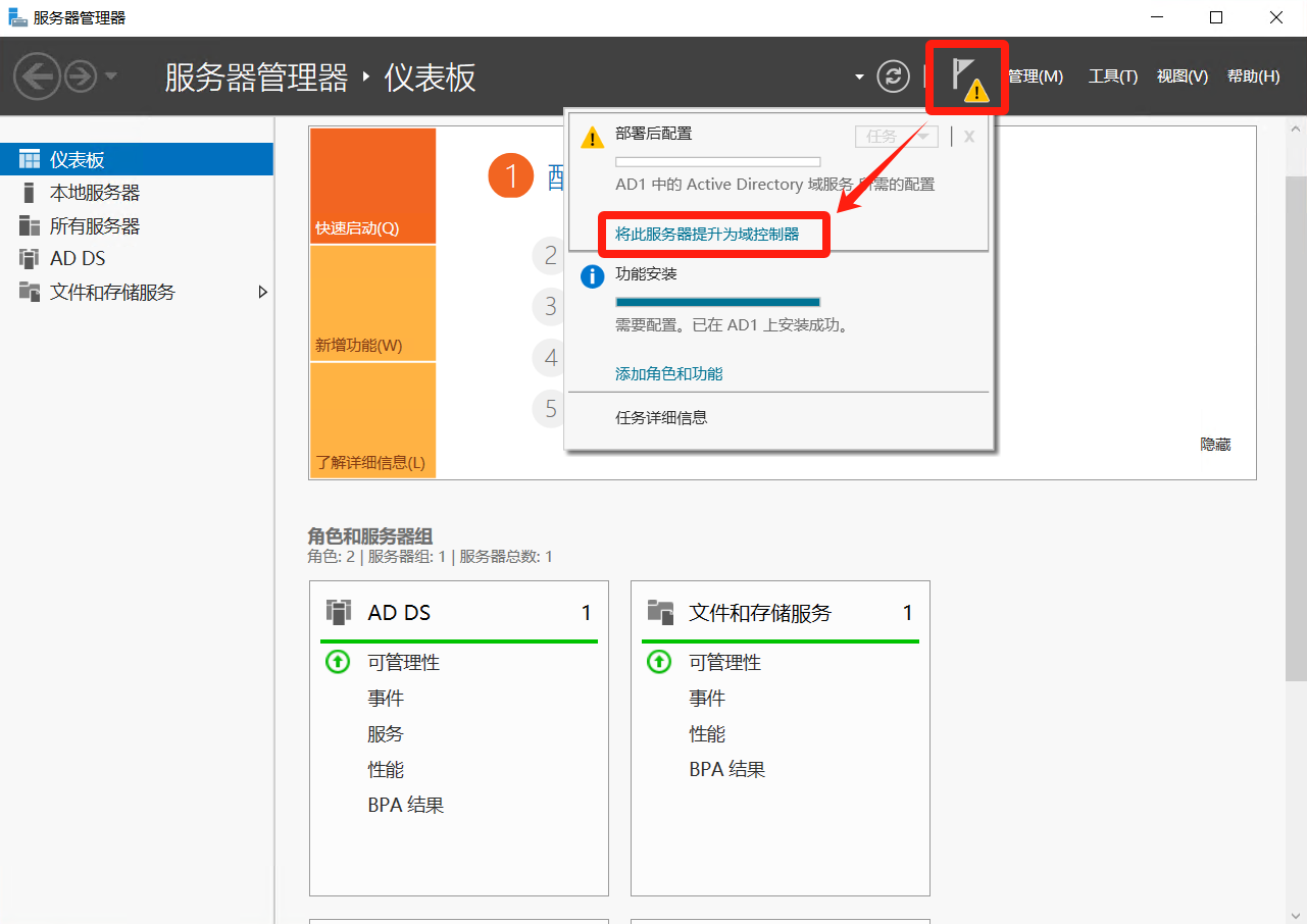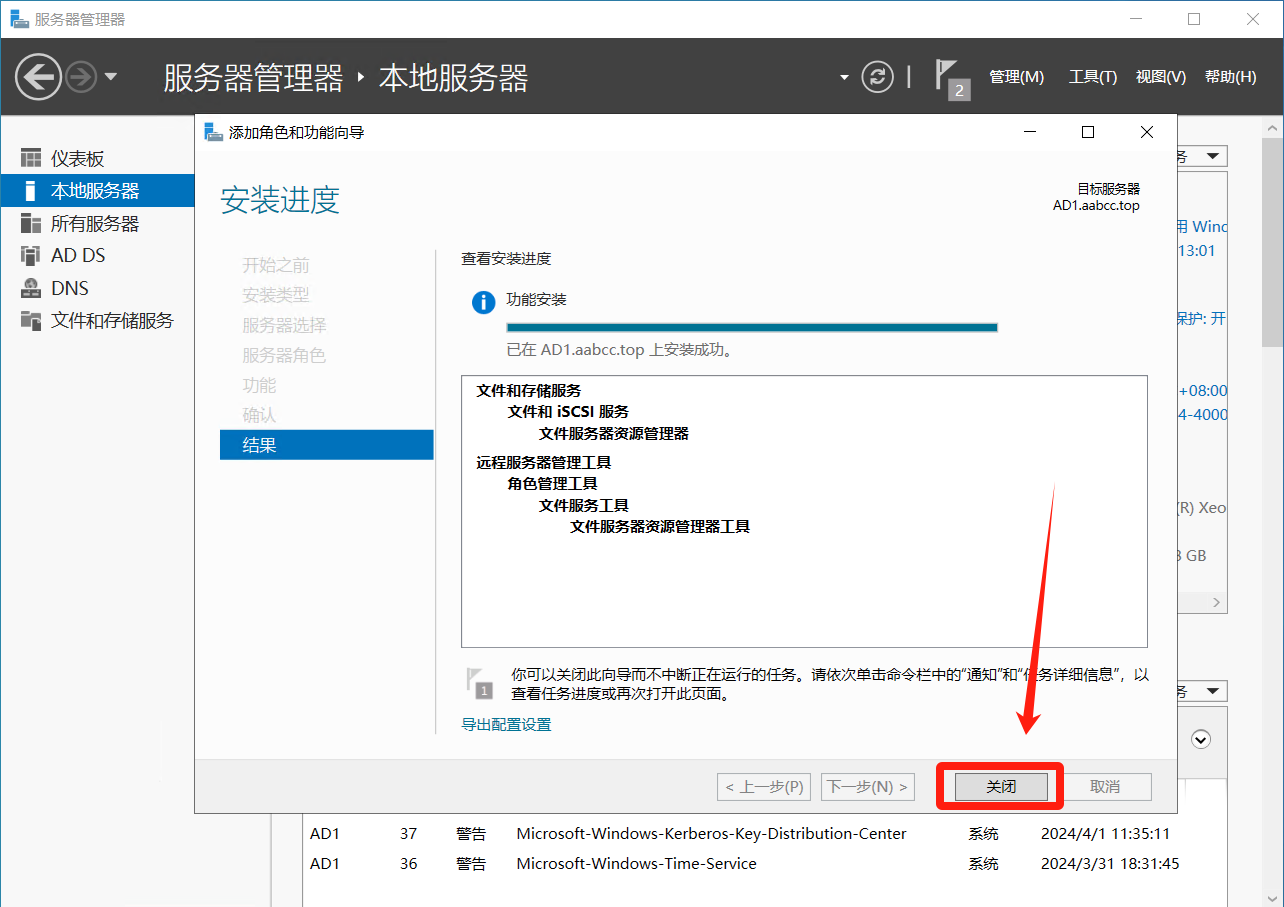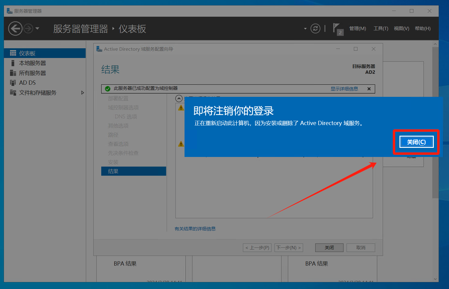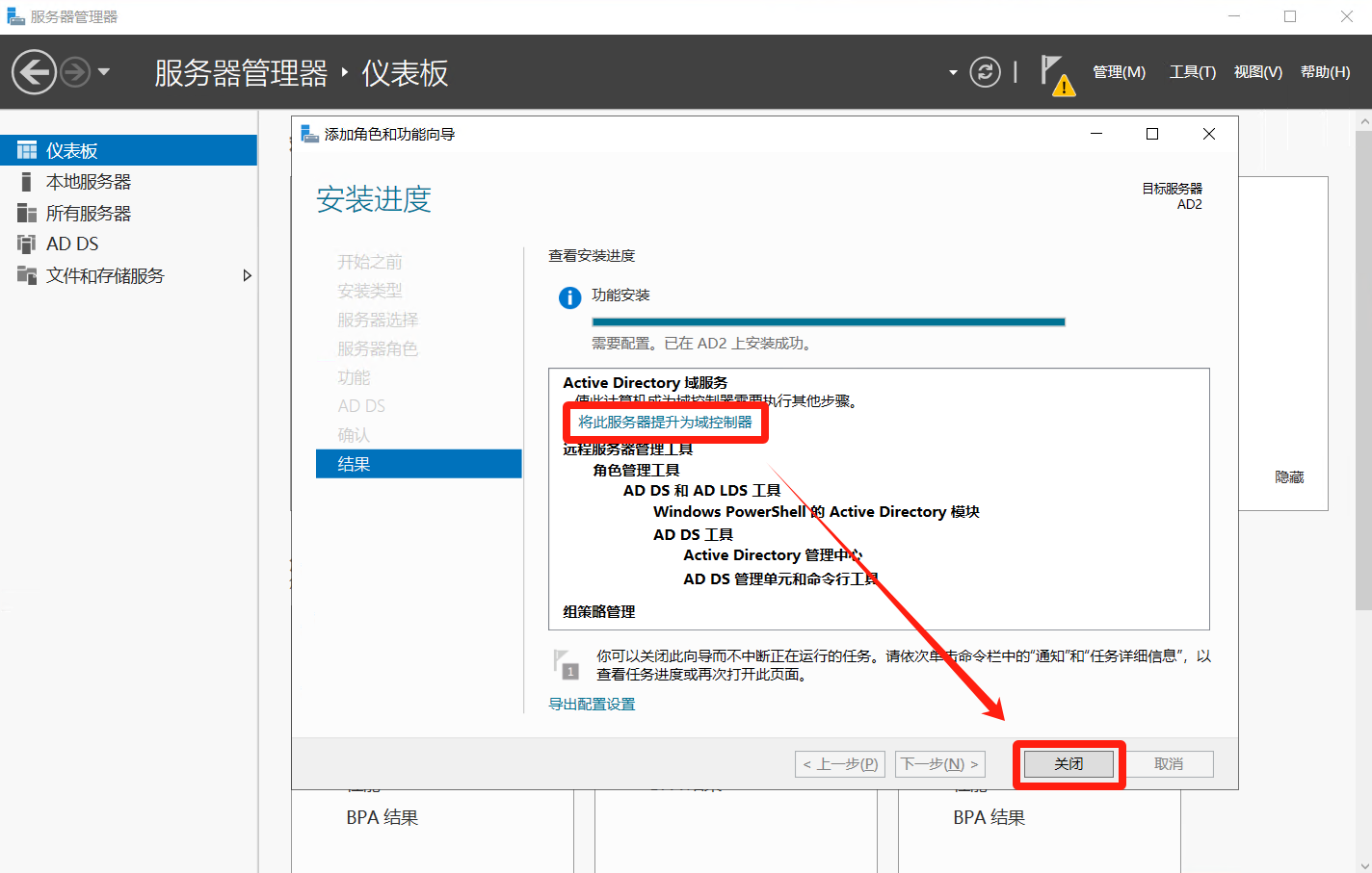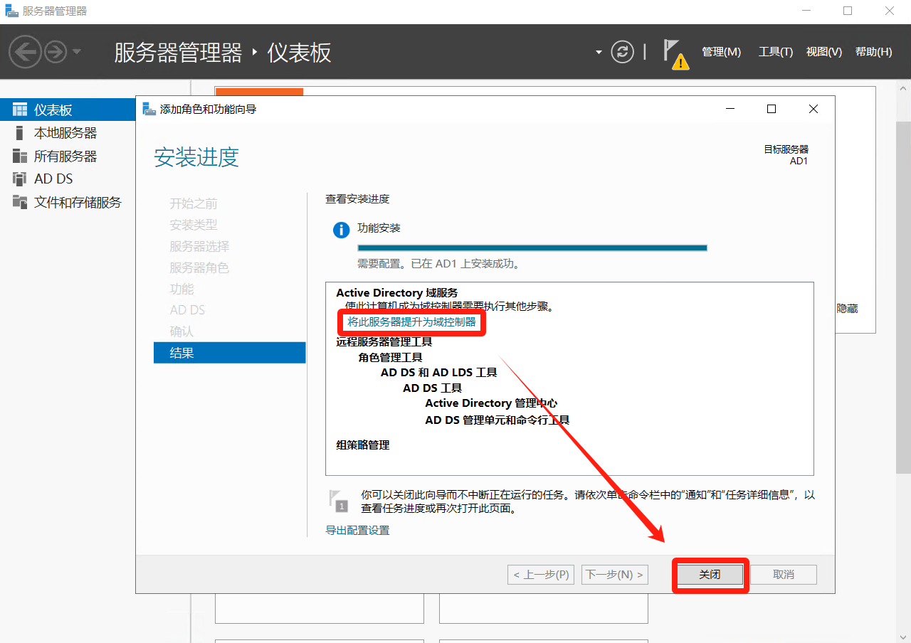 安装完成点击关闭,或者直接点击将此服务器提升为域控制器。