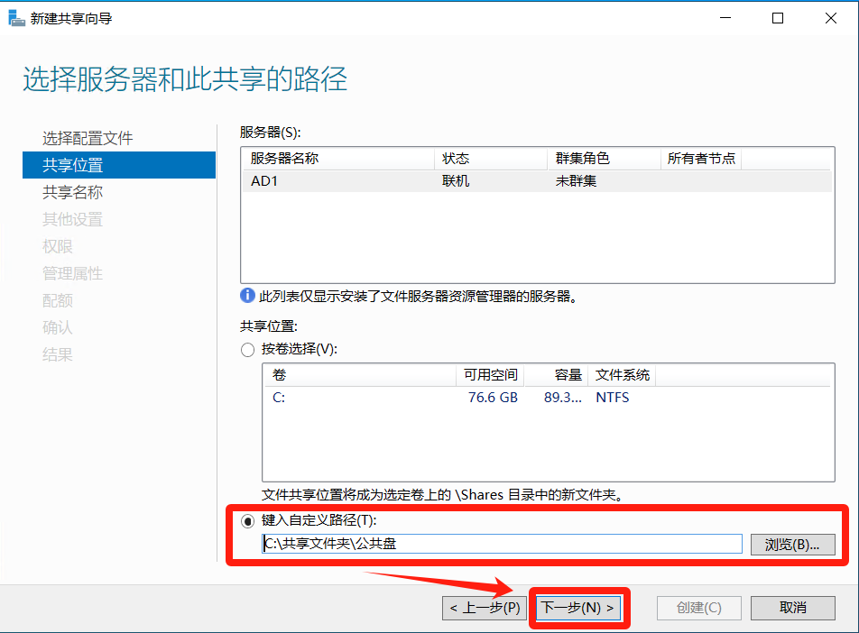 在键入自定义路径上选择公共盘文件夹,点击下一步。