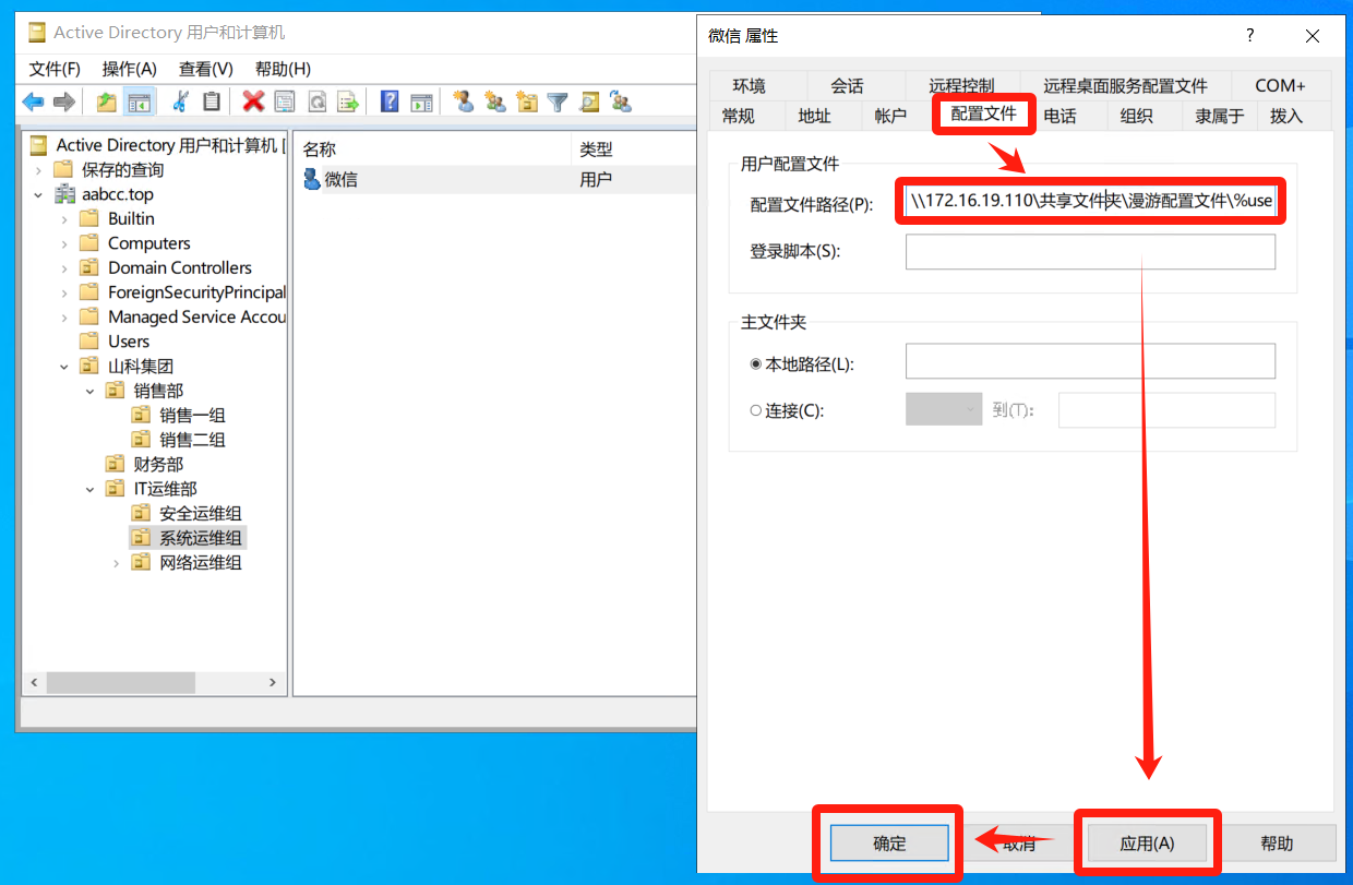 在用户属性--配置文件--用户配置文件,填写共享文件夹内的漫游配置文件夹的路径。