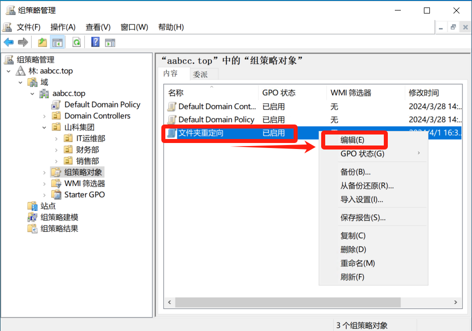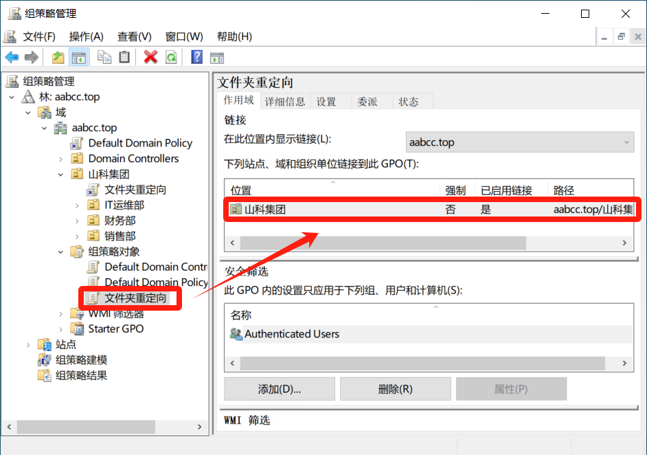 鼠标左键选中配置好的组策略对象:文件夹重定向