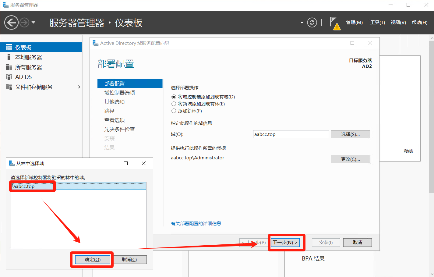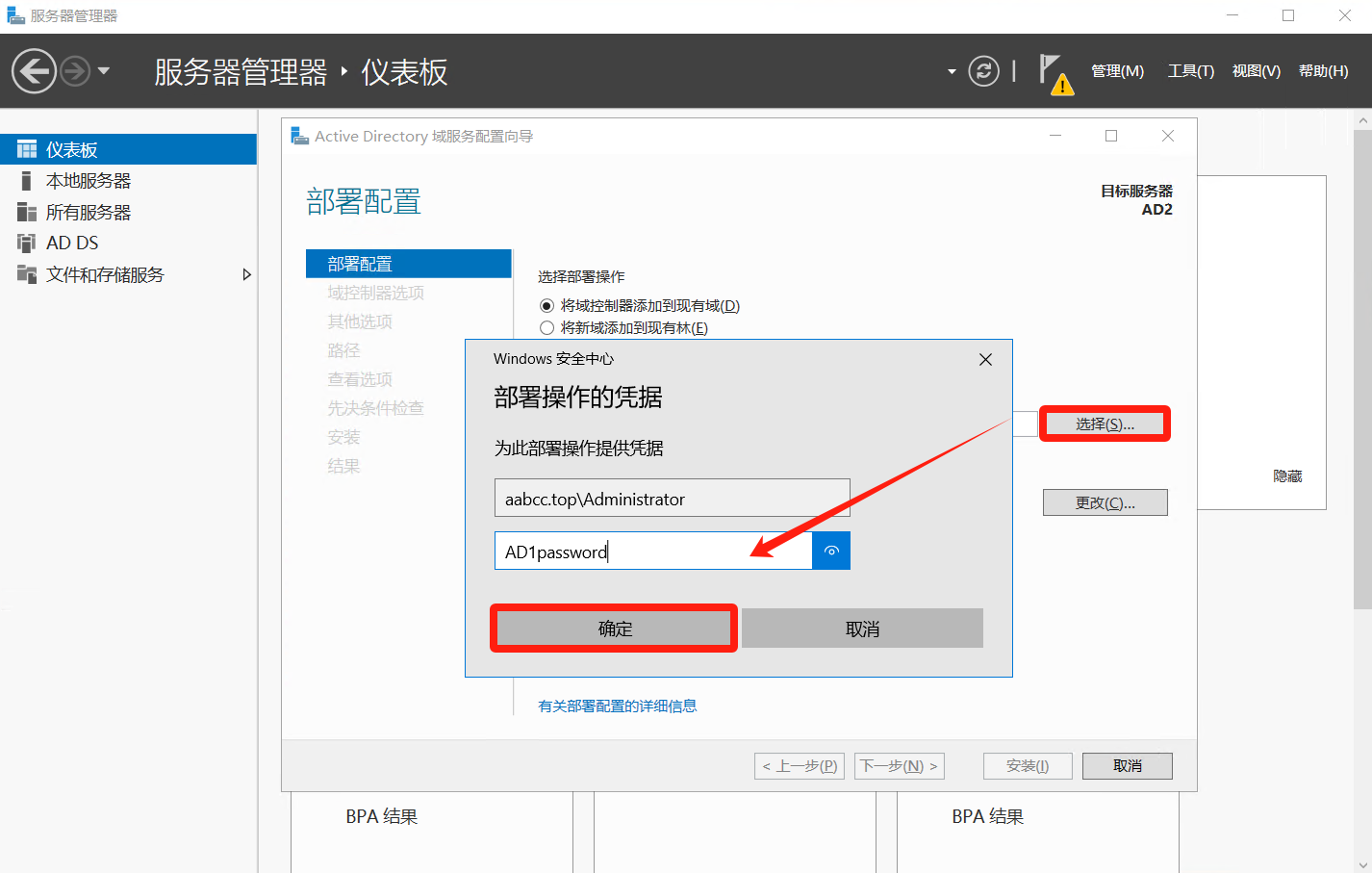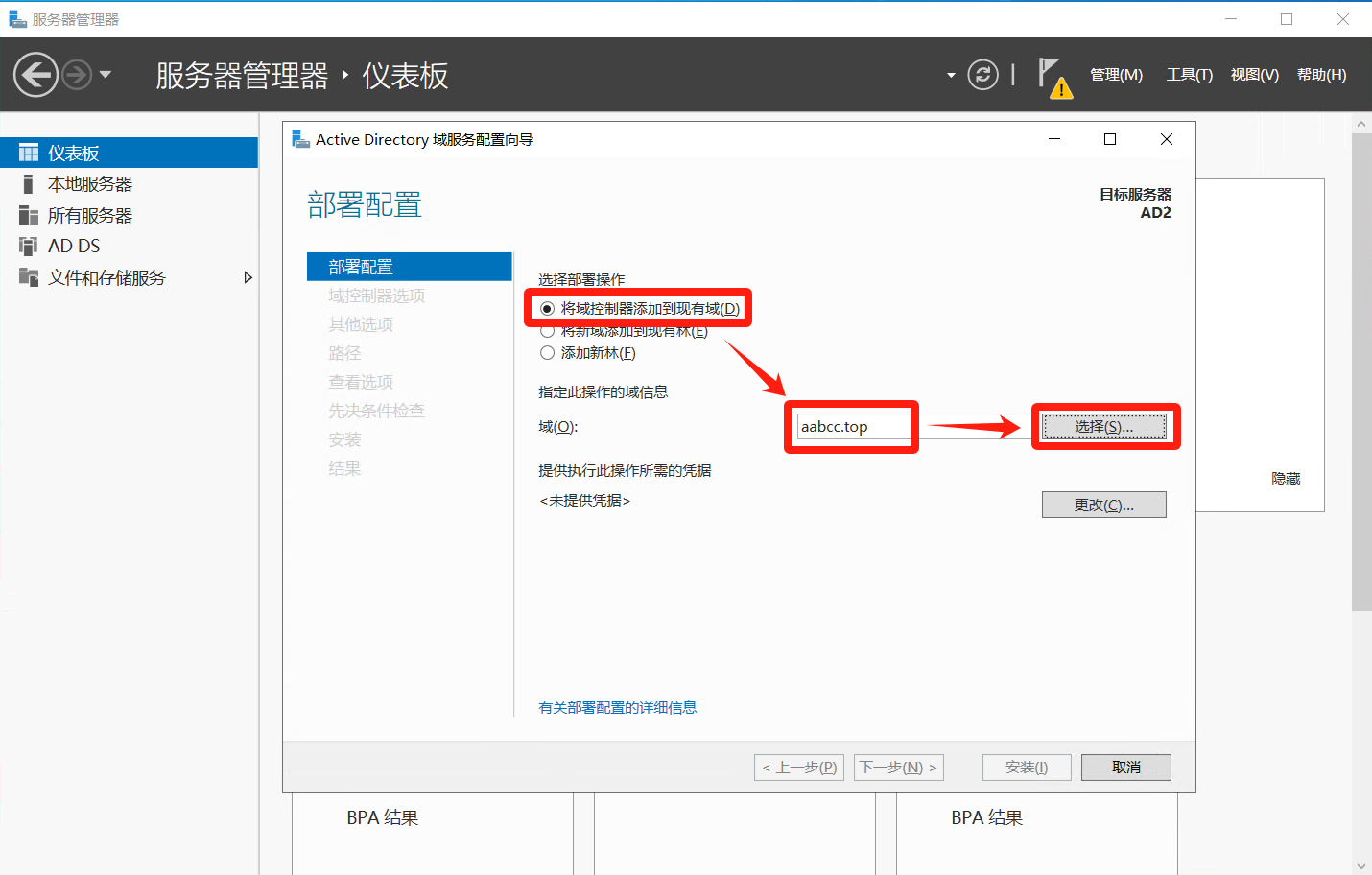 选择将域控制器添加到现有域,输入根域名,然后点击选择。