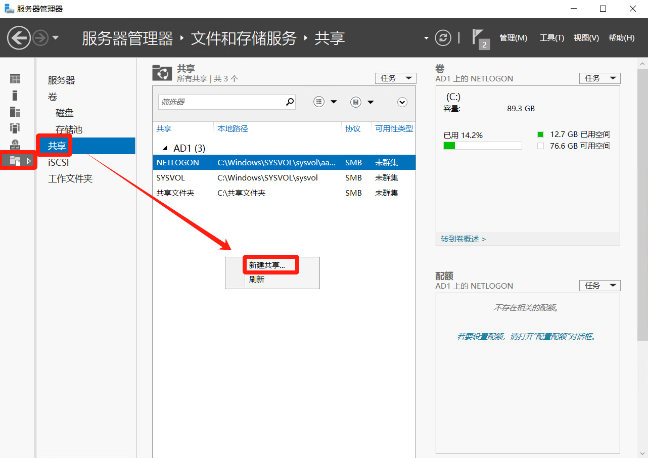 在服务器管理器--文件和存储服务--共享,空白区域右键点击新建共享。