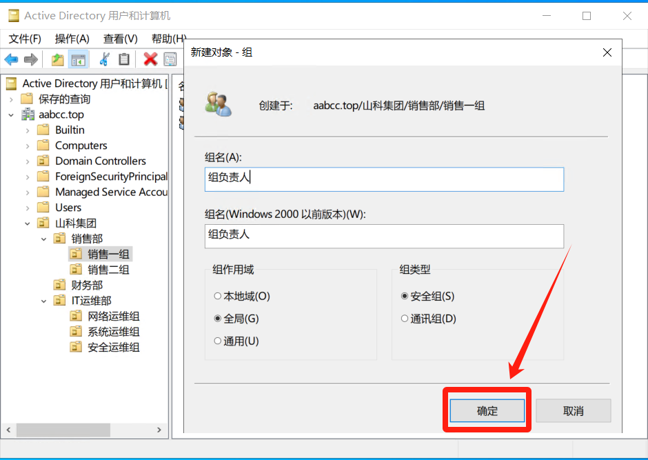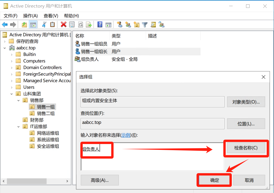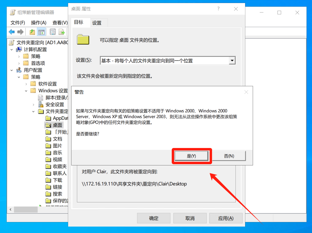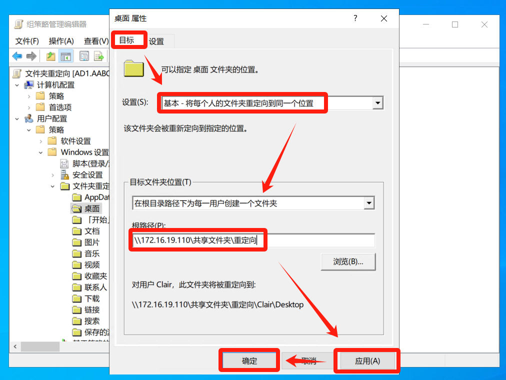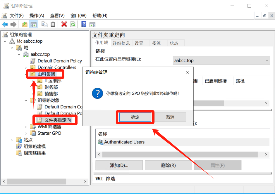 将文件夹重定向按住拖到OU域/OU域内的组,点击确定。