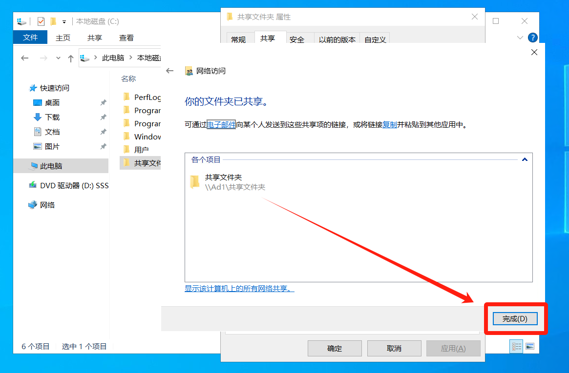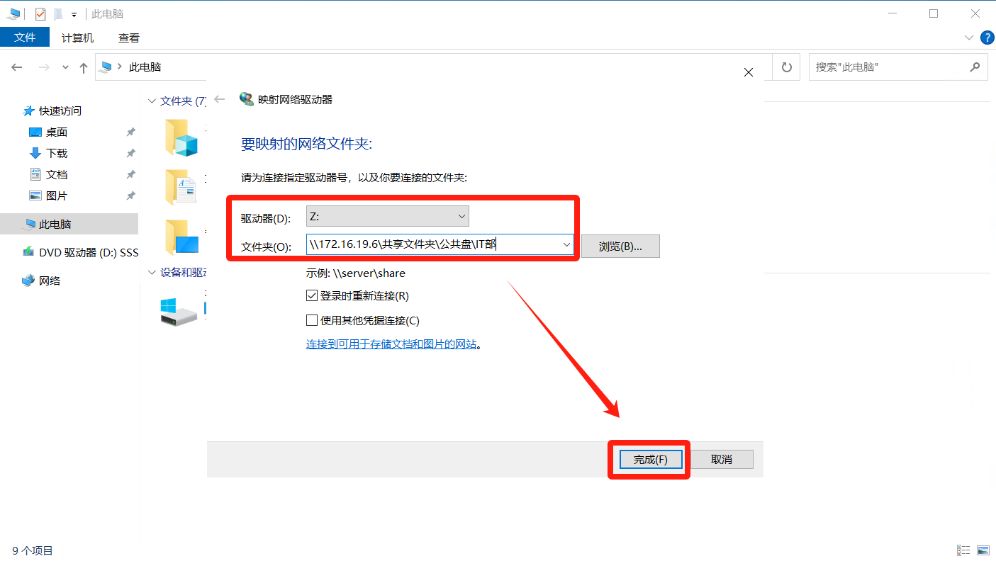 选择一个驱动器,然后输入共享文件夹的路径,点击完成。