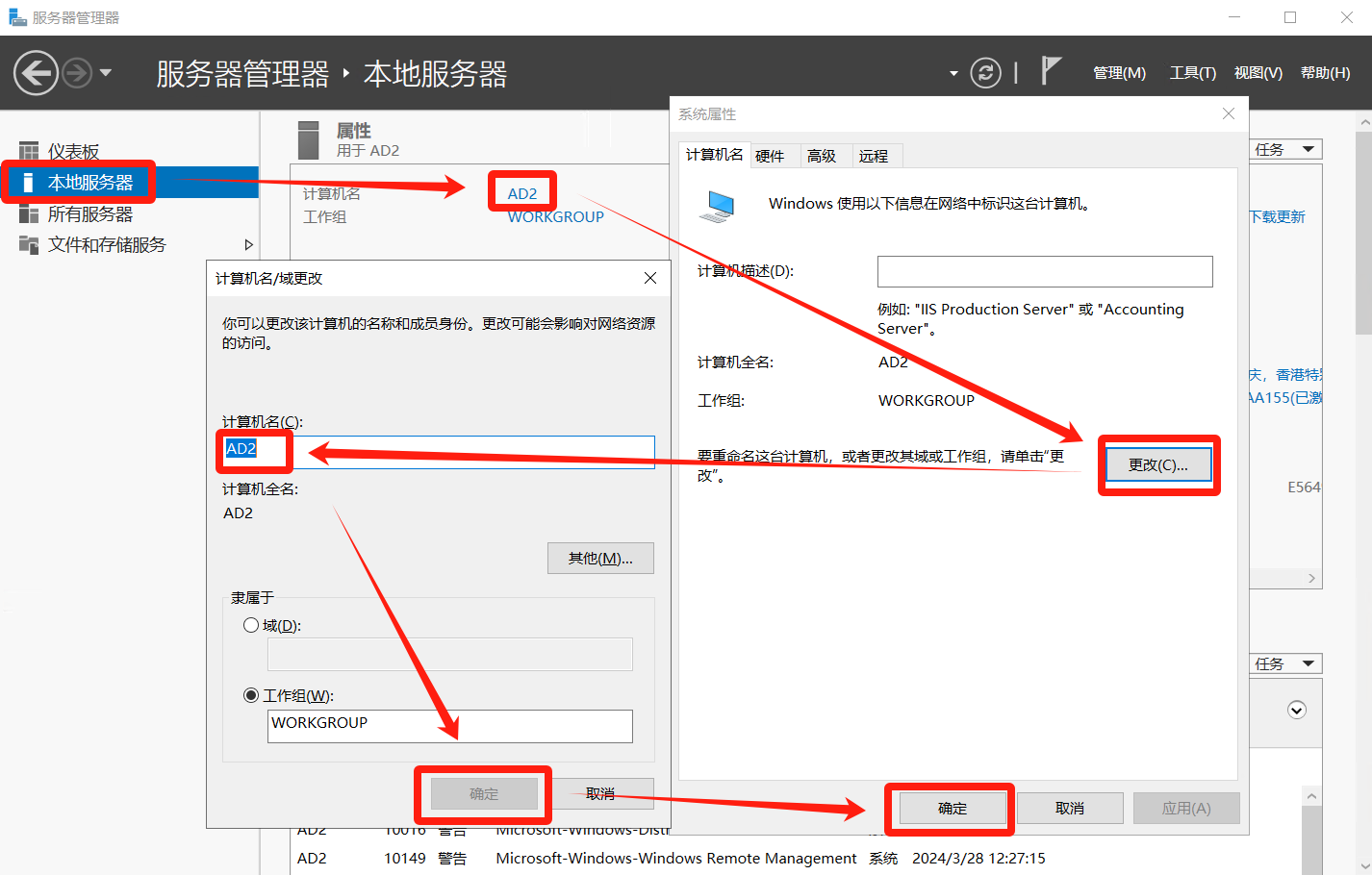 将主AD域服务器的计算机名改成AD2,并按要求重启系统。