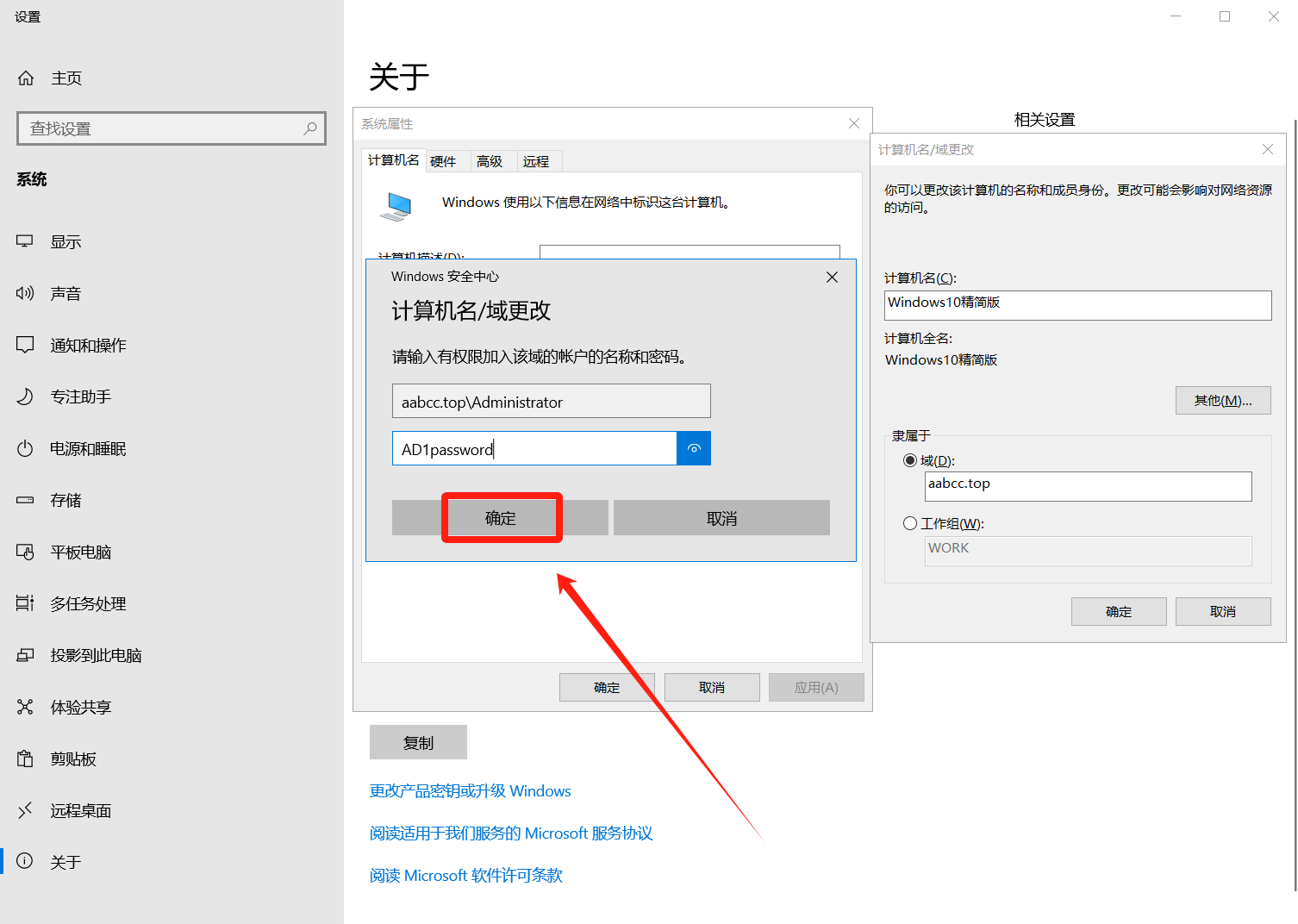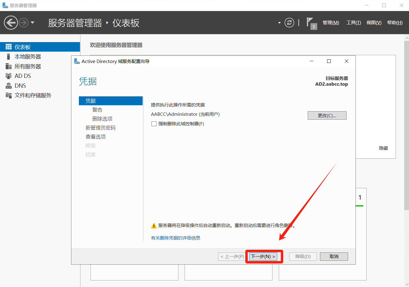 重新登录时使用的就是AD1域服务器的登录密码(aabcc.top\Administrator AD1password)