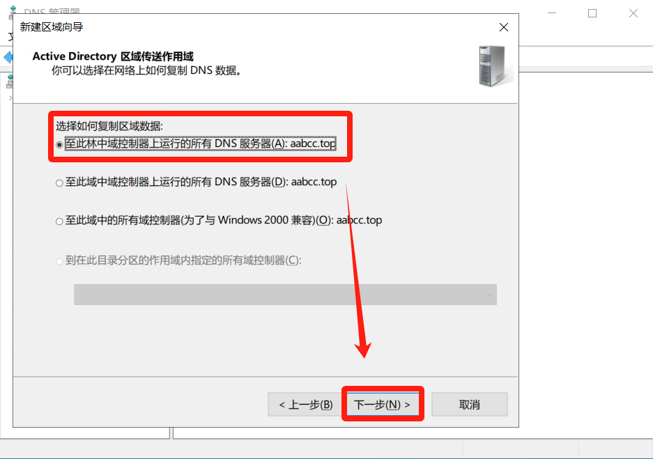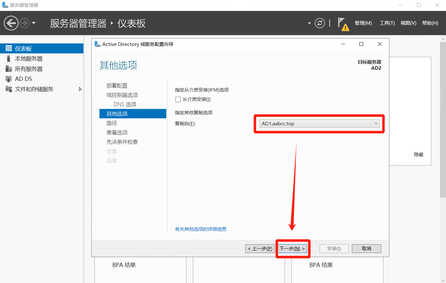 指定其他复制选择,复制自,选择主AD域服务器,然后点击下一步。