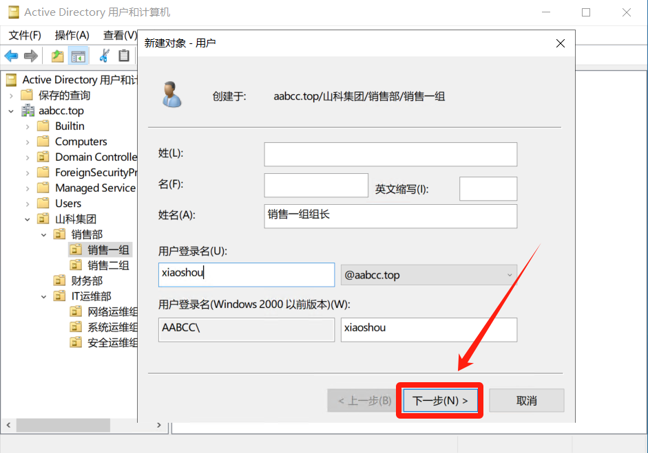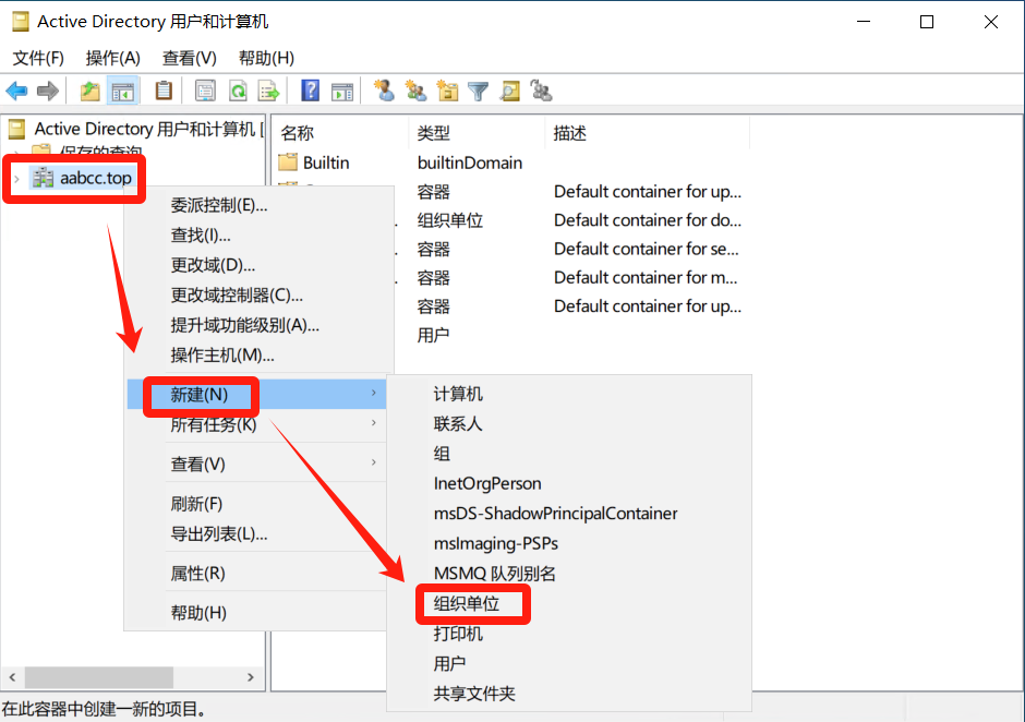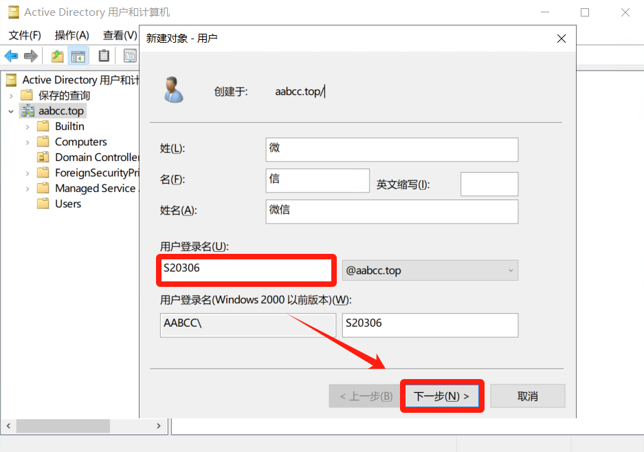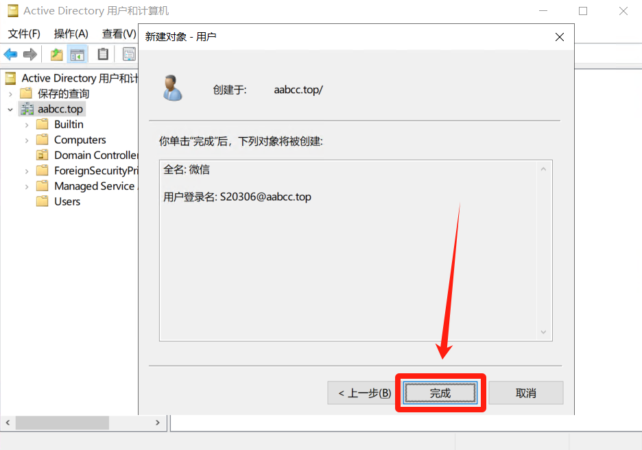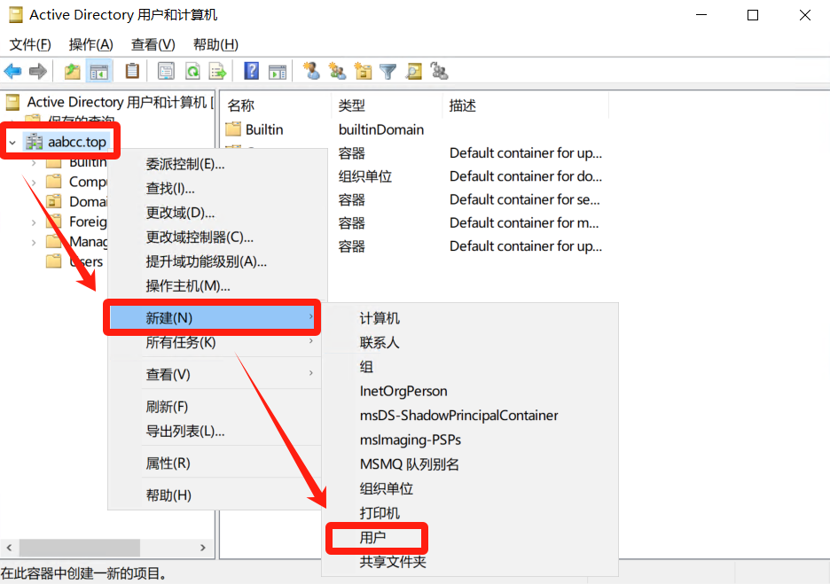打开Active Directory用户和计算机--根域名--右键--新建--用户