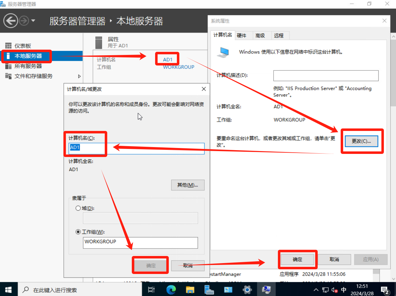 将主AD域服务器的计算机名改成AD1,并按要求重启系统。