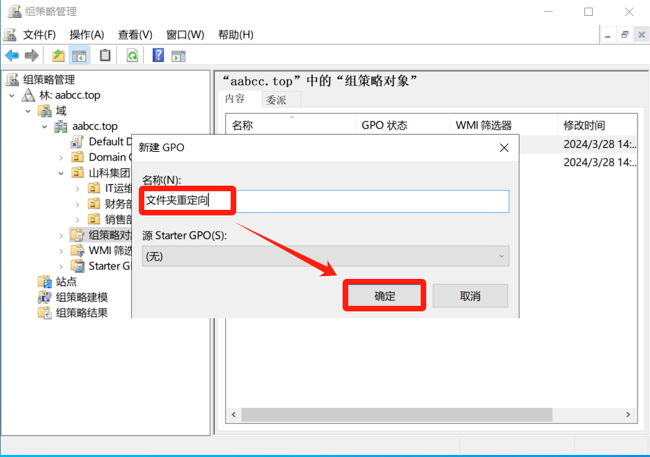 新建一个名为:文件夹重定向 的GPO,然后点击确定。