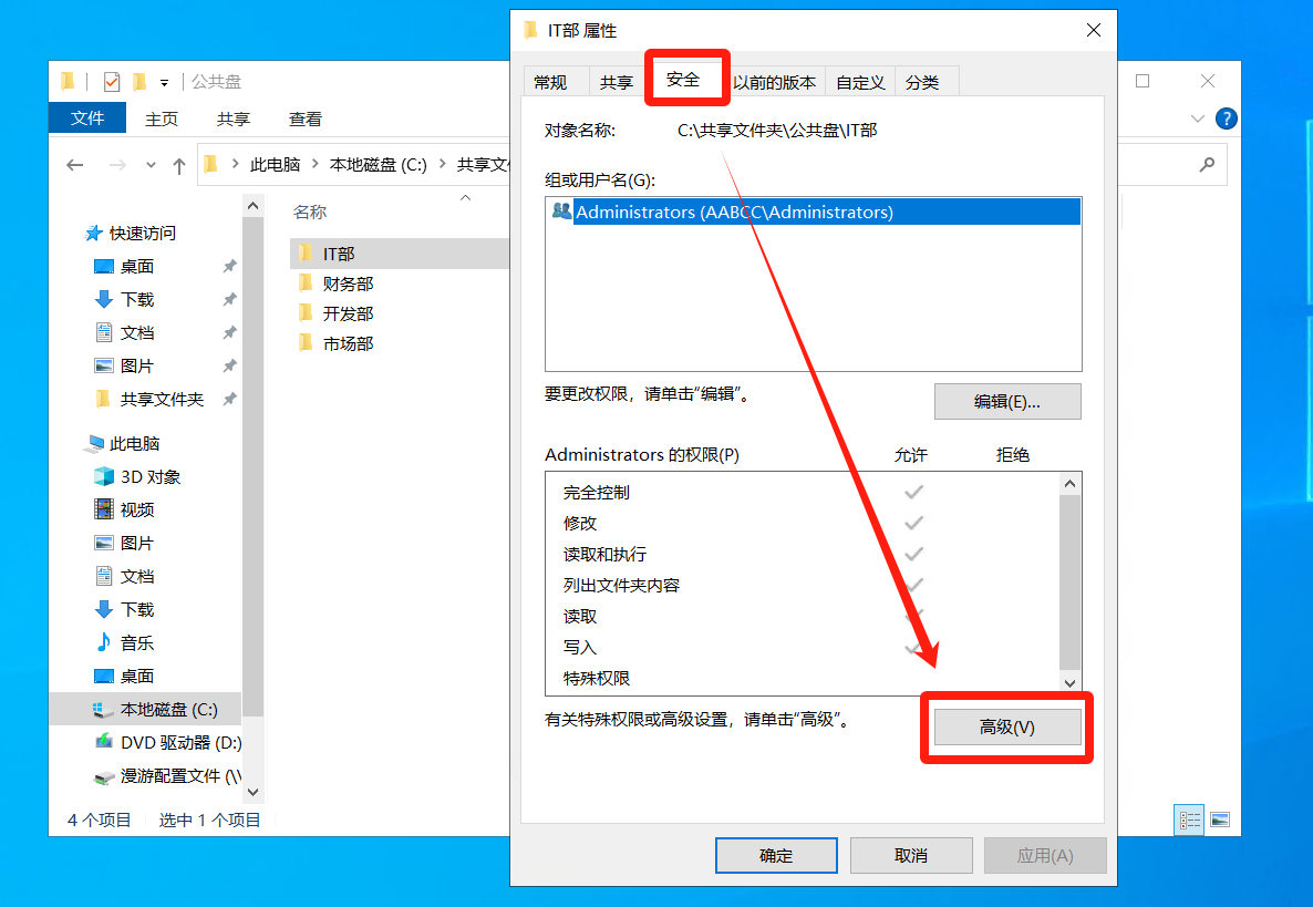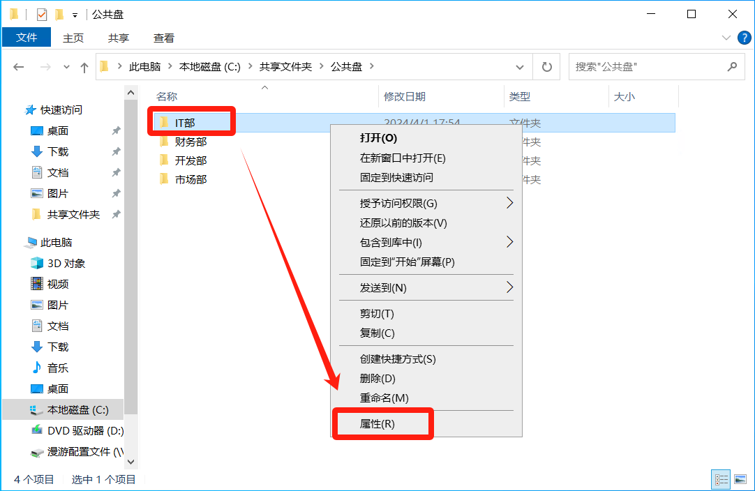 在公共盘文件夹内创建所需的部门,选择一个后右键点击属性。