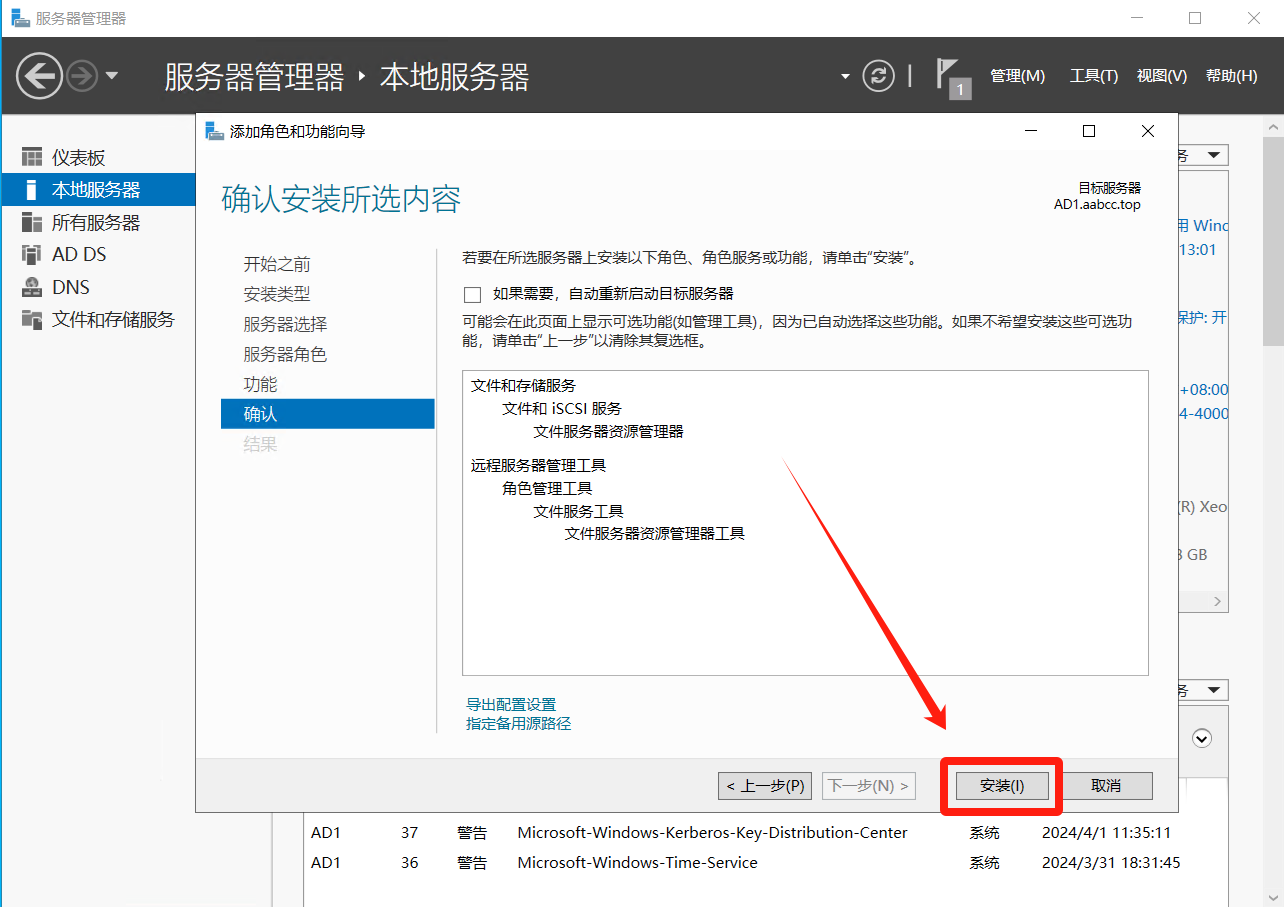 在域控服务器(或者文件服务器)上打开服务器管理器--管理--添加角色和功能
