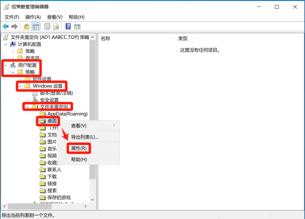 进入到用户配置—策略—Windows设置—文件夹重定向--桌面