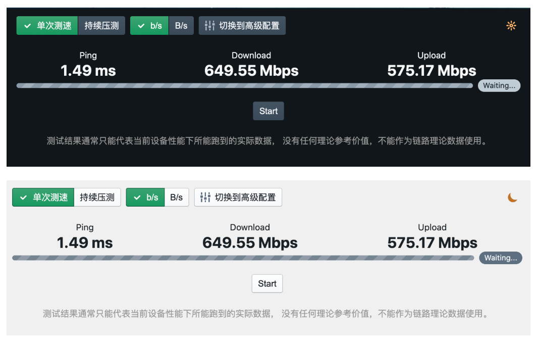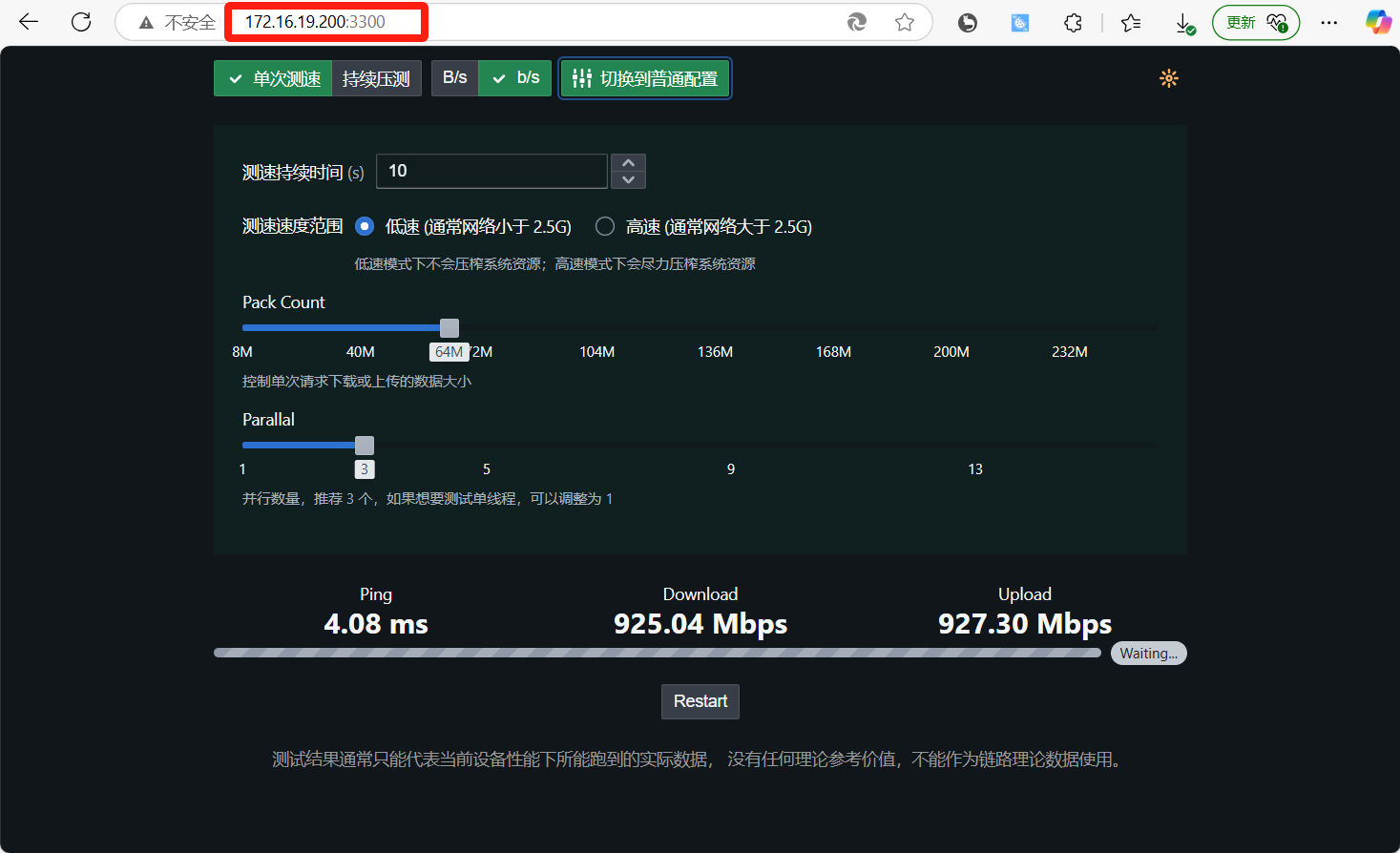默认情况下,设备会以低速模式运行,适用于大部分网络情况。 也可以在高级配置中切换为高速模式,此时会将客户端资源榨干的方式尽可能压榨网络流量,用于万兆以上的高速网络。
