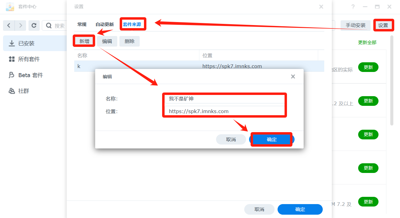 打开群晖套件中心--设置--新增,添加我不是矿神套件源。