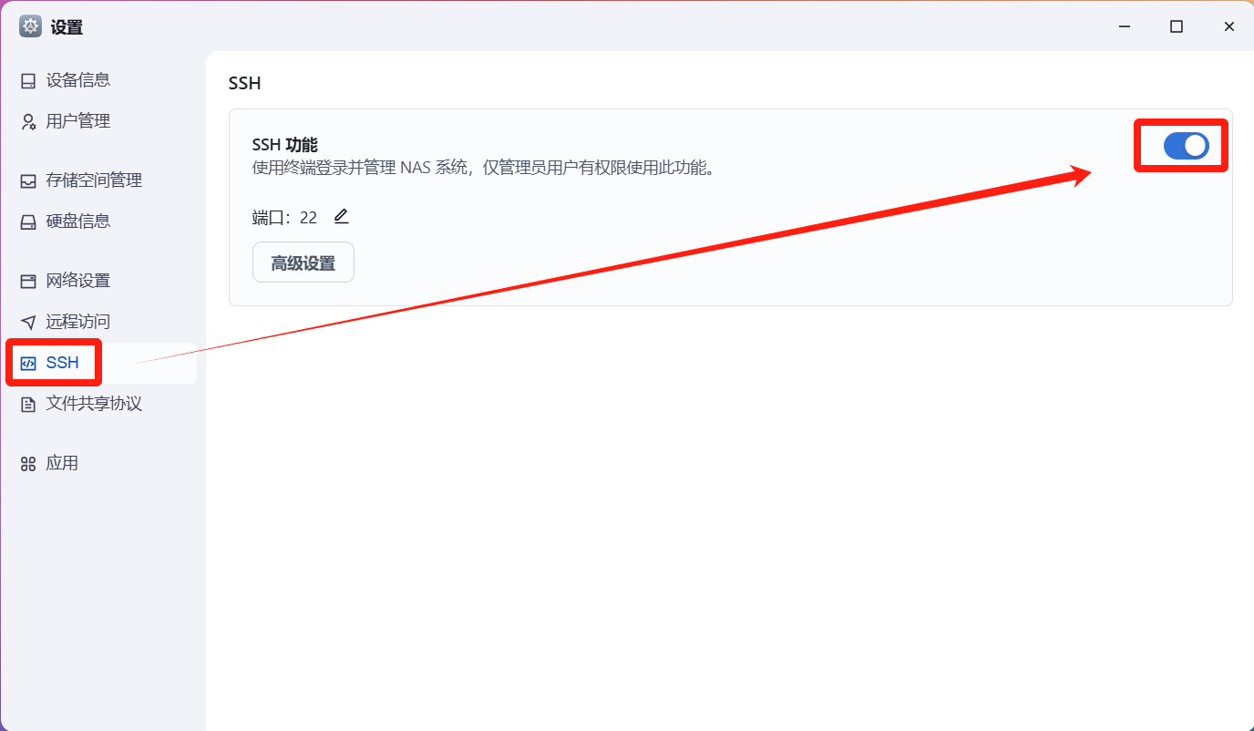打开飞牛NAS系统的设置--SSH,启用SSH功能,并使用终端软件进行连接,切换到root状态下。