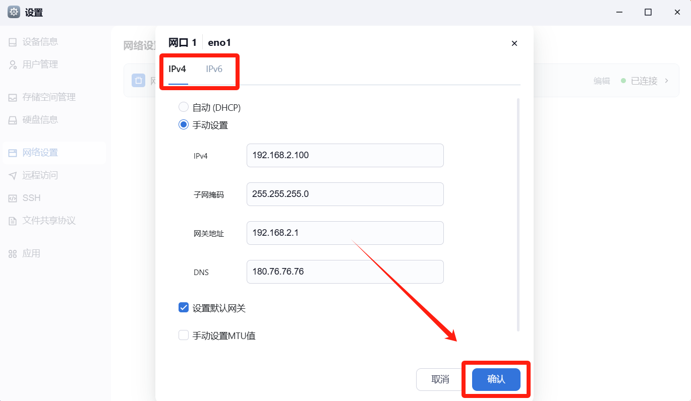 设置IPv4网络为你局域网内未被占用的IP地址(把NAS的IP固定住,避免发生更改。),IPv6设置为自动/DHCP。