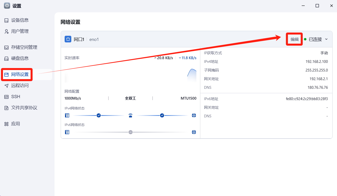 打开飞牛NAS系统的网络设置,点击你使用的网口的编辑。