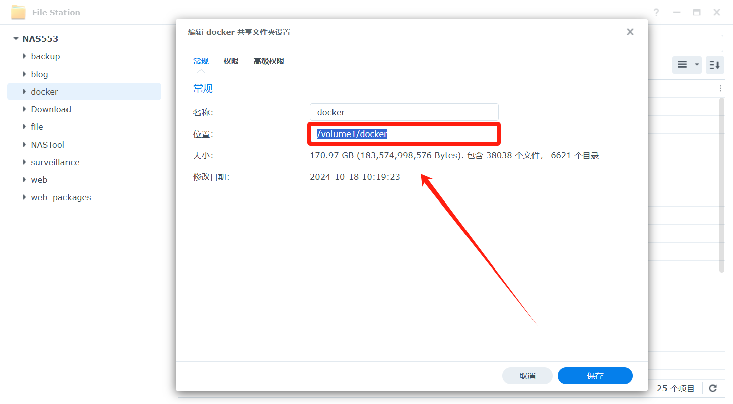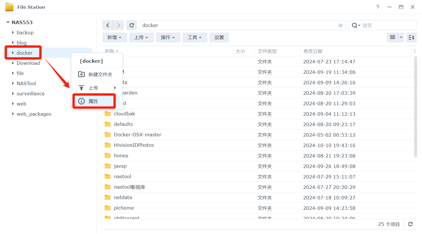 打开群晖的File Station文件管理器,选择docker文件夹,右键选择属性。