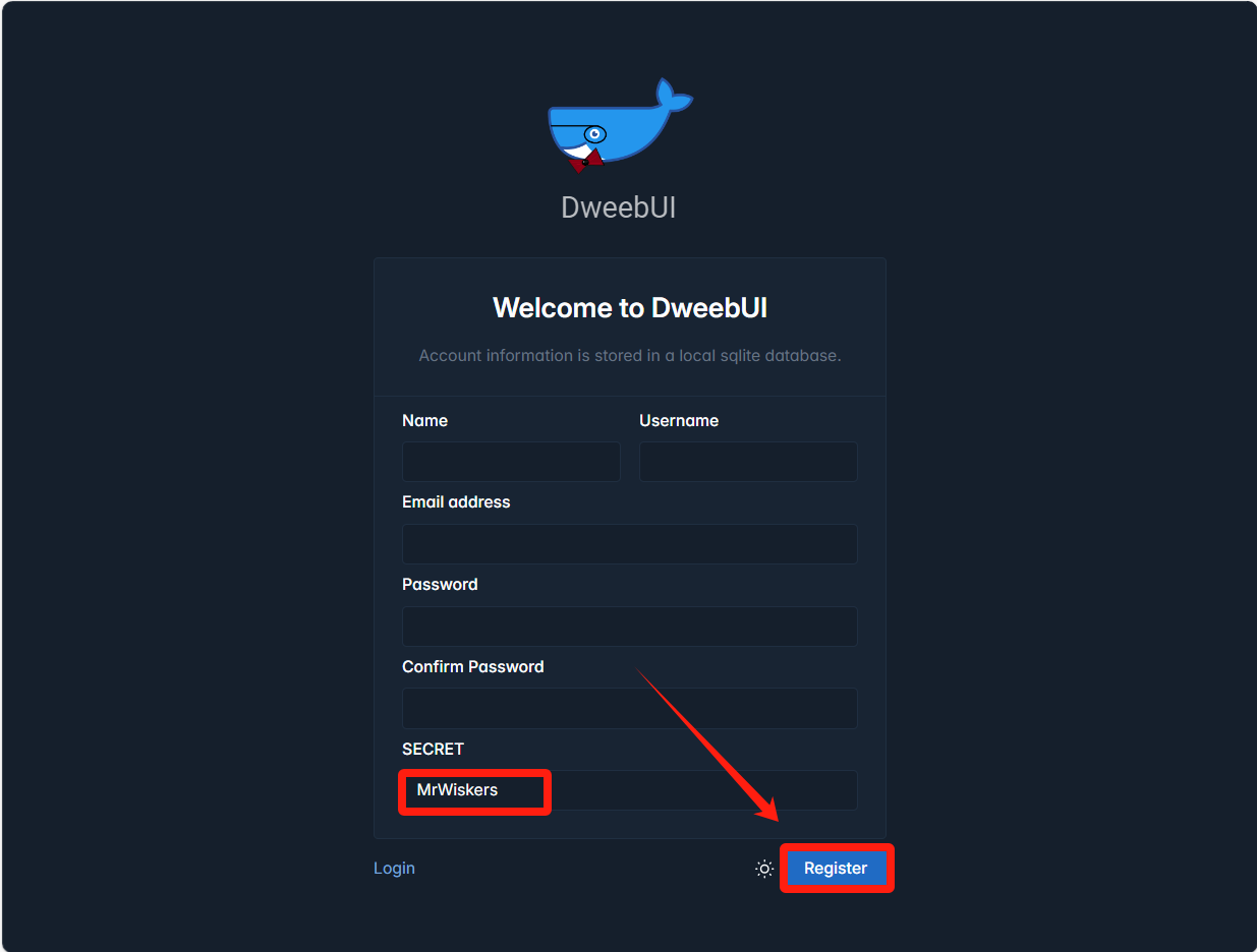 输入你想设置的账户信息,SECRET输入你设置好的密钥,然后点击Register。