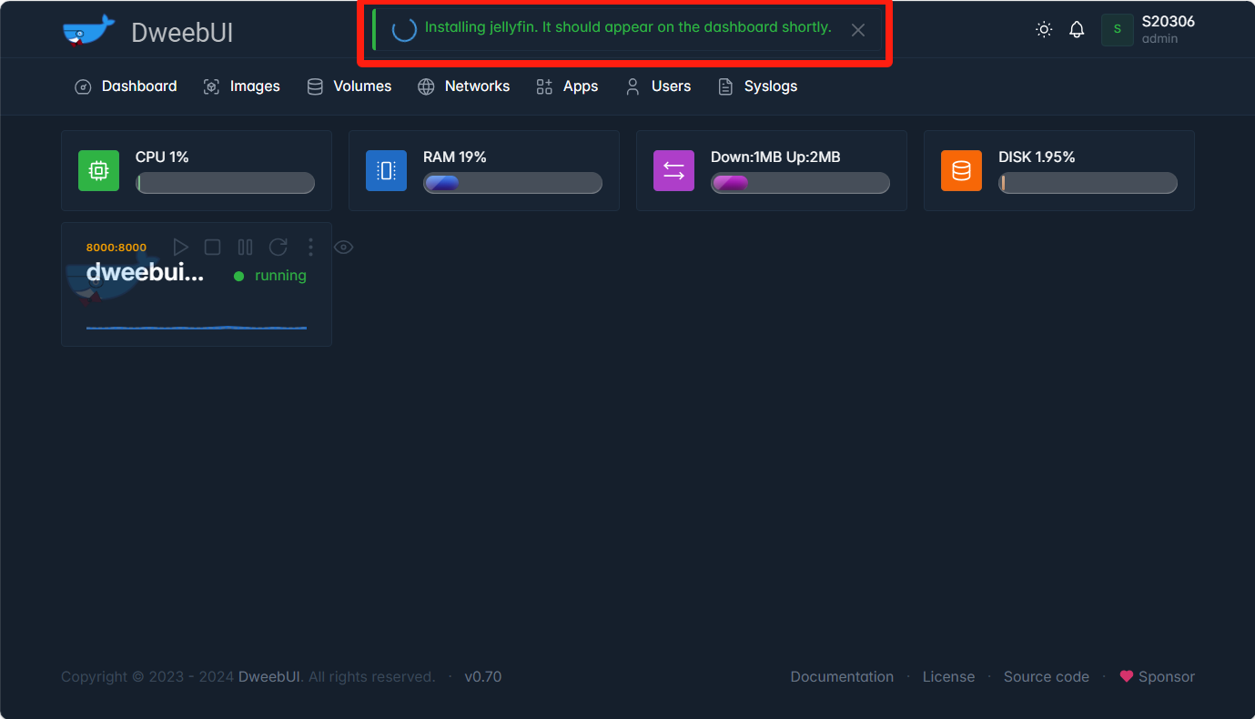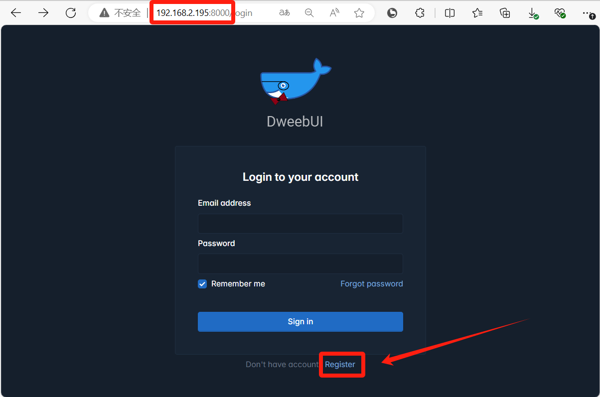version: "3.9" services: dweebui: container_name: dweebui image: lllllllillllllillll/dweebui environment: PORT: 8000 SECRET: MrWiskers # MrWiskers 类似于邀请码,在注册用户时需要填写,可以自己修改。 HTTPS: false restart: unless-stopped privileged: true #以特权模式运行(官方无这一条,但考虑项目运行权限问题,就加上了这一个。) ports: - 8000:8000 #第一个8000端口是容器外部访问的端口,可以自己修改。 volumes: - ./config:/app/config #可将./config换成完整的文件夹路径 # Docker socket - /var/run/docker.sock:/var/run/docker.sock # Podman socket #- /run/podman/podman.sock:/var/run/docker.sock #如果你安装了Podman,可以将本行取消注释,没安装不用管。 networks: - dweebui_net volumes: dweebui: networks: dweebui_net: driver: bridge执行命令,启动docker-compose文件,拉取镜像并创建容器。