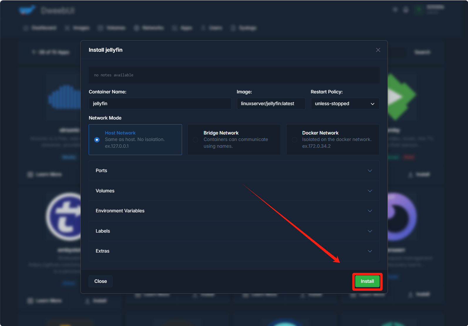 和正常的选项一样,可以进行设置容器的参数,如网络模式、端口、环境变量、存储等等。