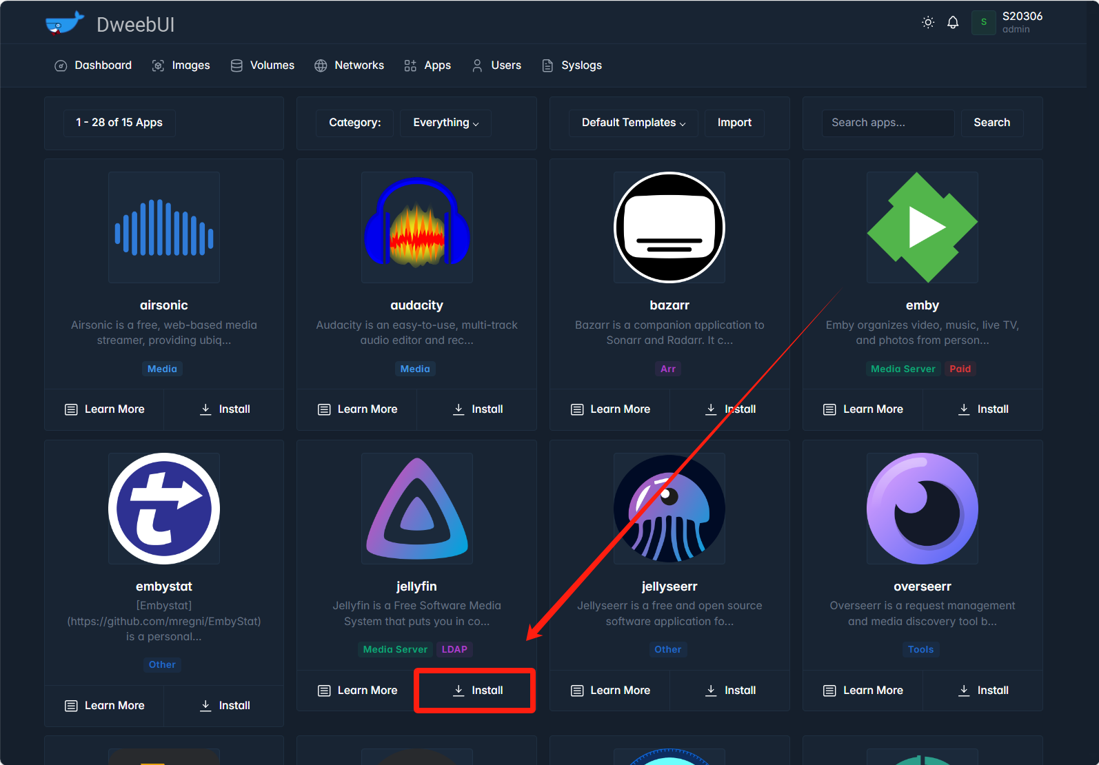 设置好容器的配置后点击Install,如果你的网络可以正常访问Docker Hub的话,安装完容器后会自动显示在Dashboard(首页)界面上。