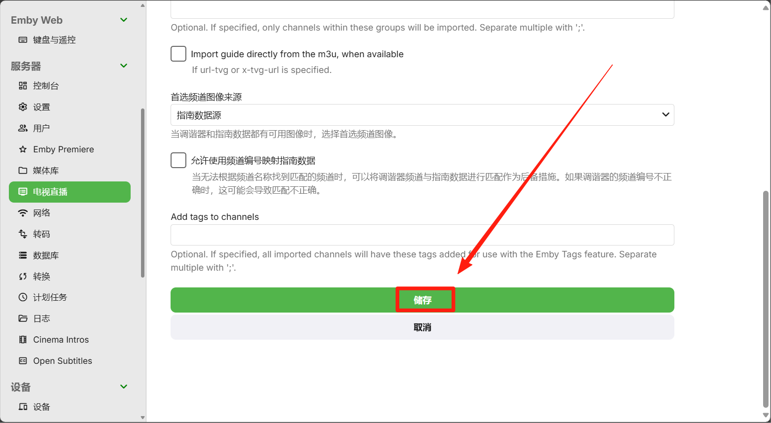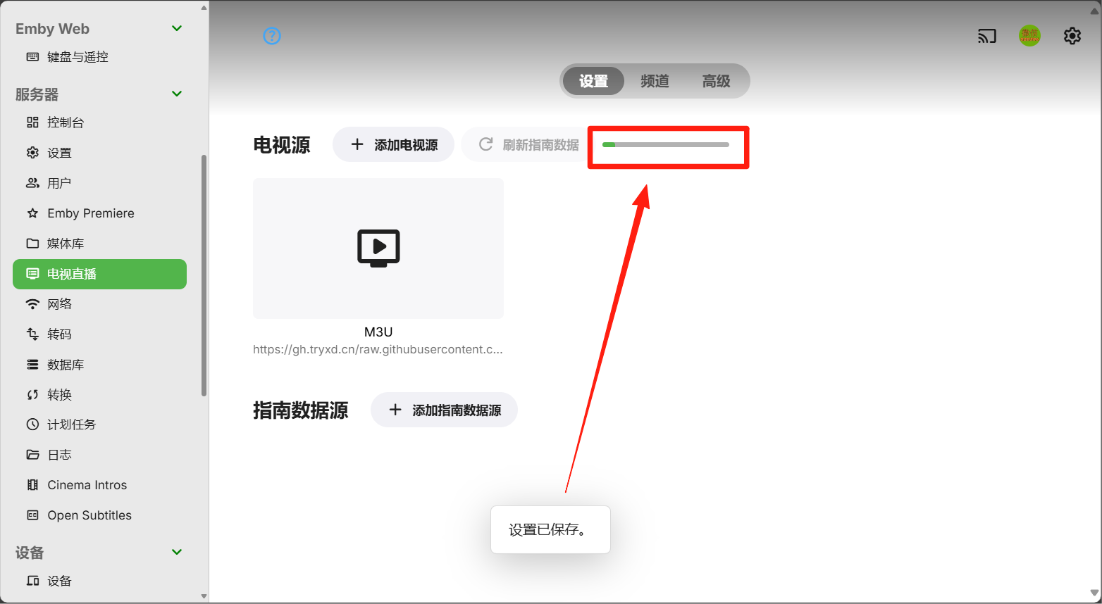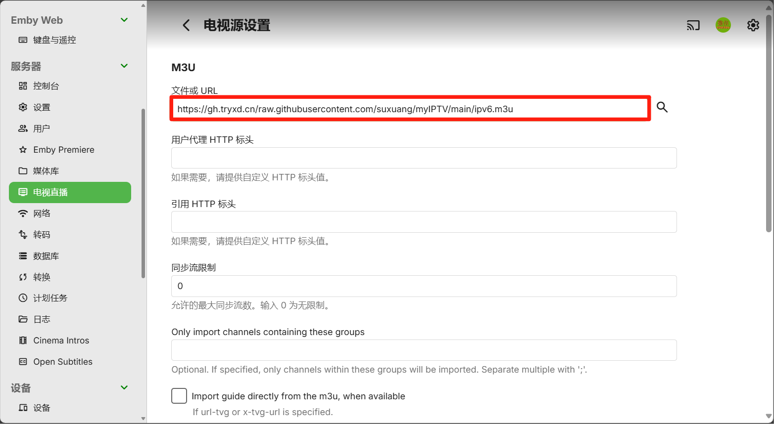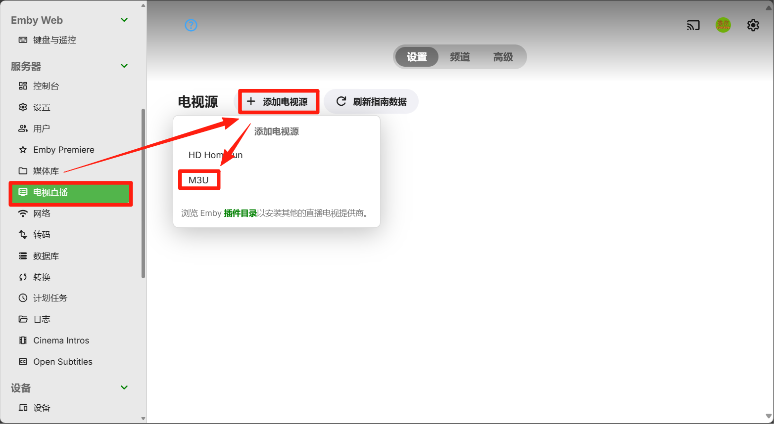打开Emby--服务器--电视直播--添加电视源,选择M3U。