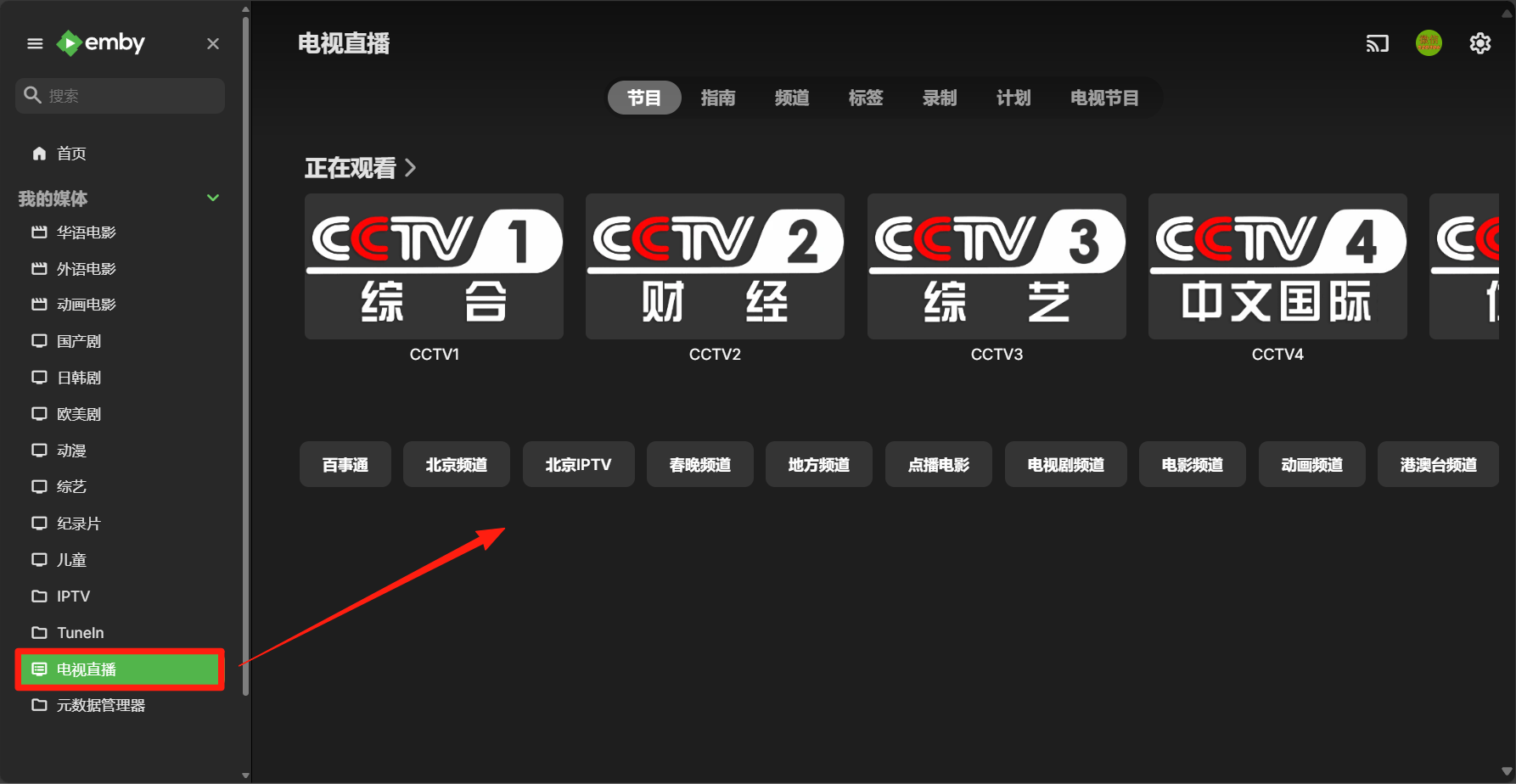 前往Emby的主页,点击电视直播分类,选择你想看的即可。