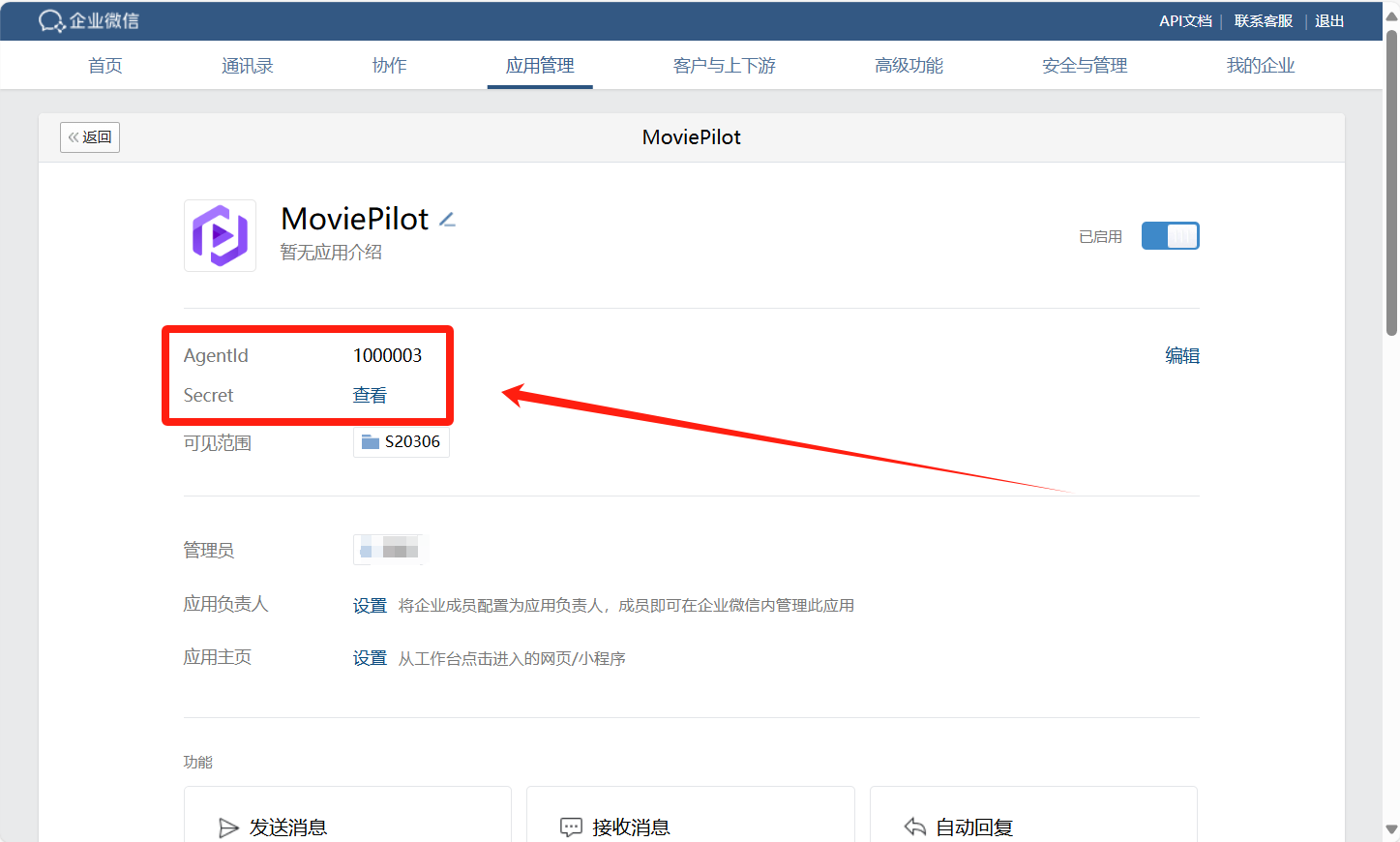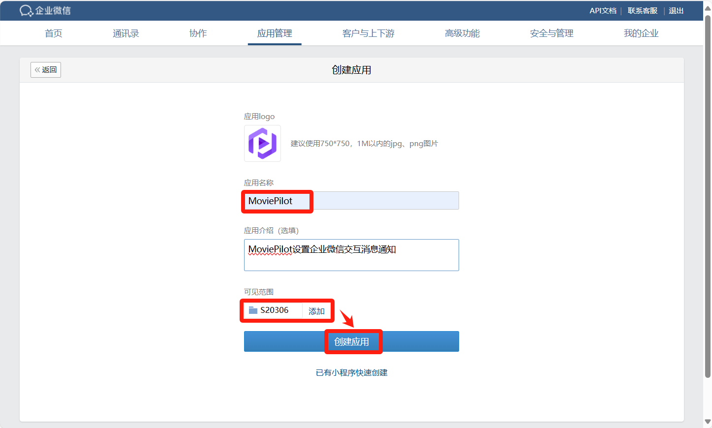 设置企业微信参数并绑定到MoviePilot