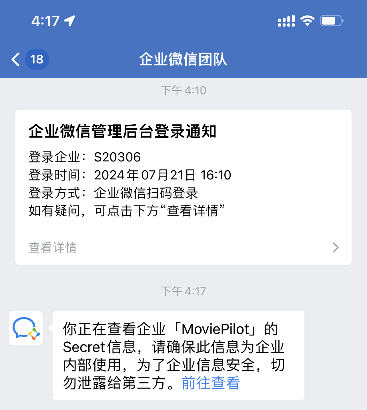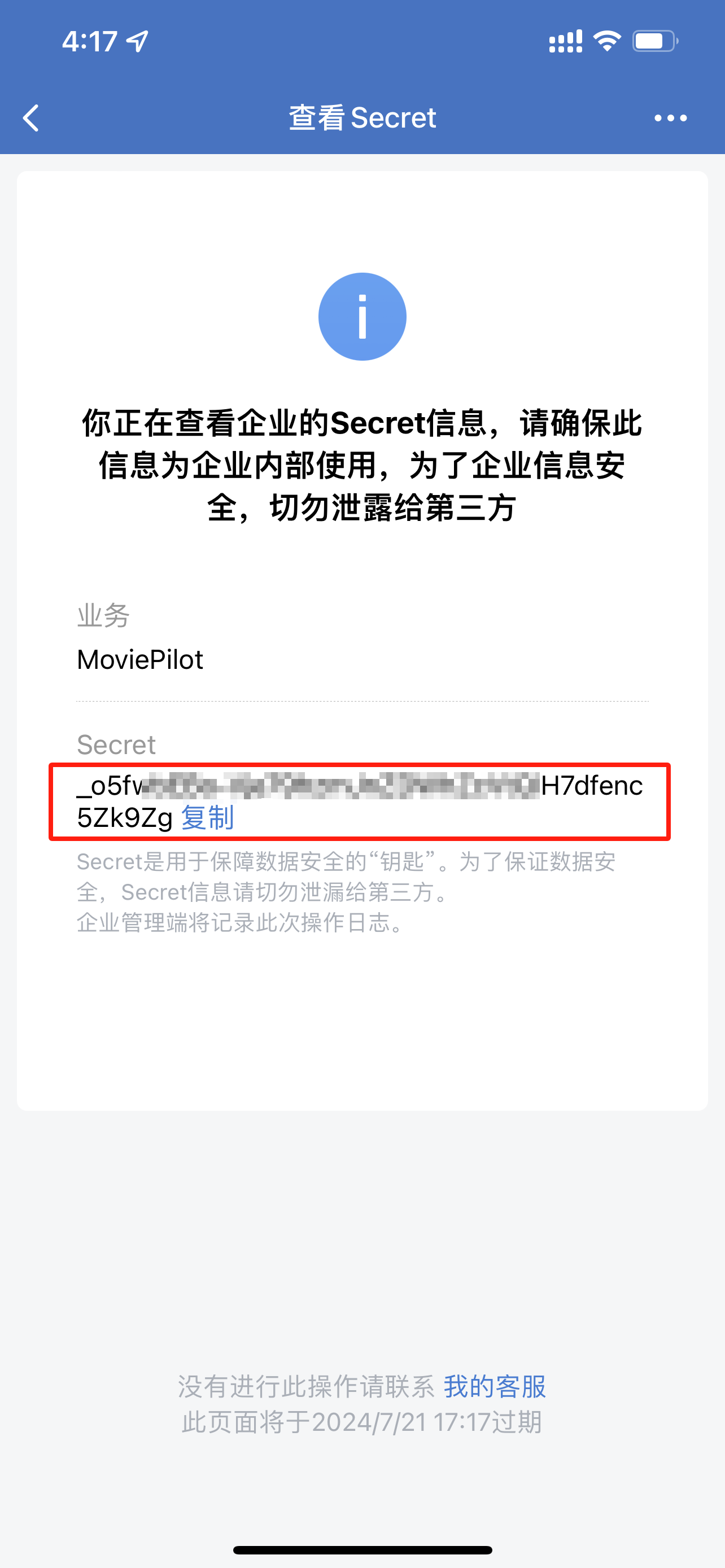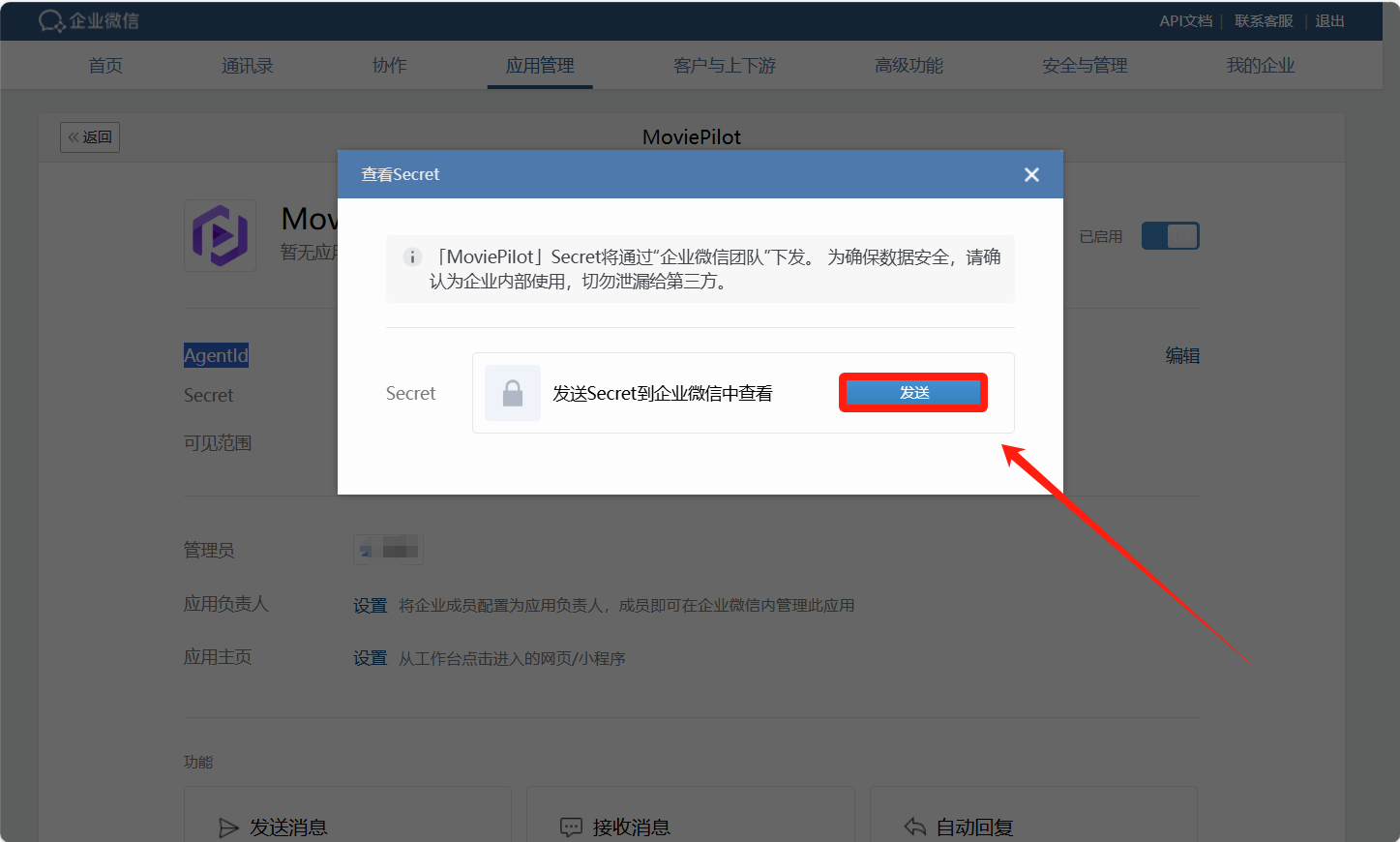 应用Secret 点击查看会提示发送到企业微信中点击发送即可获取