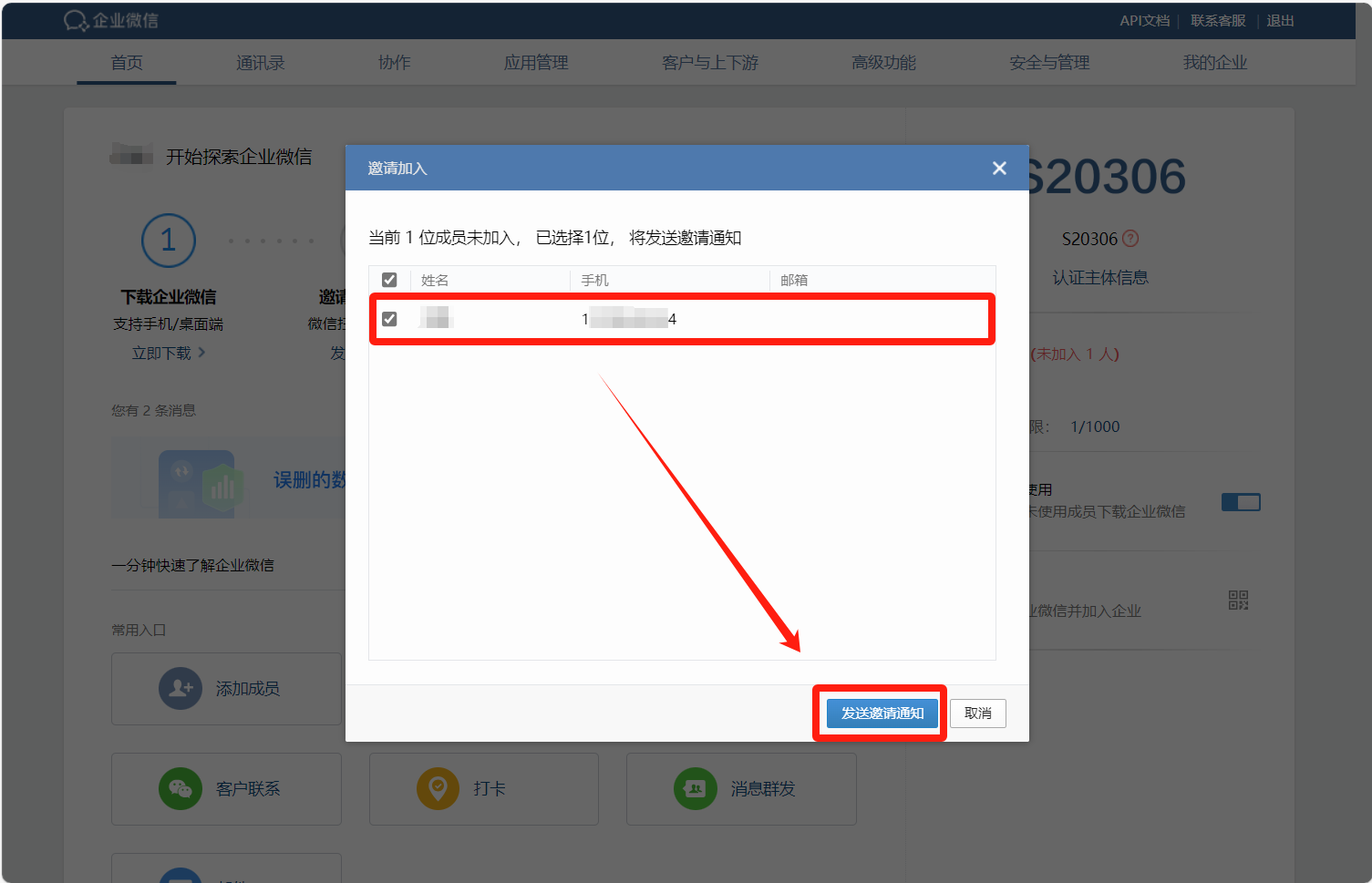 点击发送邀请通知