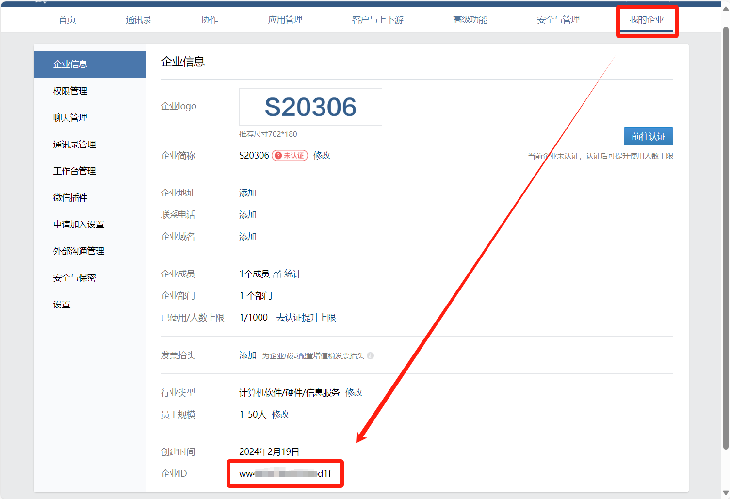 点击右上角我的企业,拉到最下面就可以看到企业ID,记录下来,后面要用。